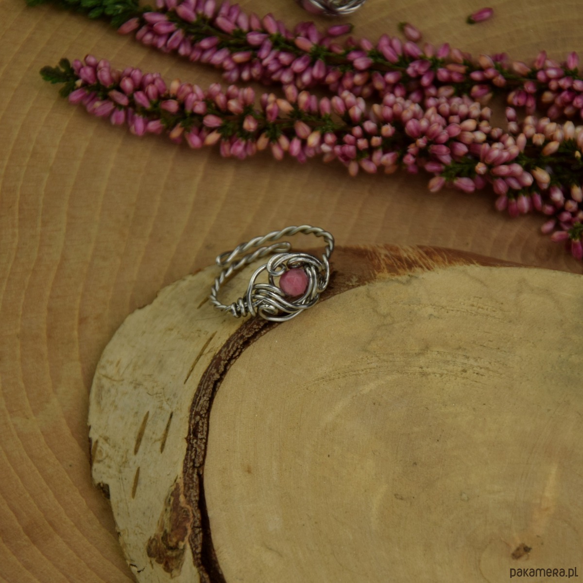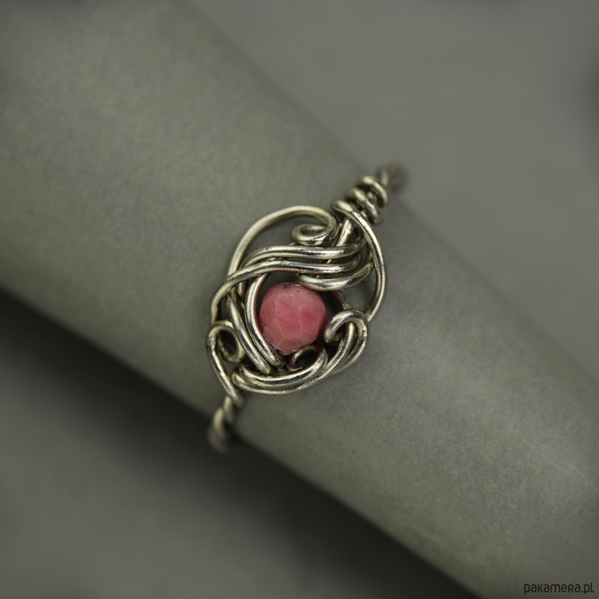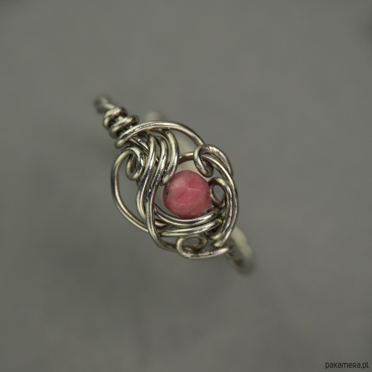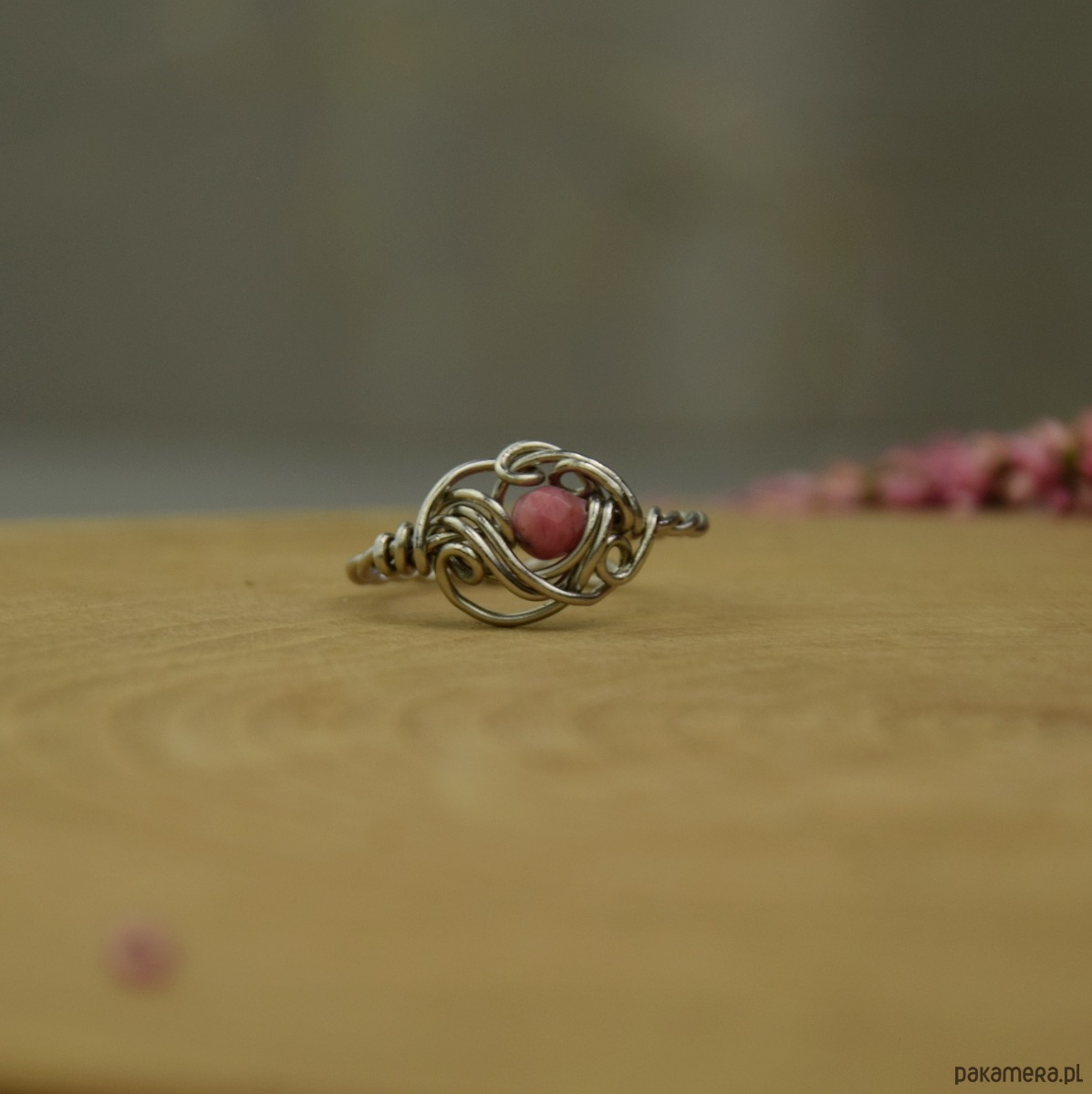 Delikatny, ale efektowny pierścionek z rodonitem, robiony ręcznie techniką wire wrapping z drutów ze stali chirurgicznej.