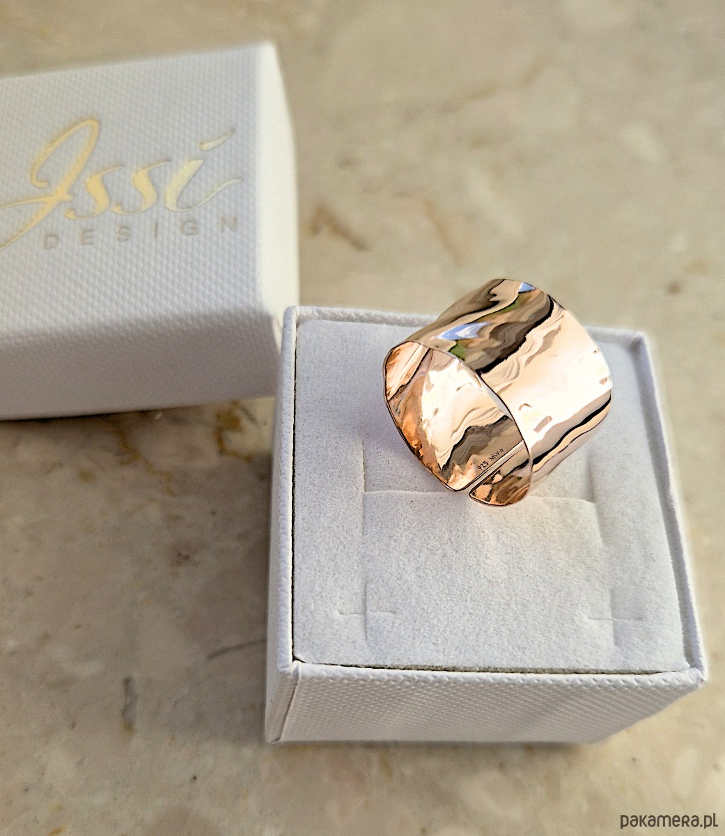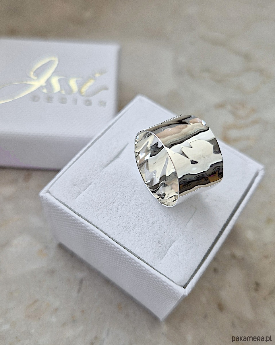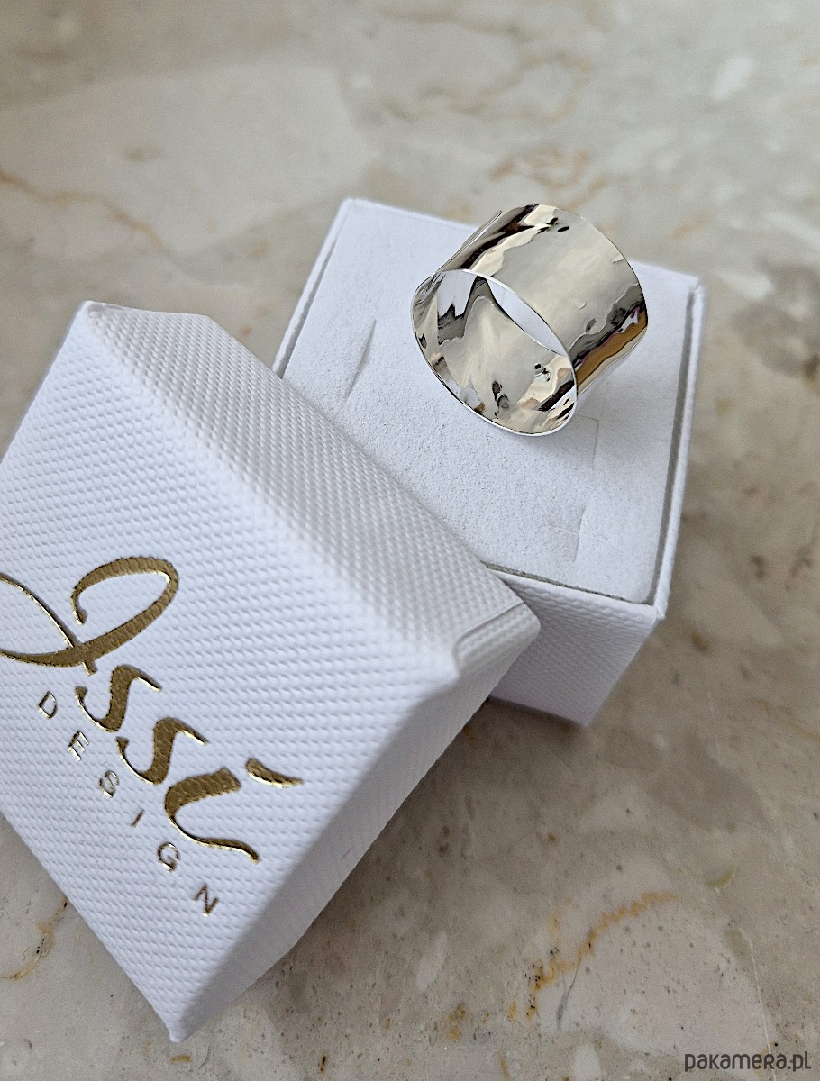 Szeroki pierścionek z pofalowaną powierzchnią, regulowany, uniwersalny rozmiar. Wykonany ze srebra 925, srebra pokrytego 24K złotem lub 18K różowym złotem.