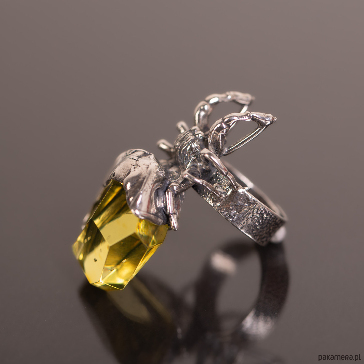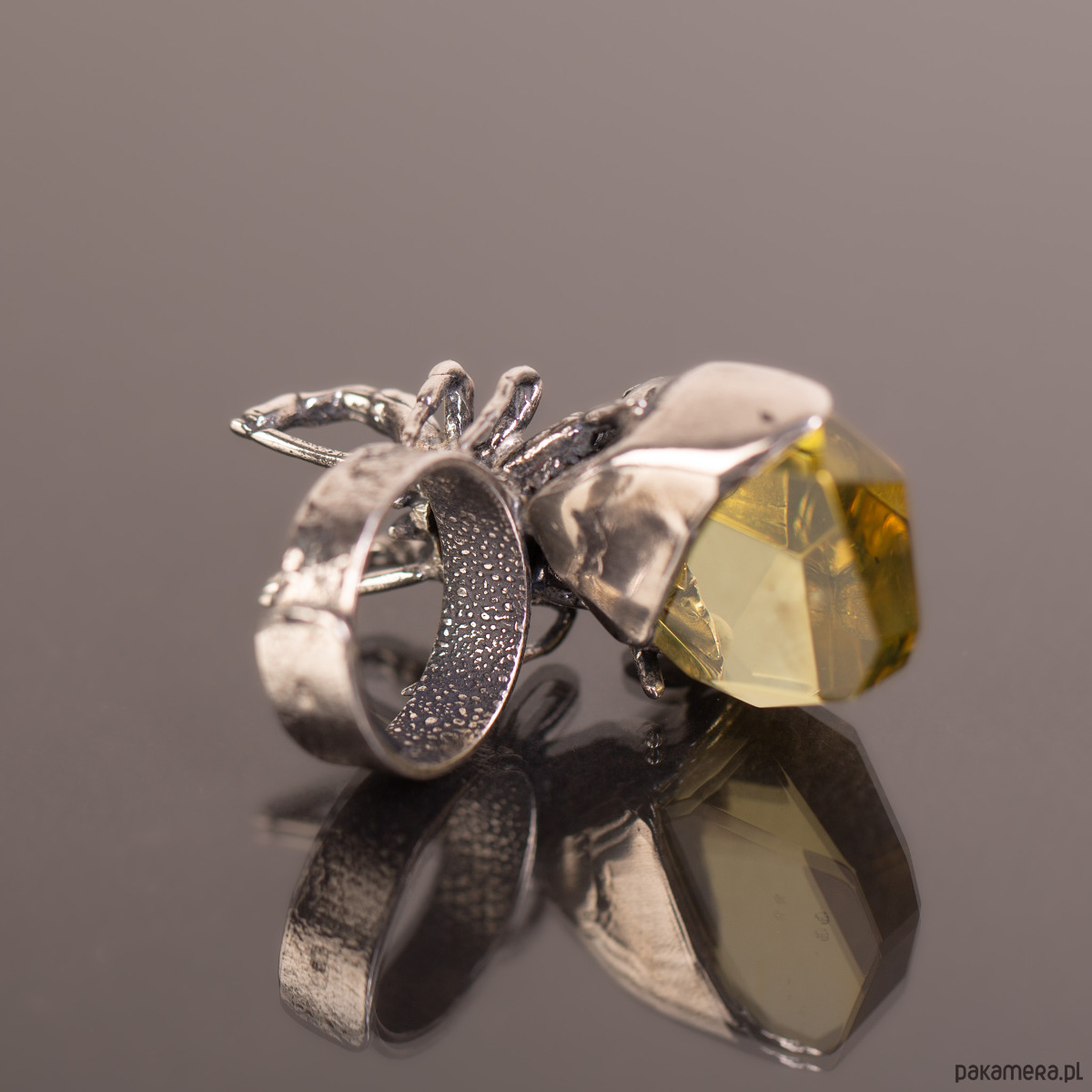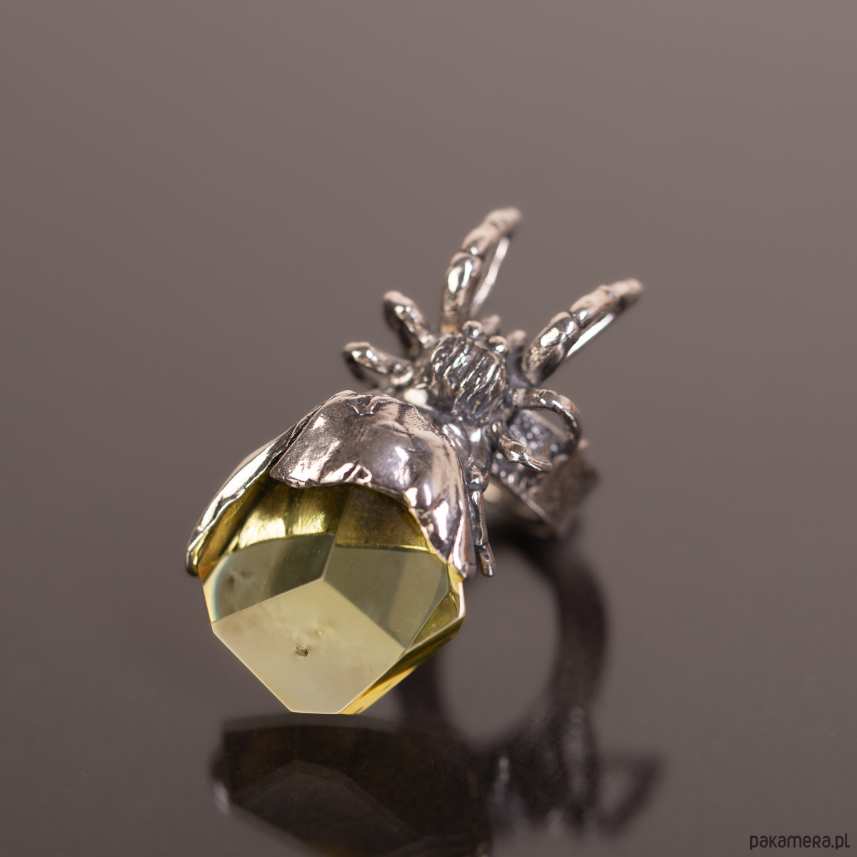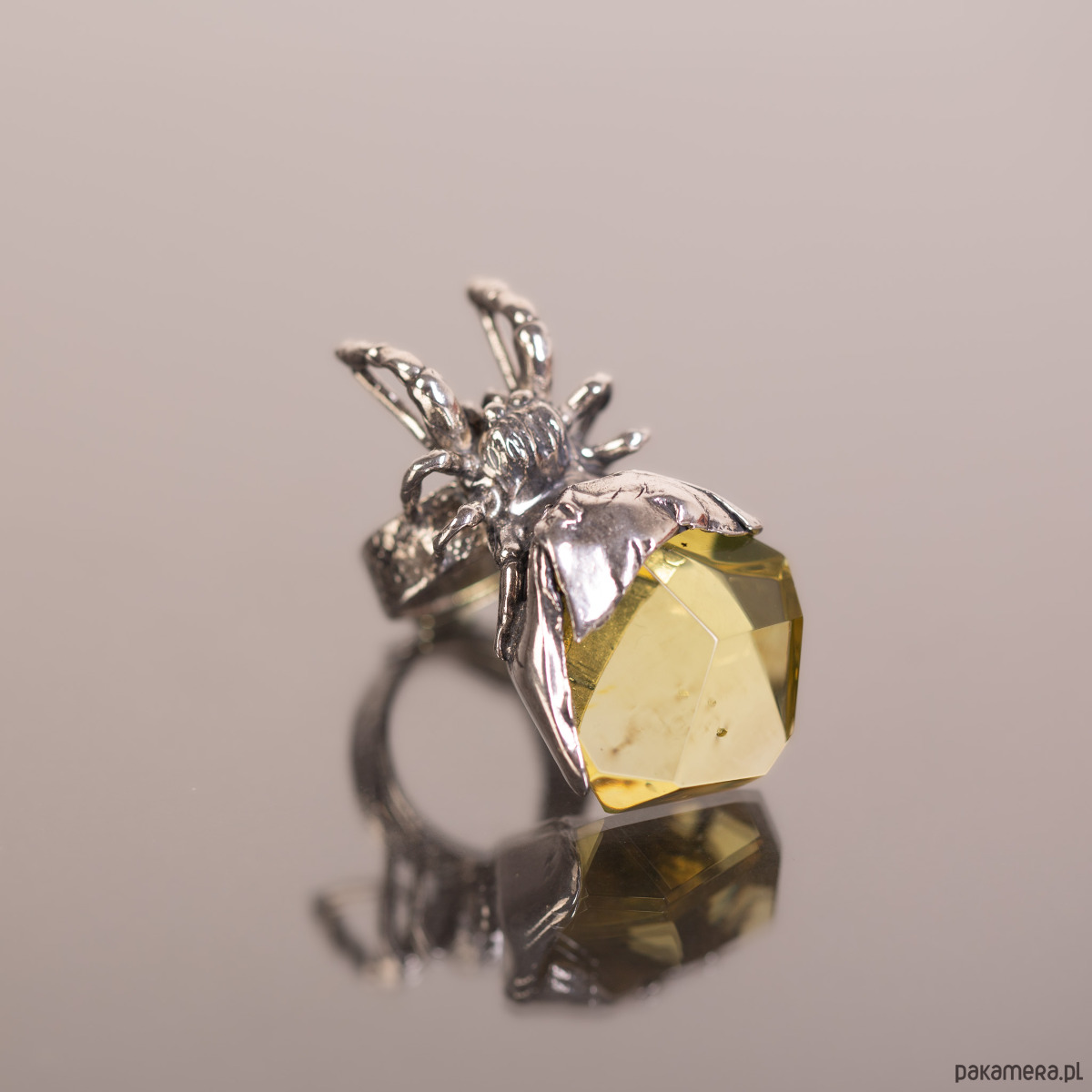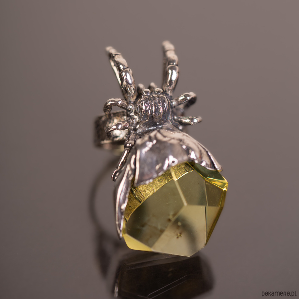 Wyjątkowy, artystyczny pierścionek z miniaturową rzeźbą pająka, który wpasowuje się w fasetowany bursztyn bałtycki. Bursztyn o przezroczystym, jasnym, żółtym odcieniu został precyzyjnie szlifowany, dzięki czemu intensywnie łamie światło. Srebrny pająk, wykonany ręcznie z niezwykłą dbałością o detale, tworzy z bursztynem poetycką, nieco gotycką całość. To biżuteria dla osób, które cenią artystyczną odwagę i rzemiosło.