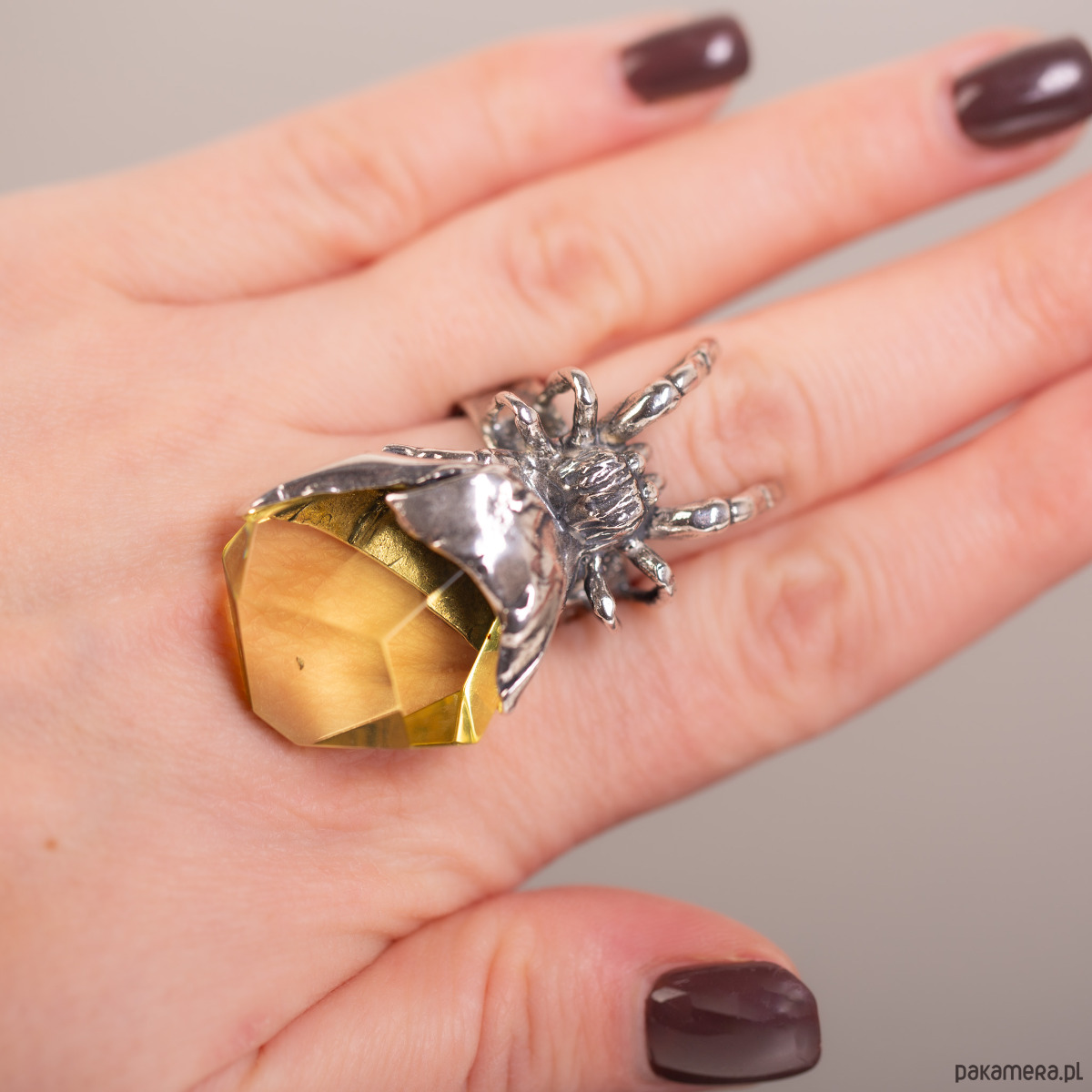 Forma: Grubość ok. 1,6 cm nadaje pierścionkowi trójwymiarowości i rzeźbiarskiego charakteru. Pająk jest dopracowany w każdym detalu — widać jego nogi, głowę i ciało, które harmonijnie komponują się z fasetowanym bursztynem.