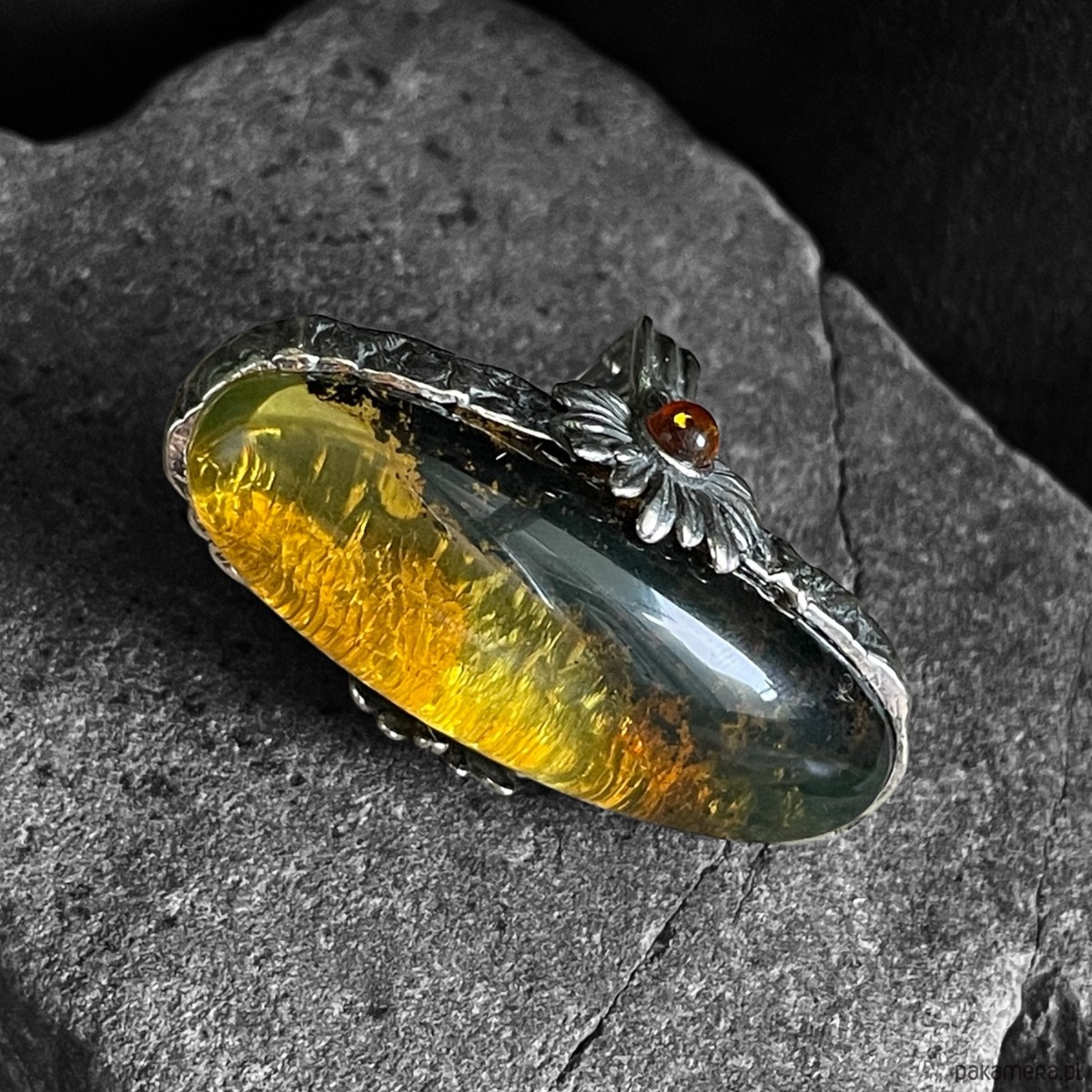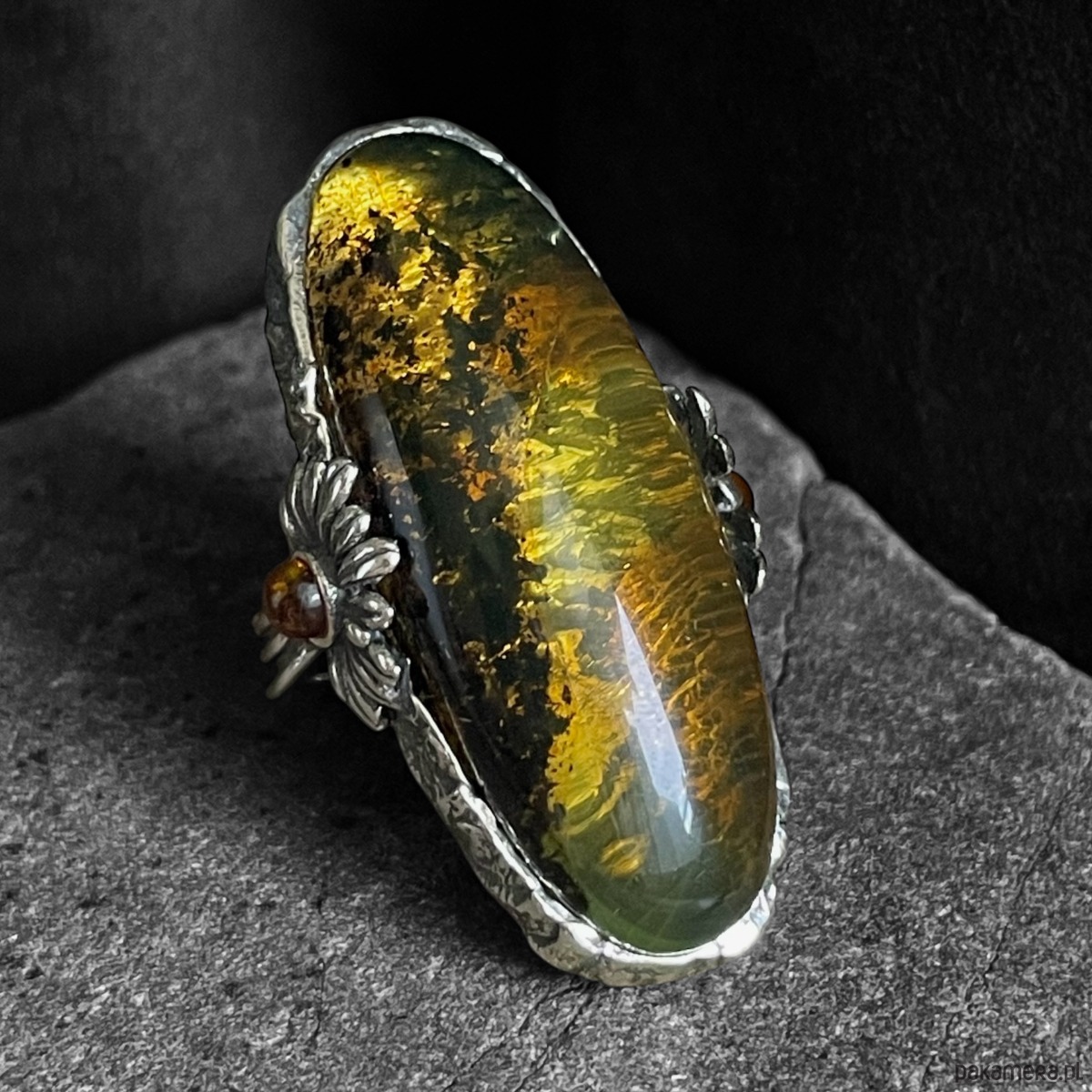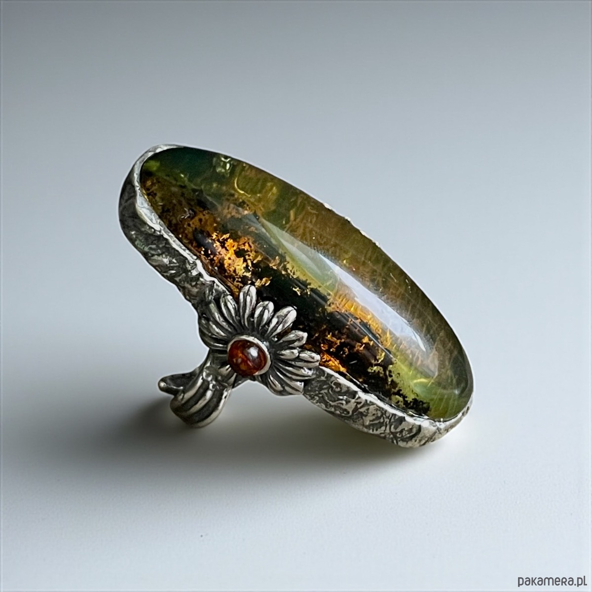 Ręcznie wykonany artystyczny pierścionek ze srebra próby 925 z centralnie osadzonym naturalnym bursztynem bałtyckim w rzadko spotykanym, zielonym odcieniu.