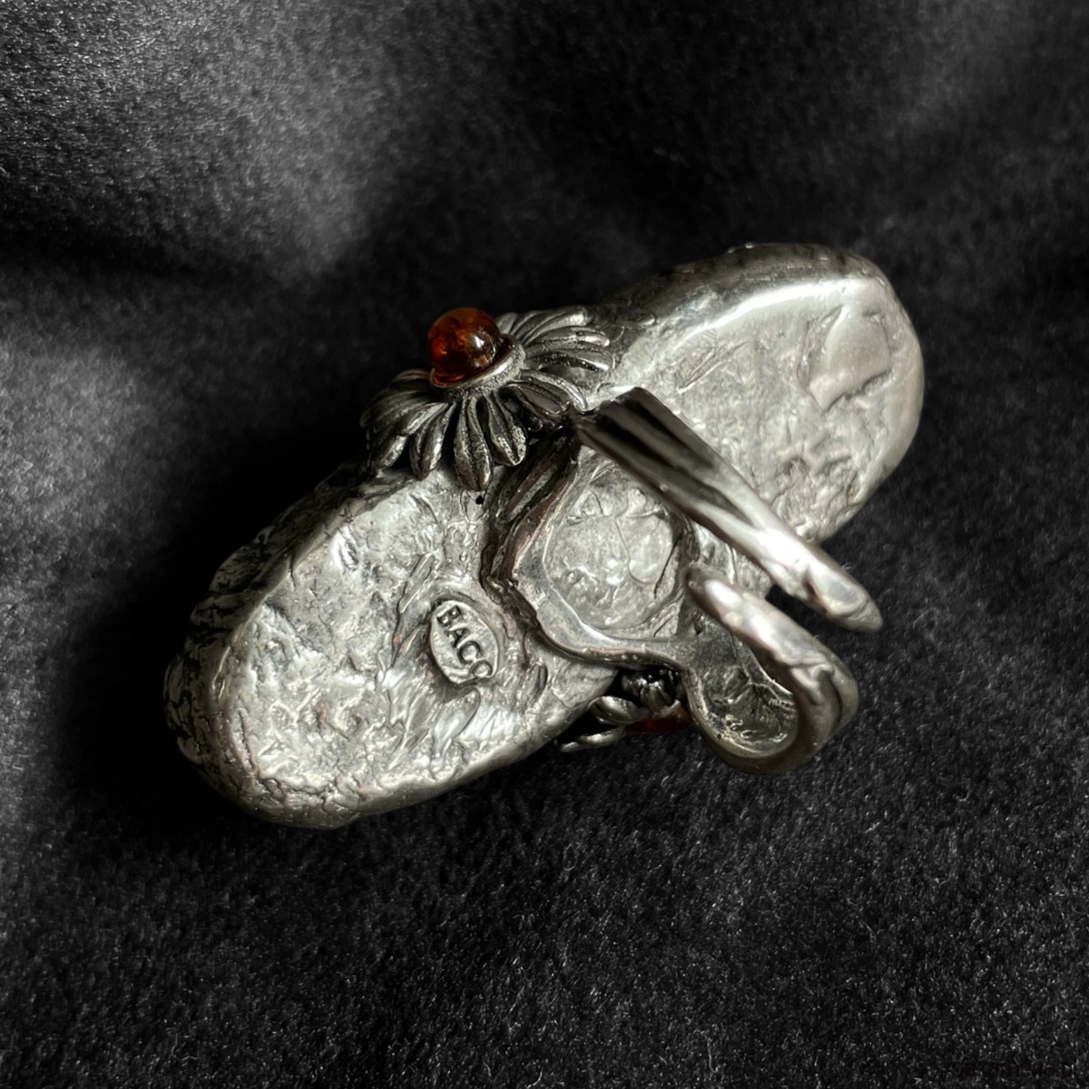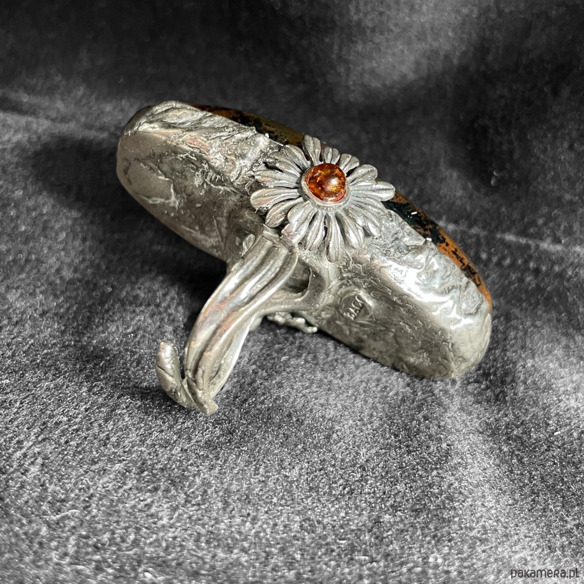 Boczne części pierścionka zdobią misterne, srebrne kwiaty, w których środku osadzone są drobne bursztyny w ciepłym, koniakowym kolorze.