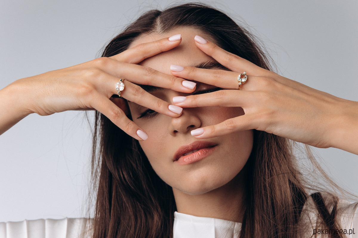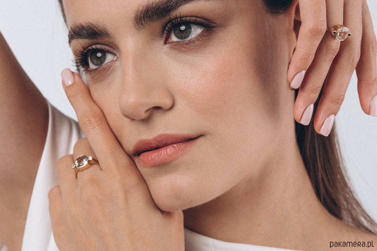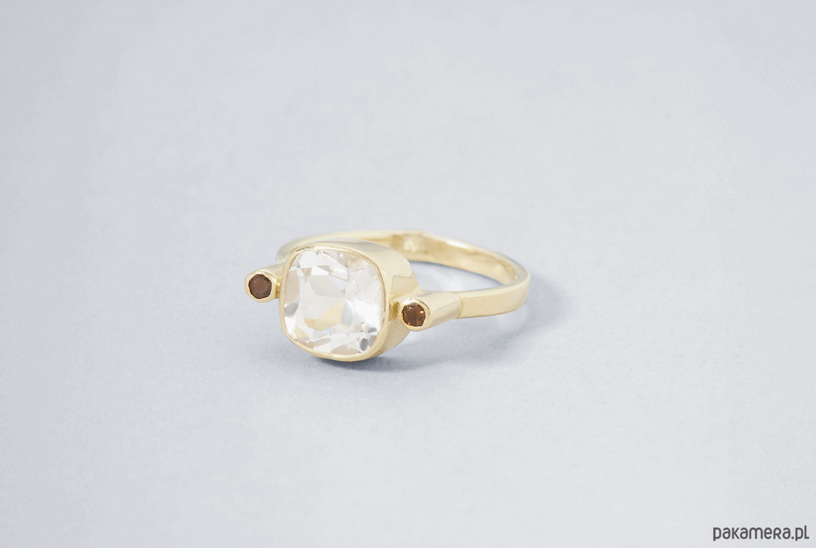 Klasyczny pierścionek z topazem białym w towarzystwie kwarców dymnych. Kolekcja POWROTY to biżuteria stworzona ze starej biżuterii (tzw. upcykling). Powrót do klasyki, która jest ponadczasowa.
