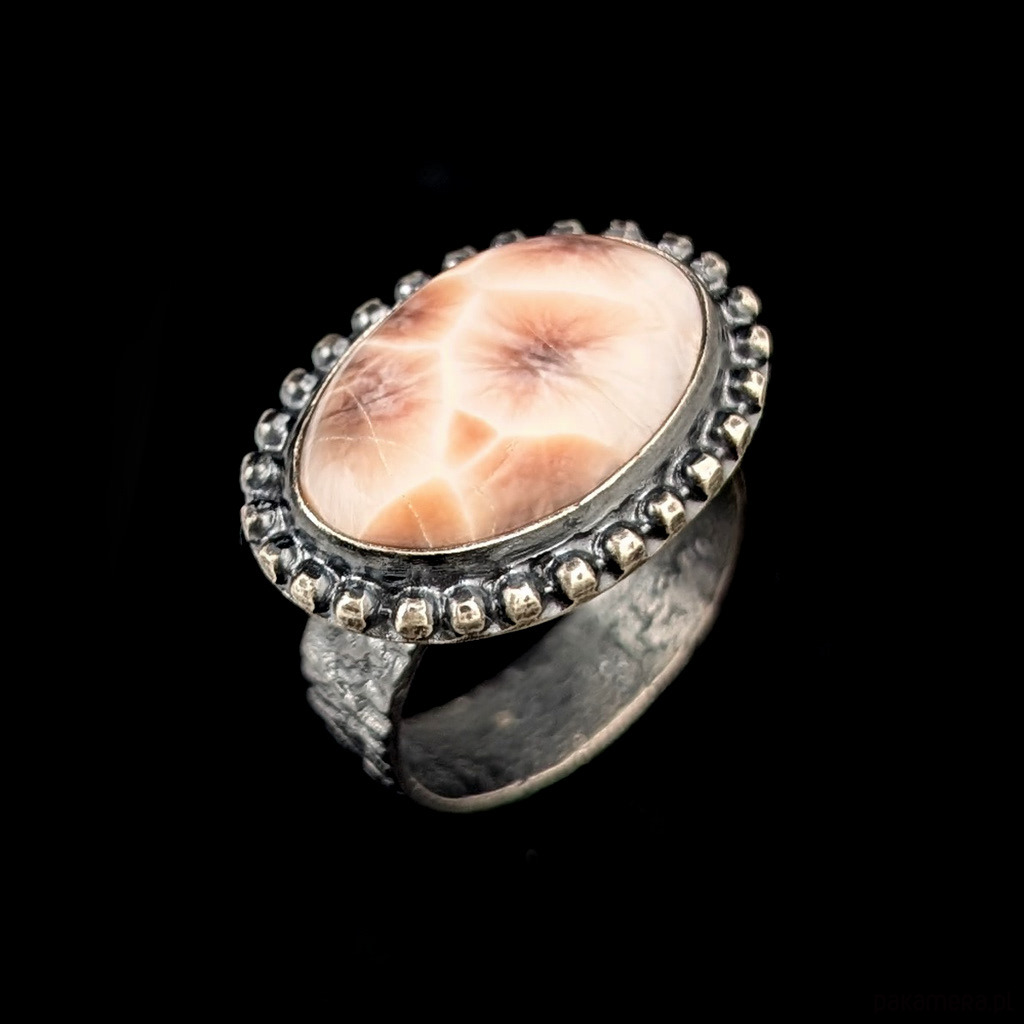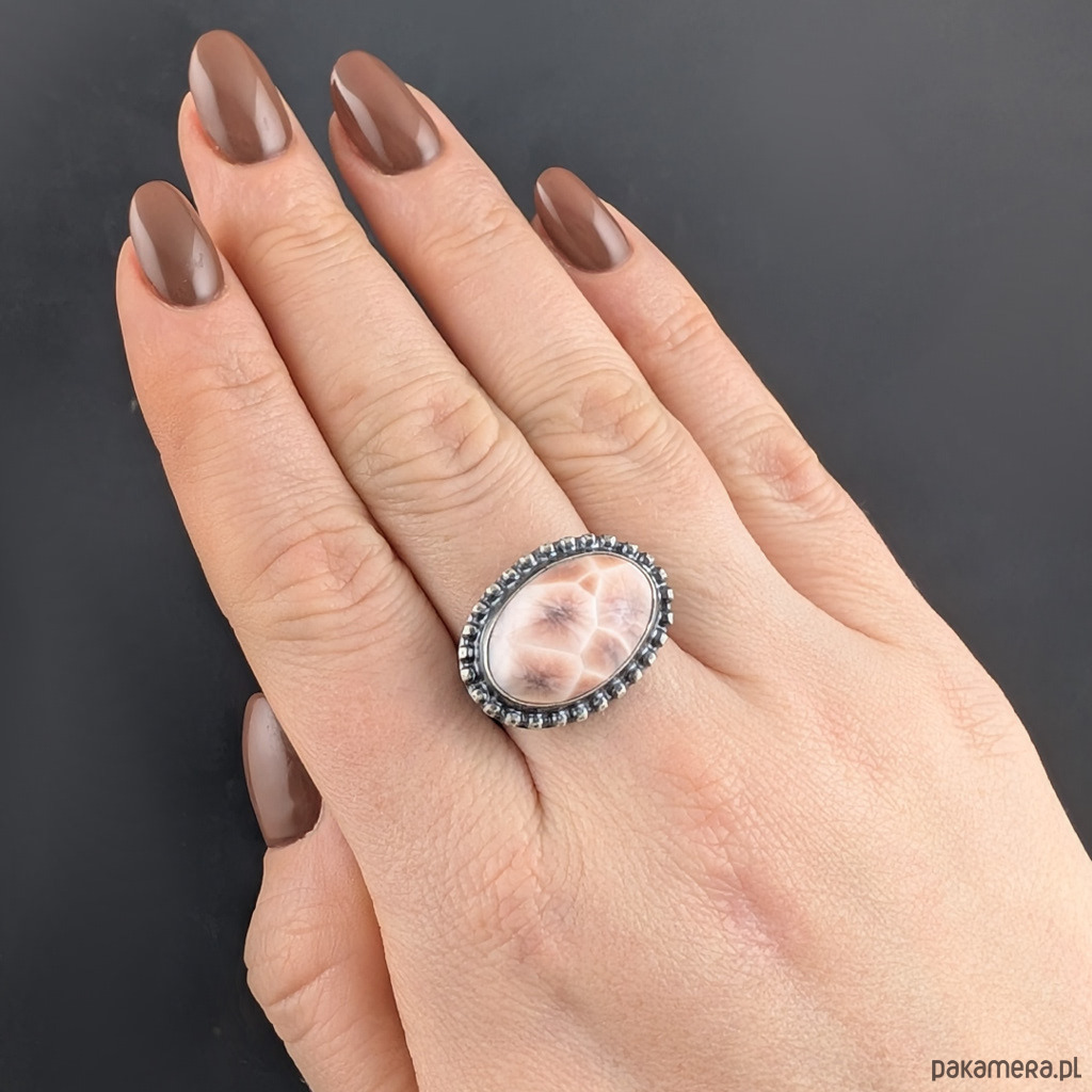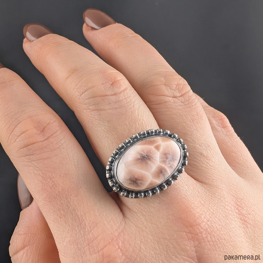 Pierścień z oprawionym w oksydowane srebro pr. 925 pięknym okazem rzadkiego thomsonitu. Wymiary oprawy 22 x 18 mm. Waga 8,4 g. Rozmiar jubilerski 19, mogę powiększyć na max 20. Pierścionek zostanie wysłany w ozdobnym pudełeczku.