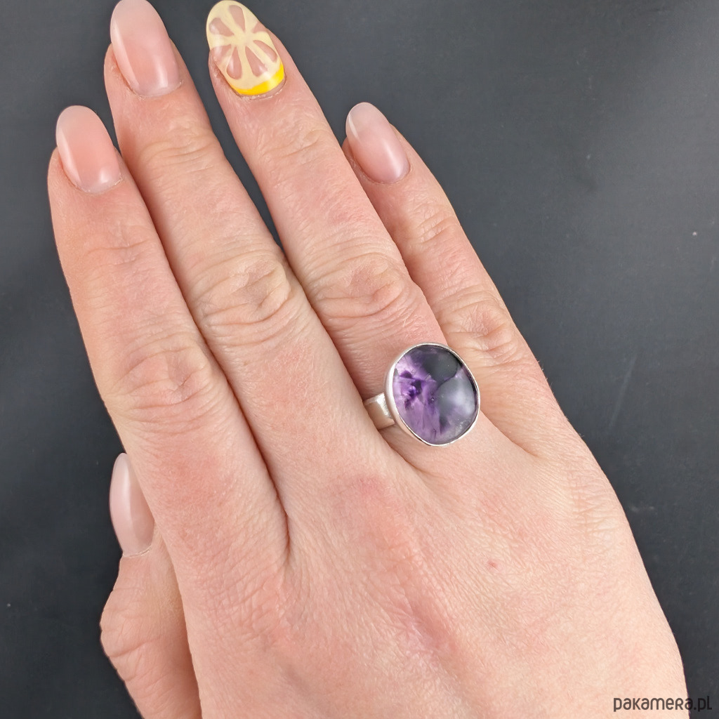 Pierścień wykonany ze srebra próby 925. Rozmiar pierścionka regulowany w szerokim zakresie, dopasuję po zakupie. Ozdobą pierścionka jest naturalny ametyst o pięknym wnętrzu. Wymiary 17 x 13 mm, szerokość obrączki 5 mm. Waga 6,76 grama. Pierścień zostanie zapakowany w ozdobne pudełeczko.