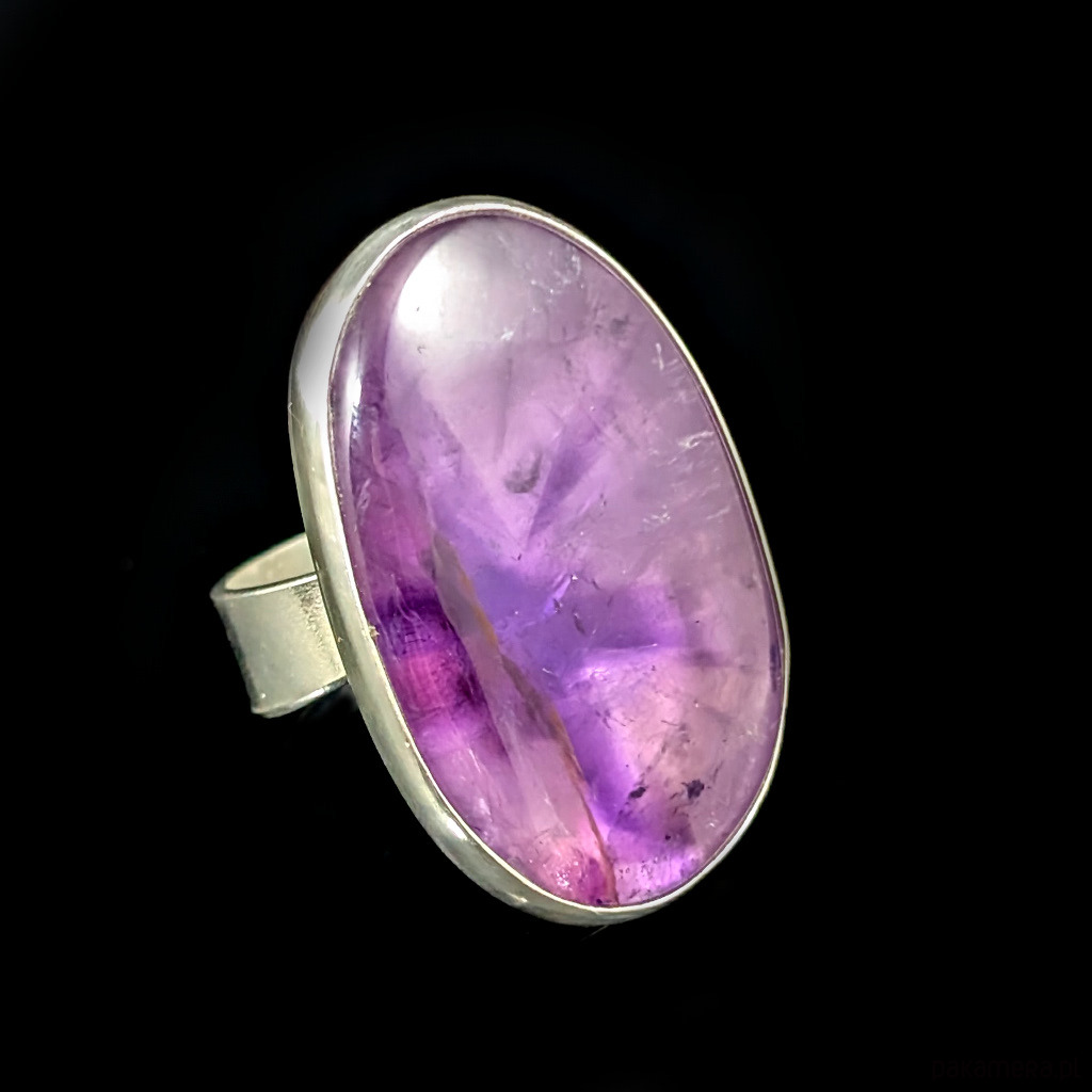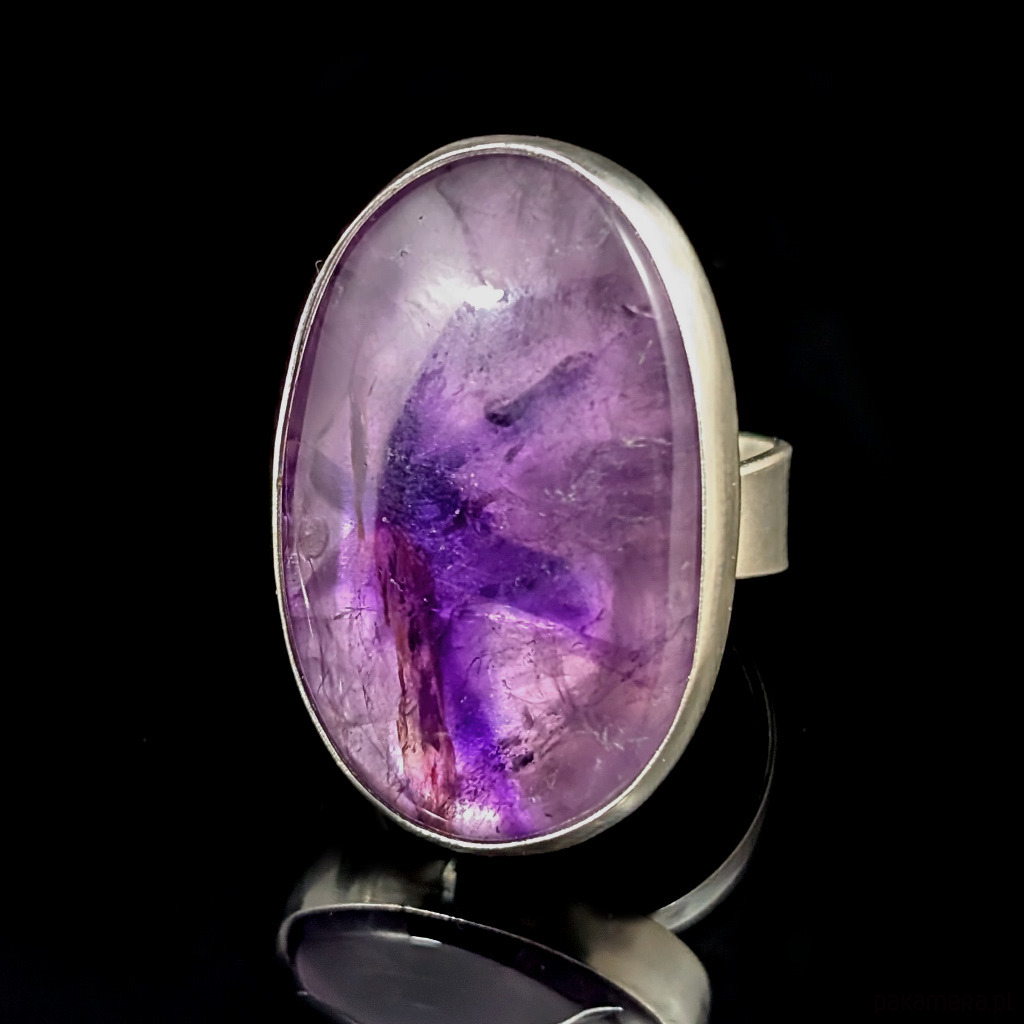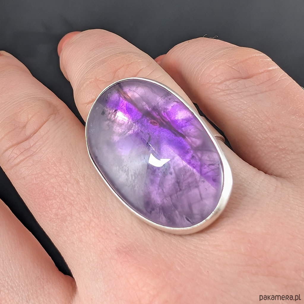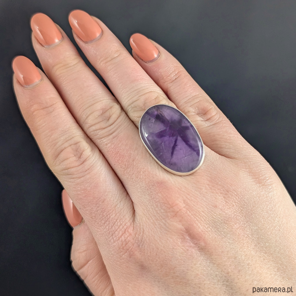 Pierścień wykonany ze srebra próby 925. Rozmiar pierścionka regulowany w szerokim zakresie, proszę podać na jaki dopasować. Ozdobą pierścionka jest ametyst o pięknym wnętrzu. Wymiary 30 x 20 mm, szerokość obrączki 5 mm. Waga 11,3 grama. Pierścień zostanie zapakowany w ozdobne pudełeczko.