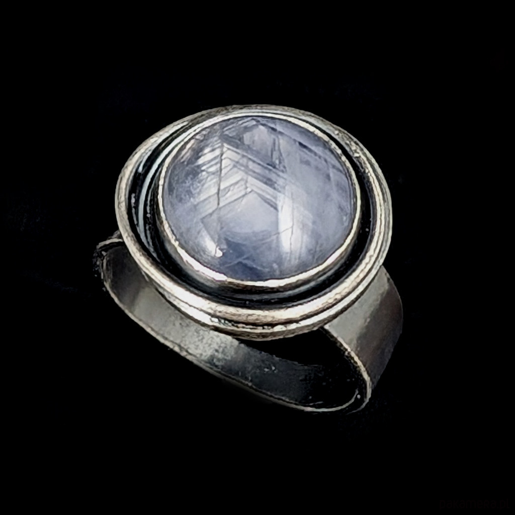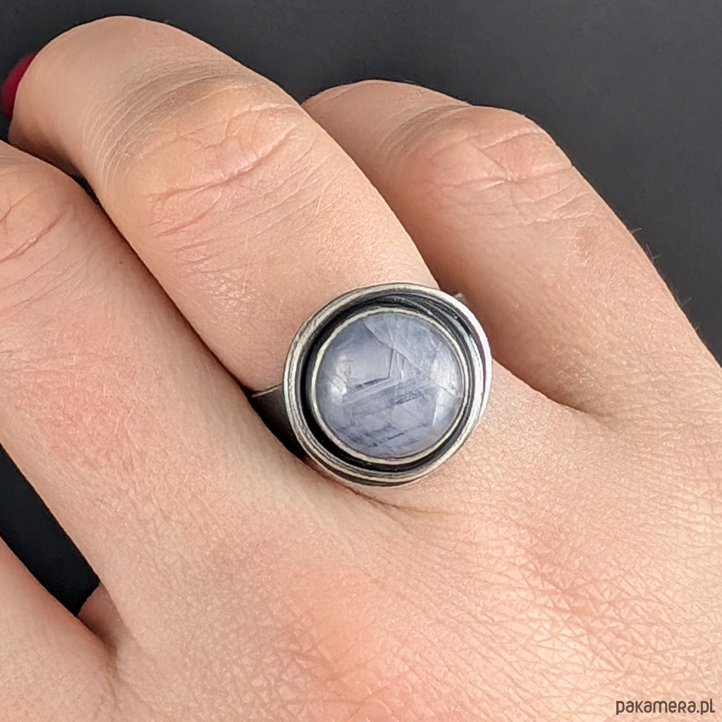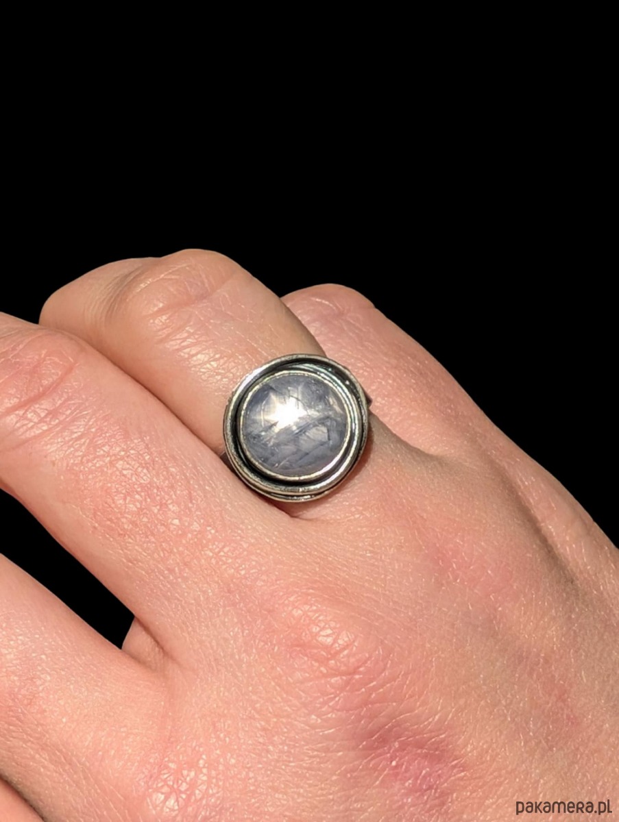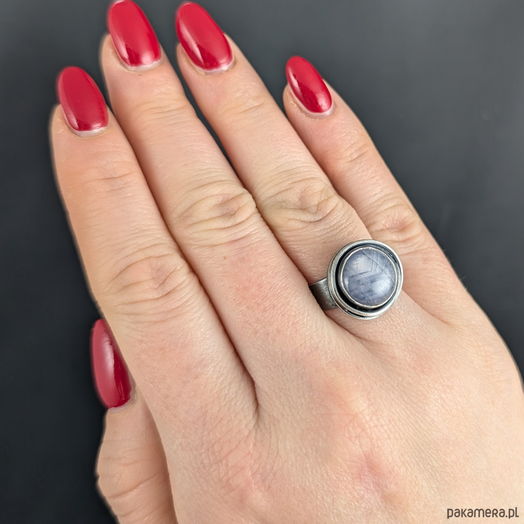 Szlachetny, elegancki pierścień z oprawionym w oksydowane srebro pr. 925 okazem pięknego szafiru gwiaździstego. Subtelna gwiazda pojawia się na szarej tafli wraz ze źródłem światła i pewłnym słońcu. Wymiary oprawy 16 x 15 mm. Waga 6,6 g. Rozmiar jubilerski 17 bez możliwości zmiany, obrączka zwężana ma max 6 mm szerokości. Pierścionek zostanie wysłany w ozdobnym pudełeczku.