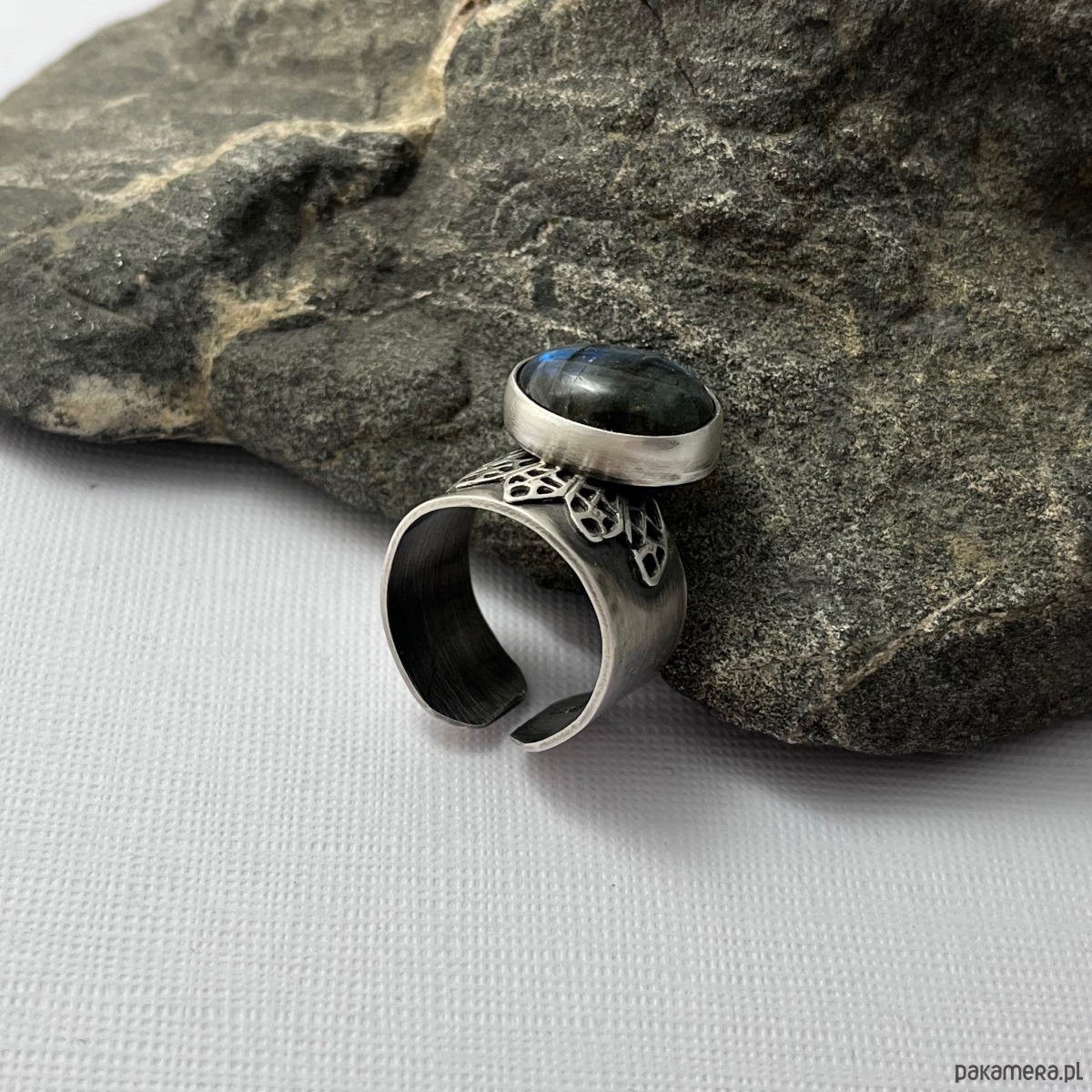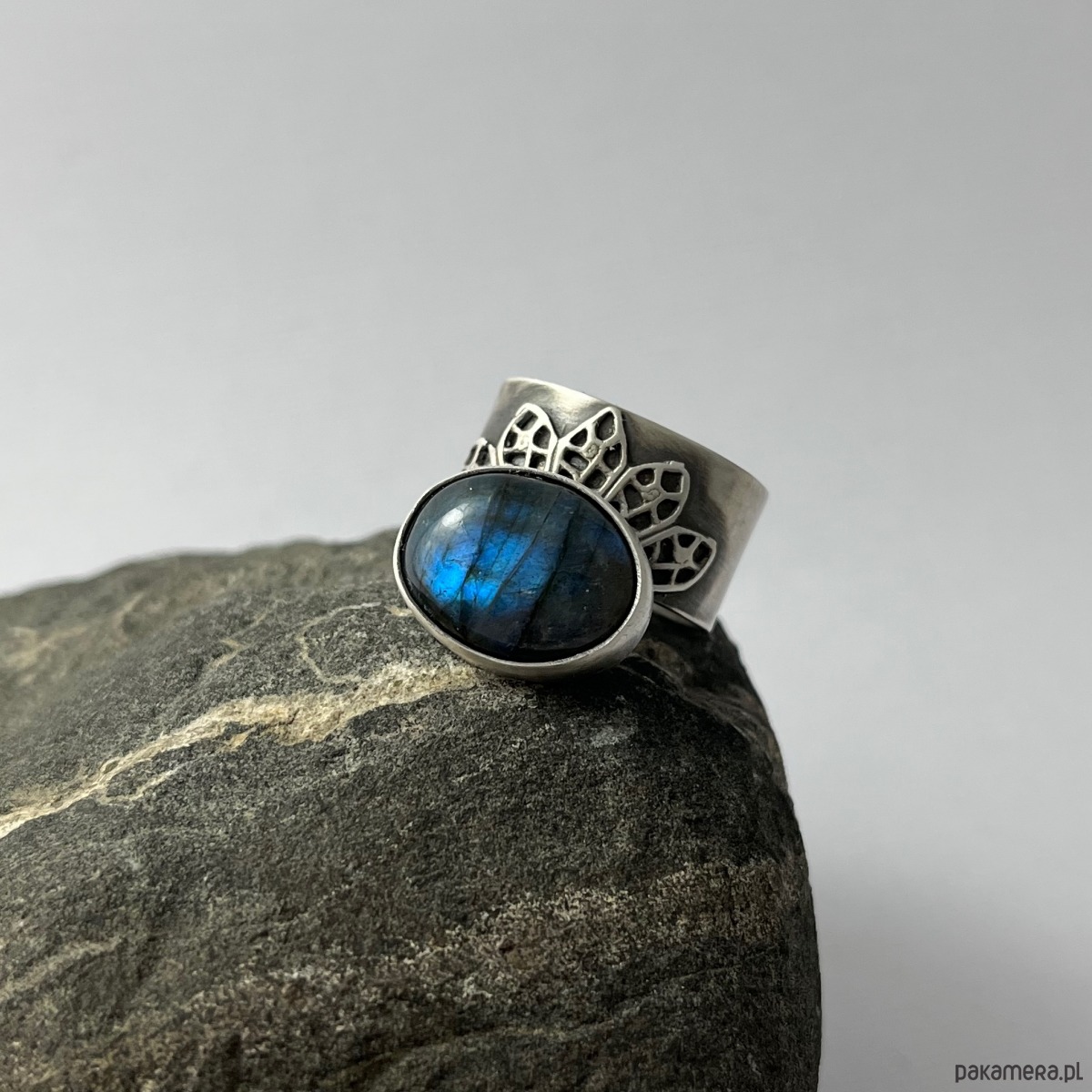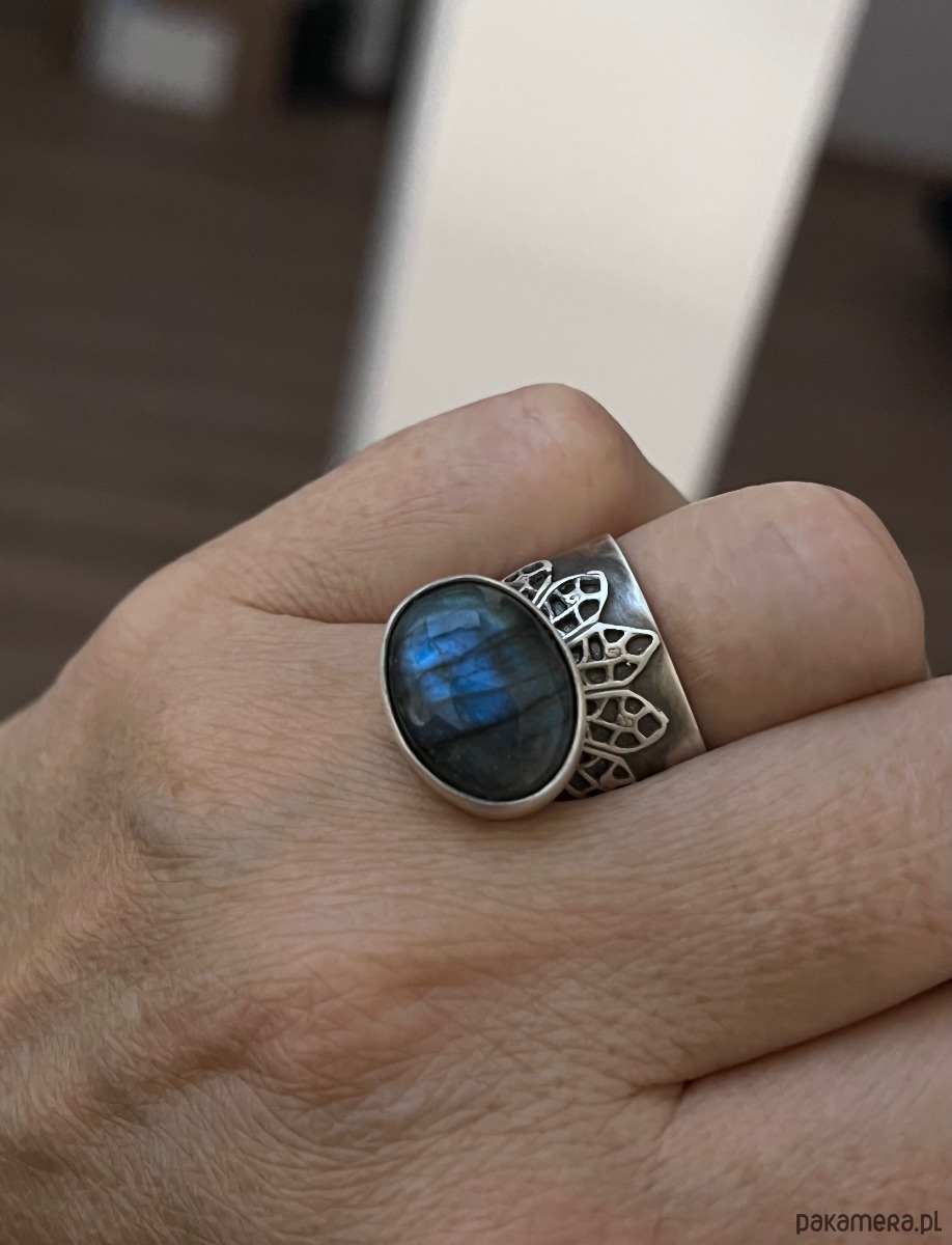 Kompozycja z labradorytem osadzonym na szerokiej, zdobionej koronką szynie co nadaje całości smaku. Srebro przyciemnione i lekko polerowane. Szyna otwarta w celu regulacji