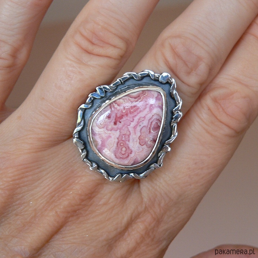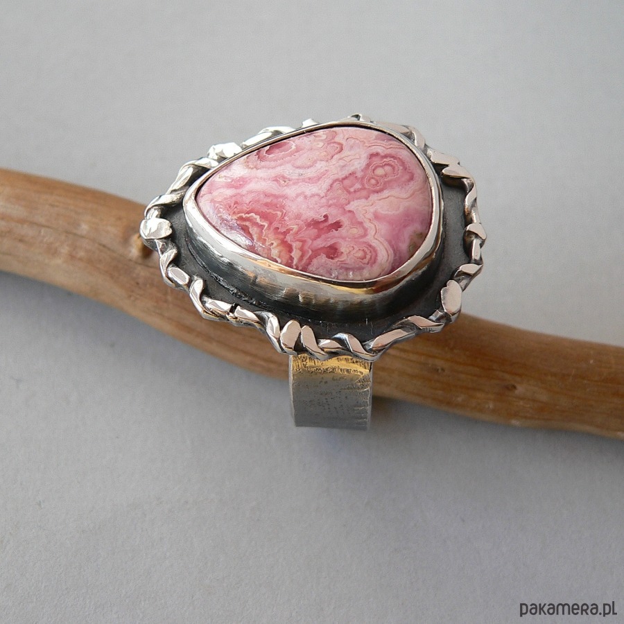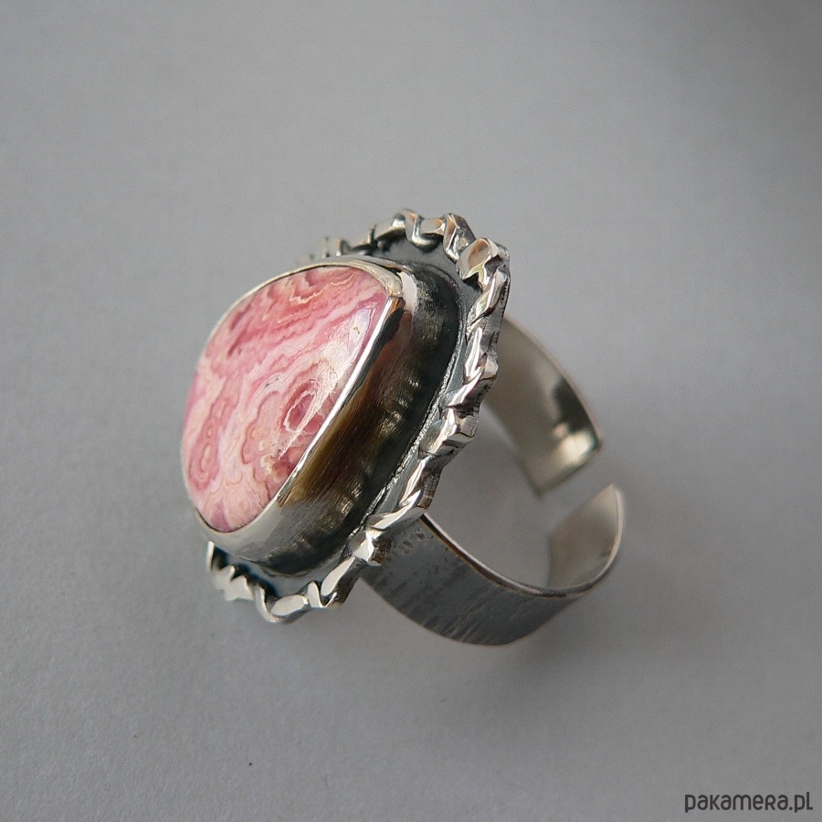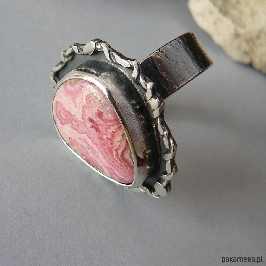 Pierścień wykonany ze srebra i okazu rodochrozytu . Wymiary kamienia- 2,4/1,7 cm, wymiary całego frontu z ozdobną oprawą 2,7/3,2 cm Srebro piaskowane, kute, oksydowane i polerowane. Szerokość obrączki- 0,7 cm Rozmiar regulowany w szerokim zakresie/max rozmiar 21/, przy zakupie proszę podać noszony rozmiar, ustawię obrączkę. Kolor kamienia nieco mniej intensywny w rzeczywistości.