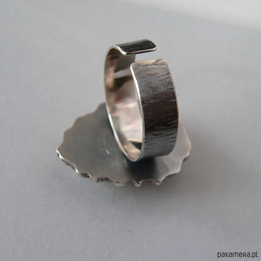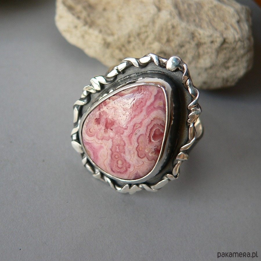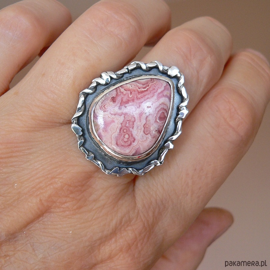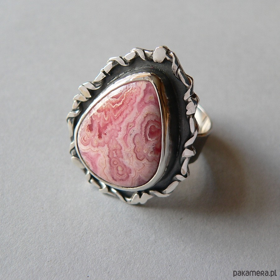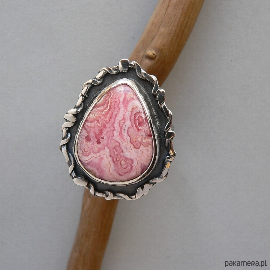 Pierścień wykonany ze srebra i okazu rodochrozytu . Wymiary kamienia- 2,4/1,7 cm, wymiary całego frontu z ozdobną oprawą 2,7/3,2 cm Srebro piaskowane, kute, oksydowane i polerowane. Szerokość obrączki- 0,7 cm Rozmiar regulowany w szerokim zakresie/max rozmiar 21/, przy zakupie proszę podać noszony rozmiar, ustawię obrączkę. Kolor kamienia nieco mniej intensywny w rzeczywistości.