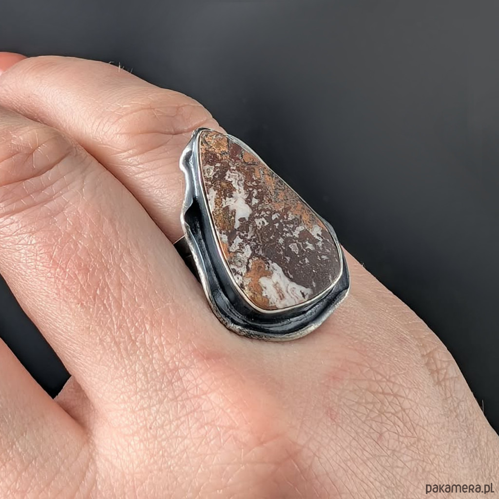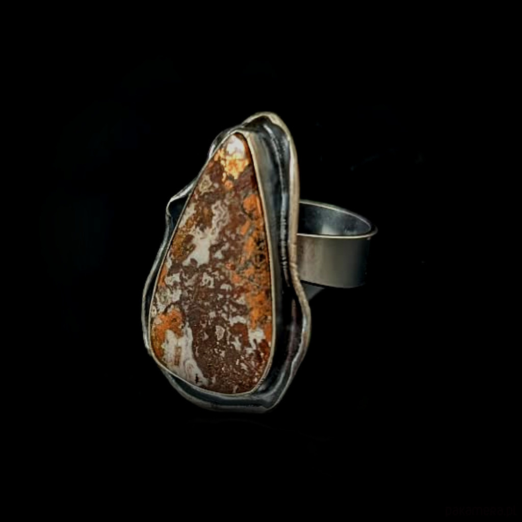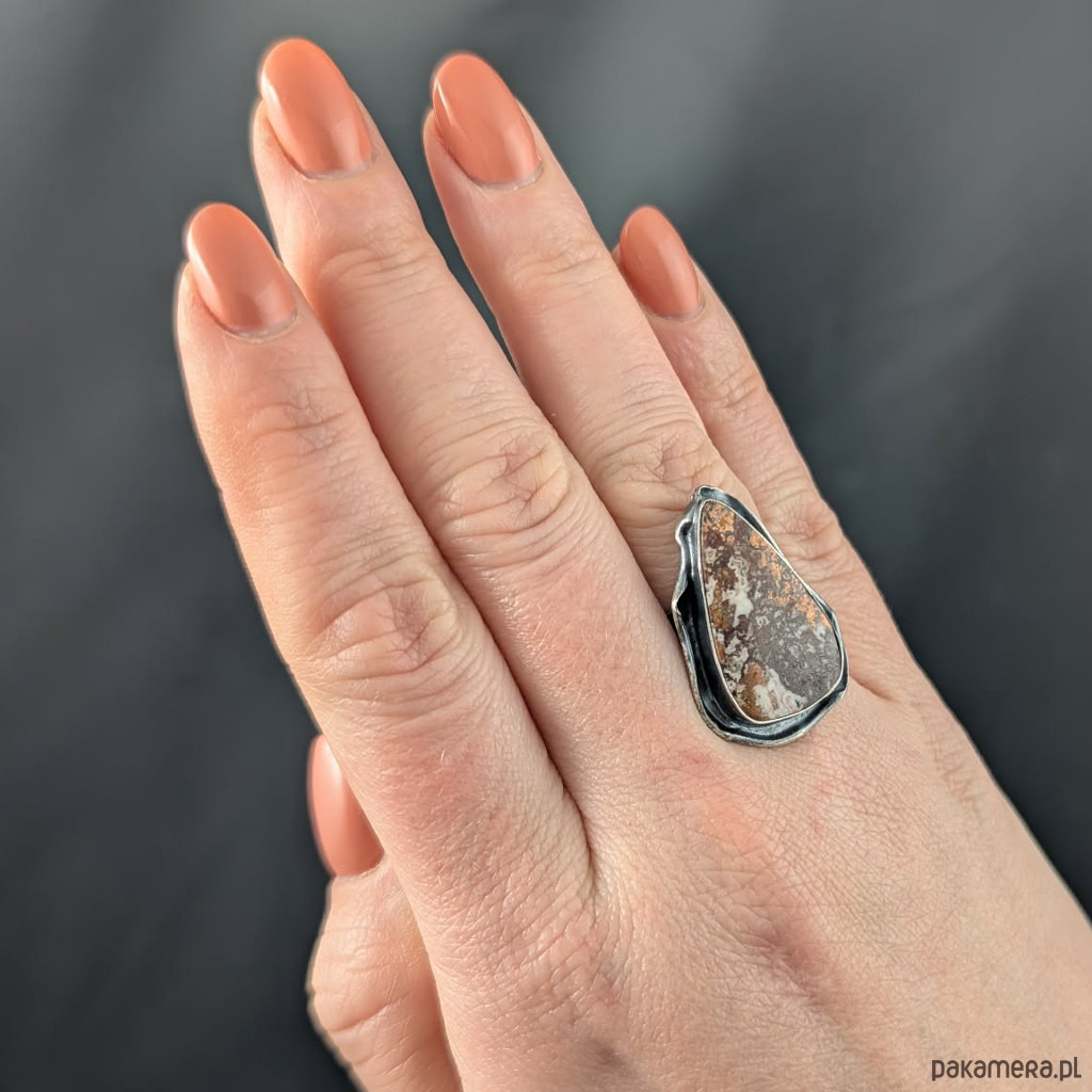 Bardzo oryginalny okaz rodzimej miedzi! Kamień oprawiony w oksydowane srebro pr. 925. Niezwykły pejzaż zaklęty w kamieniu, skrzy się odcieniami starego złota. Nieszablonowy. Rozmiar pierścionka regulowany w szerokim zakresie proszę napisać na jaki dopasować. Wymiary 30 x 20 mm,, waga 10 g, Pierścień będzie zapakowany w ozdobne pudełeczko.