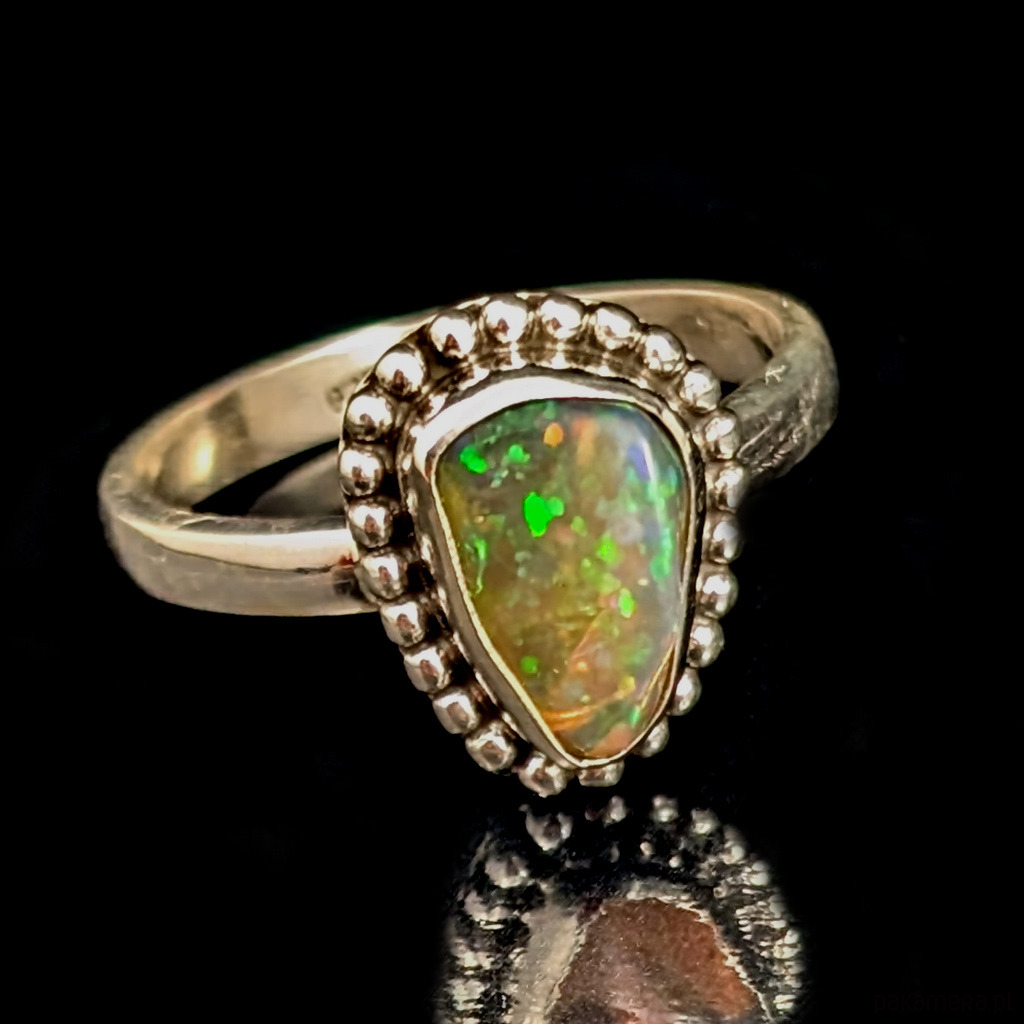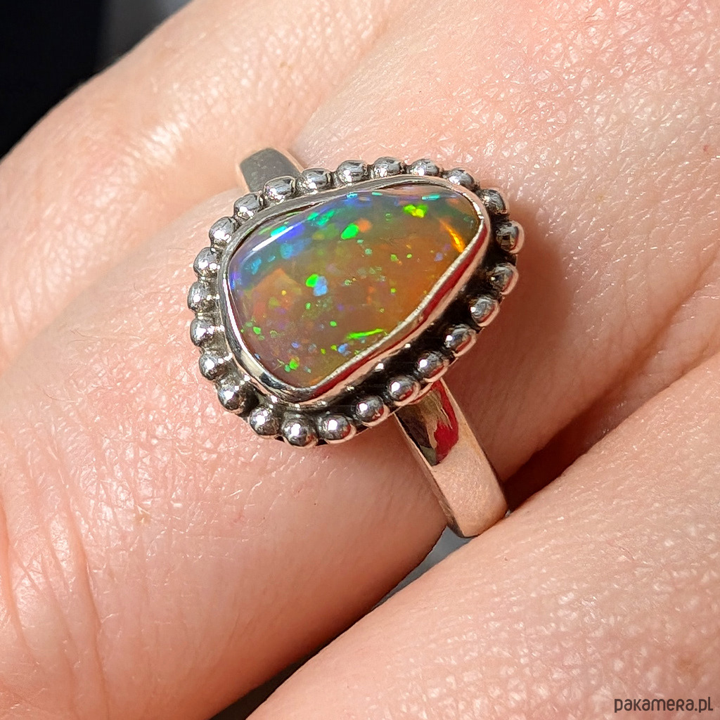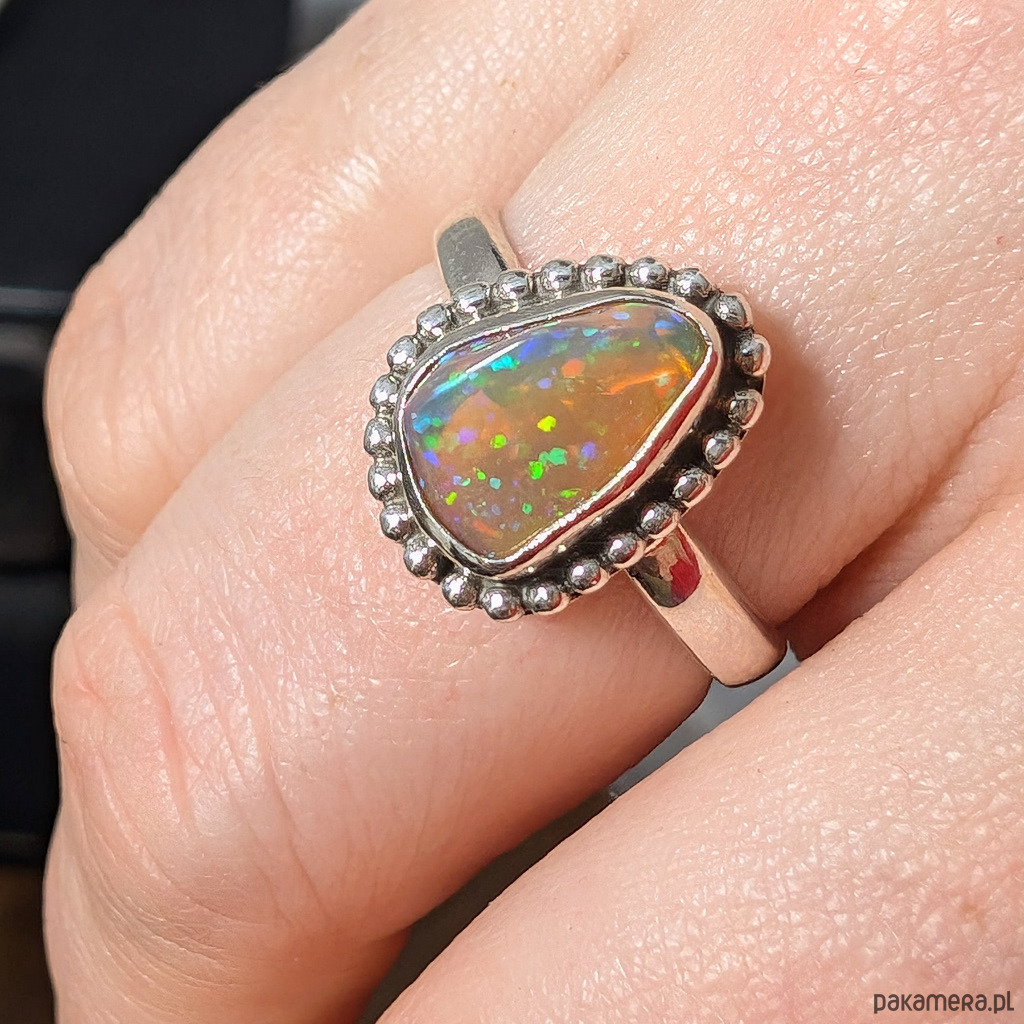 Pierścień wykonany ze srebra pr. 925 oraz pięknego, iskrzącego tęczowo opau z Etiopii w oprawie 13 x 11 mm Rozmiar jubilerski 17 mogę powiększyć na max 21. Ustawię odpowiedni, proszę o wiadomość. Waga 4 g. Wykonany przez dostawcę kamieni. Pierścień zostanie zapakowany w ozdobne pudełeczko.