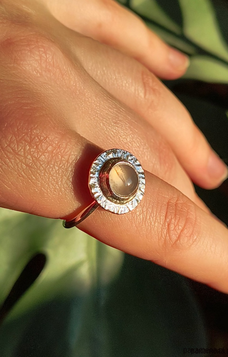 Pierścionek wykonałam własnoręcznie ze srebra próby 925. Sercem pierścienia jest naturalny kwarc różowy - kamień miłoś. Powierzchnia srebra pokryta została oksydą, co nadaje mu ciemniejszy odcień. Po dłuższym czasie użytkowania, oksyda może się lekko ścierać, to naturalne.
