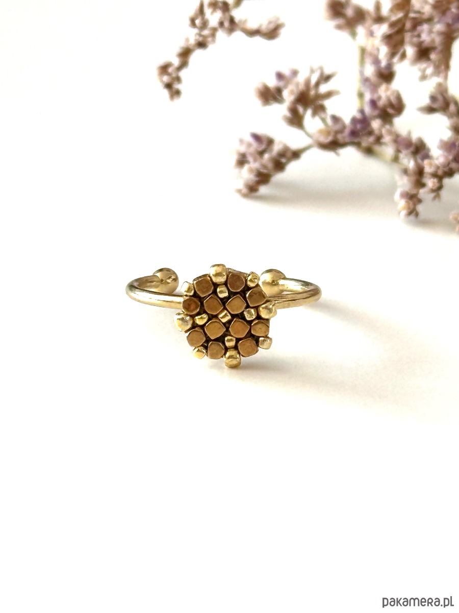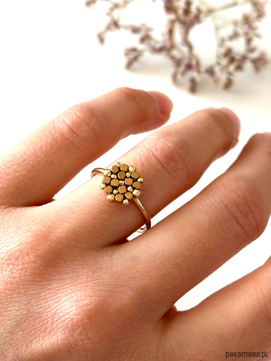 Pierścionek z kamieniami hematytu. Oryginalny, autorski wzór z kamieni hematytu w kształcie rozetki. Obrączka pierścionka wykonana ze stali szlachetnej, która nie powoduje uczuleń i jest odporna na czernienie. Obwód regulowany, wystarczy dogiąć pierścionek do rozmiaru palca.