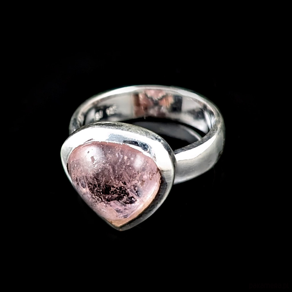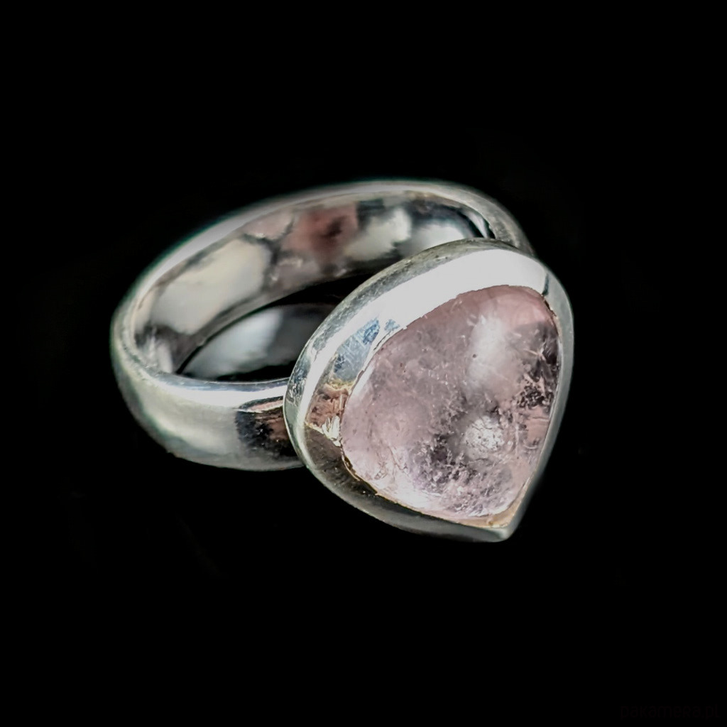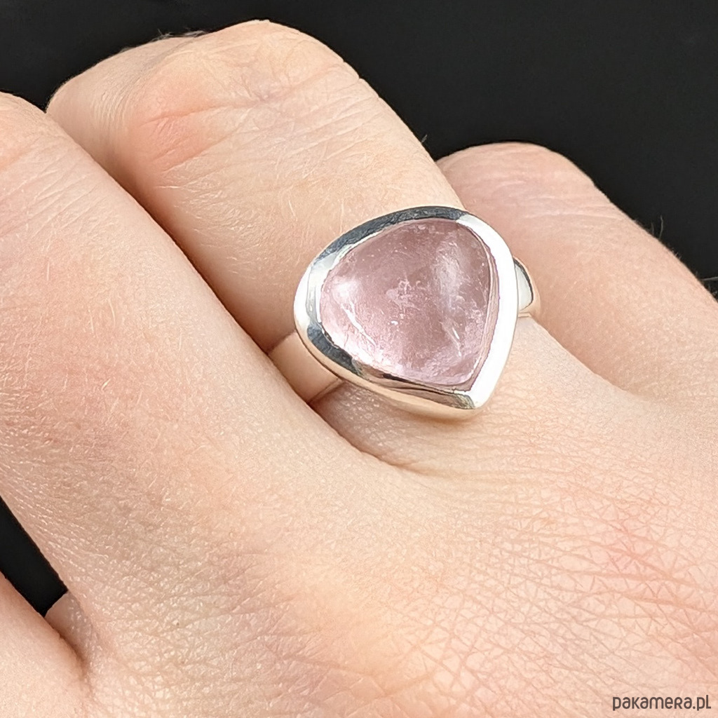 Pierścień z oprawionym w srebro próby 925 przepięknym morganitem. Kamień w odcieniu delikatnego różu. Oprawa ma 15 x 14 mm. Rozmiar jubilerski regulowany w wąskim zakresie mogę dopasować od 16 do 20. Waga 6,7 grama. Wykonany przez dostawcę kamieni. Pierścień zapakowany w ozdobne pudełeczko.