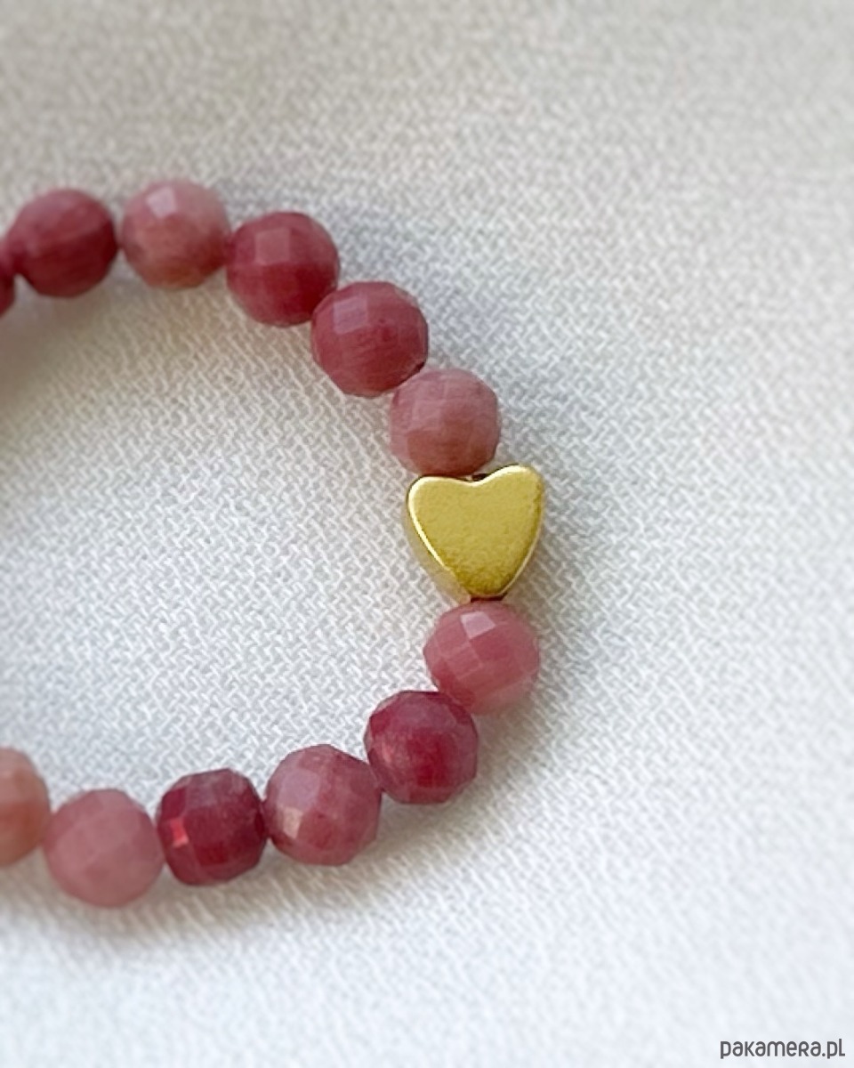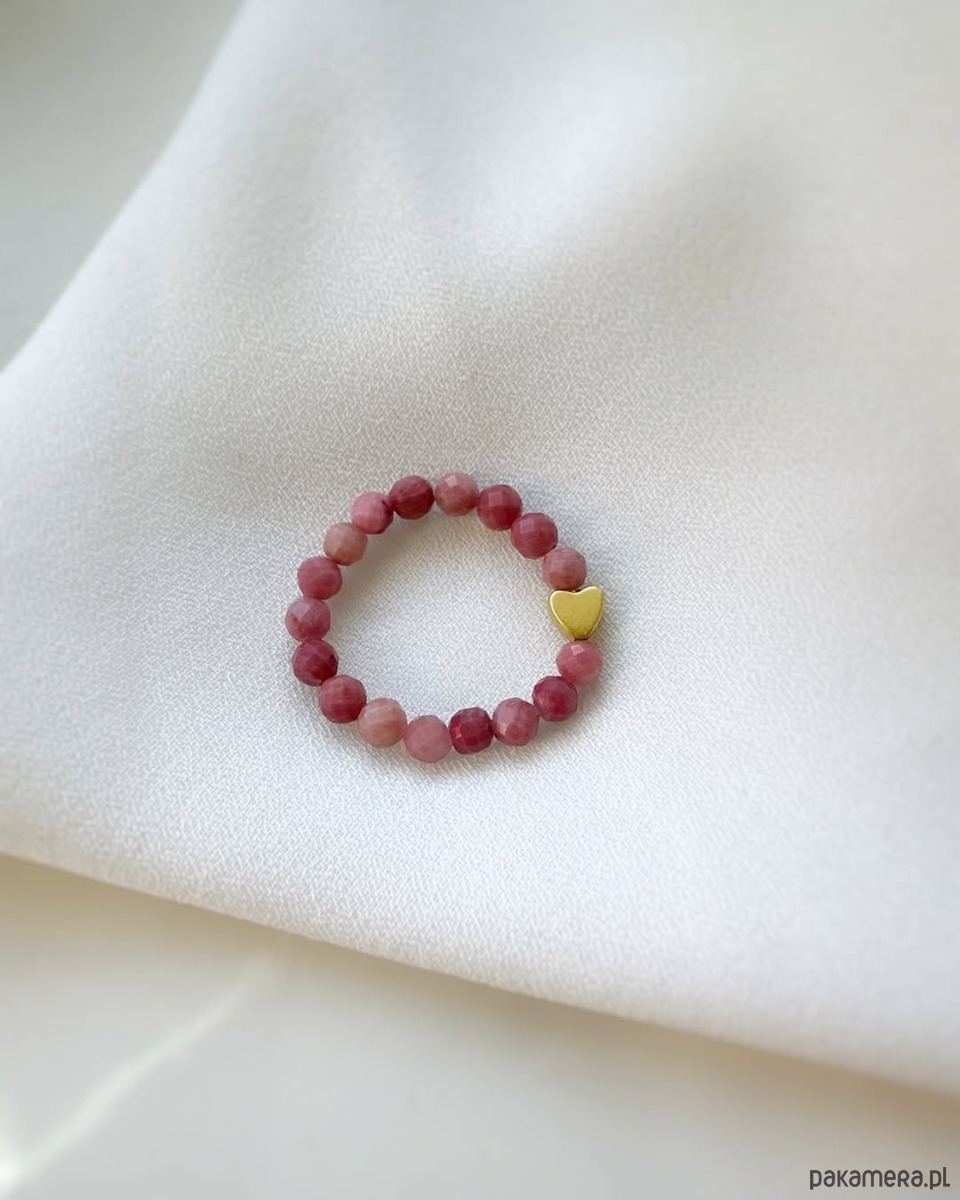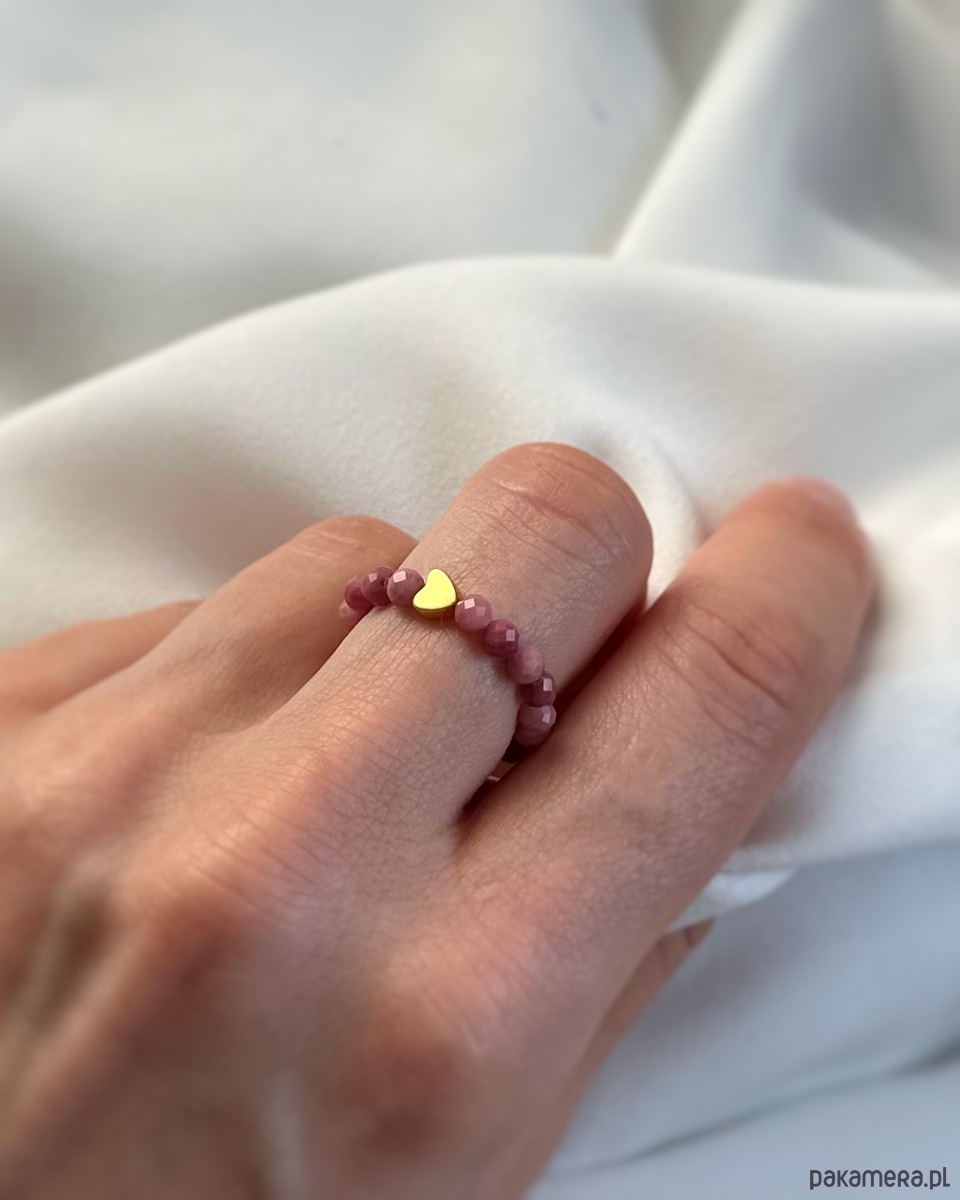 Pierścionek na elastycznej gumce z różowego rodonitu z małym hematytowym serduszkiem w kolorze złota. Delikatny i kobiecy✨