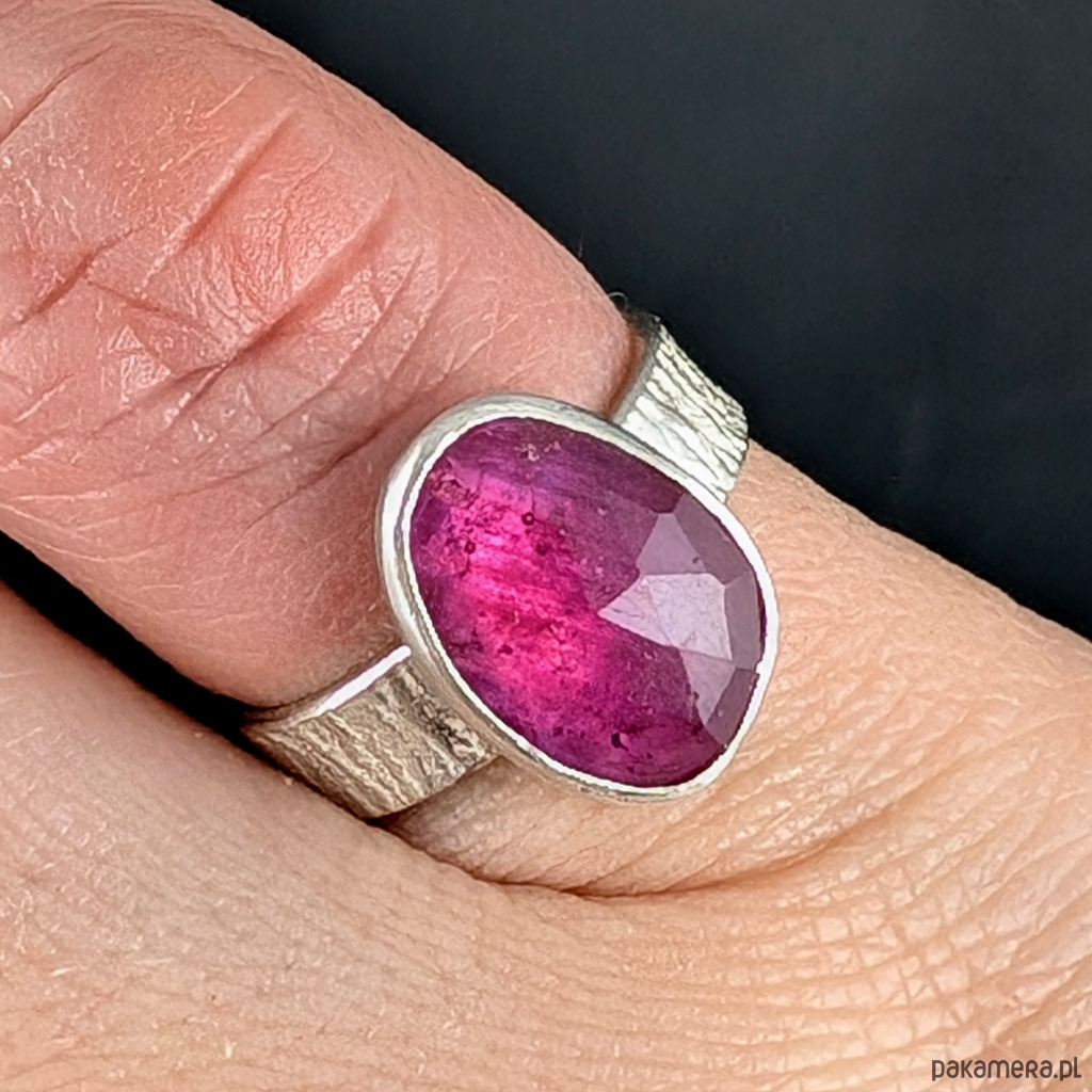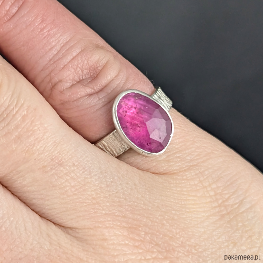 Przepiękny turmalin o barwie malinowej i przejrzystości spotęgowanej szlifem na całej powierzchni. Wymiary 12 x 9 mm, Klasyczna oprawa wykonana została ze srebra próby 925. Rozmiar jubilerski 10. Bez możliwości zmiany rozmiaru. Waga 3,6 g. Pierścionek zapakowany w ozdobne pudeleczko.