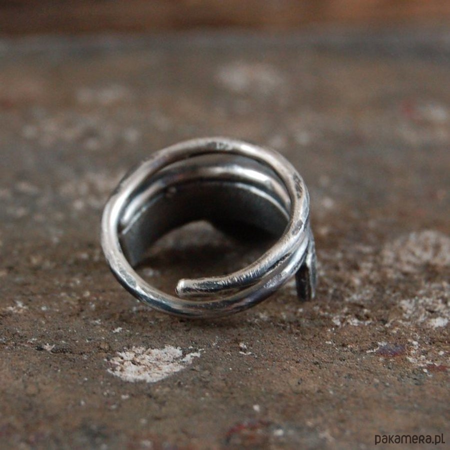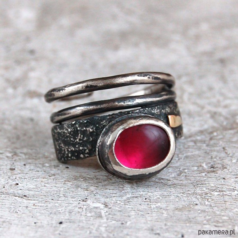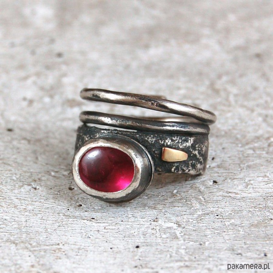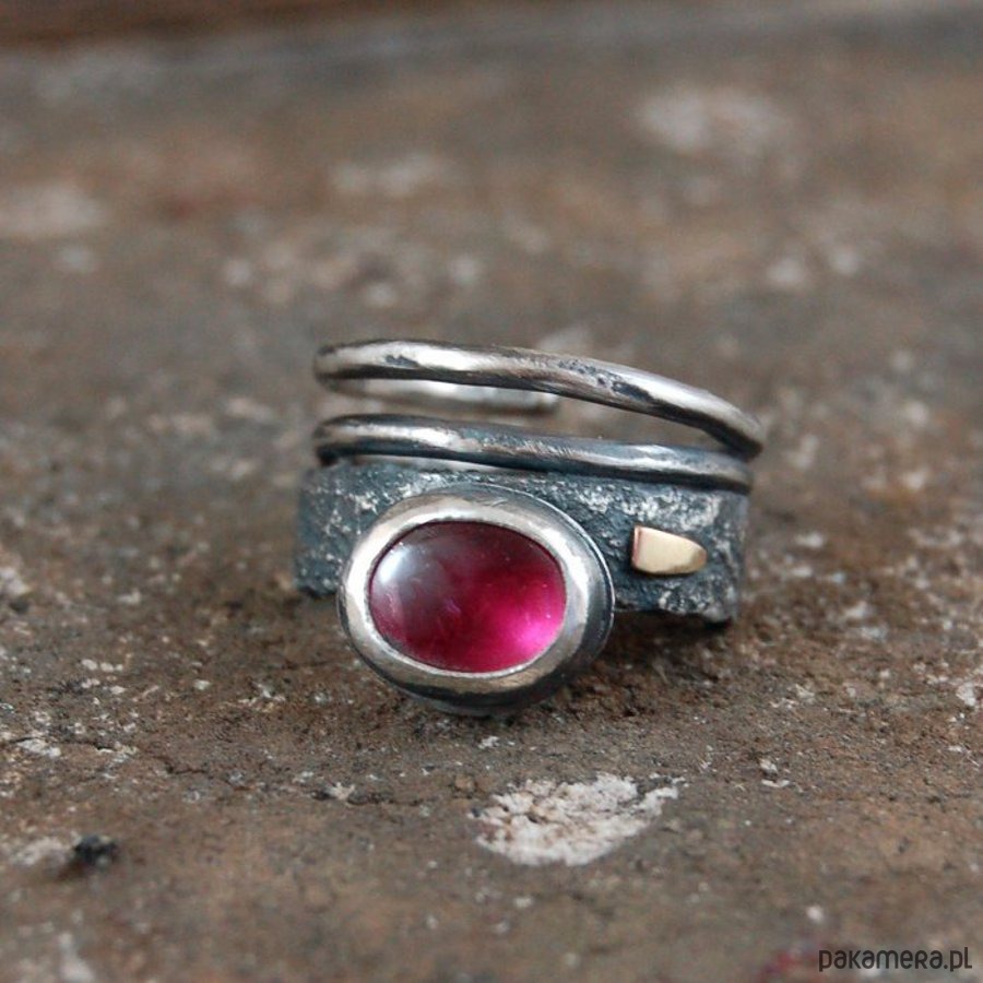 Pierścionek ze srebra, złota 585 i turmalinu. Srebro oksydowane. Wielkość kamienia 0,7 x 0,9 cm, Maksymalna szerokość obrączki 1,3 cm.