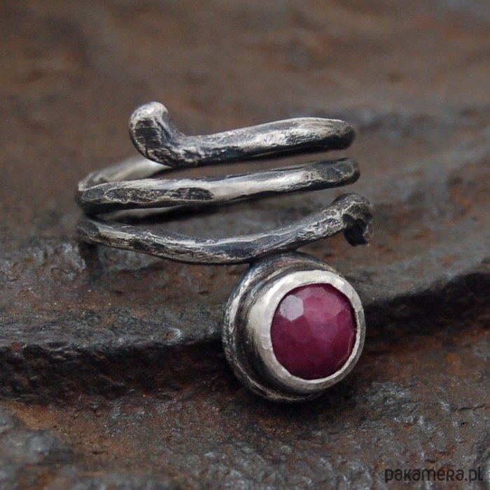 Srebrny pierścionek z rubinem. Srebro kute i oksydowane. Średnica kamienia 0,5 cm. Rozmiar regulowany - proszę o podanie rozmiaru, pierścionek zostanie ustawiony.