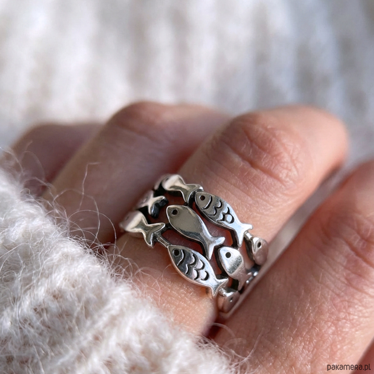 Wyjątkowa obrączka ze stali szlachetnej, której powierzchnię zdobi aż 20 rybek. Ażurowy wzór nadaje jej lekkości i sprawia, że pierścionek pięknie układa się na palcu. Motyw ryby to symbol wolności, harmonii, duchowej głębi oraz pomyślności – dzięki temu obrączka staje się nie tylko stylowym dodatkiem, ale i talizmanem o pozytywnej energii.