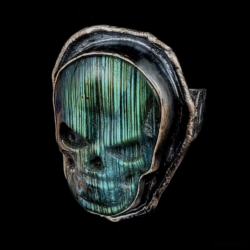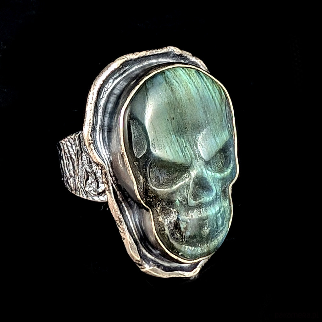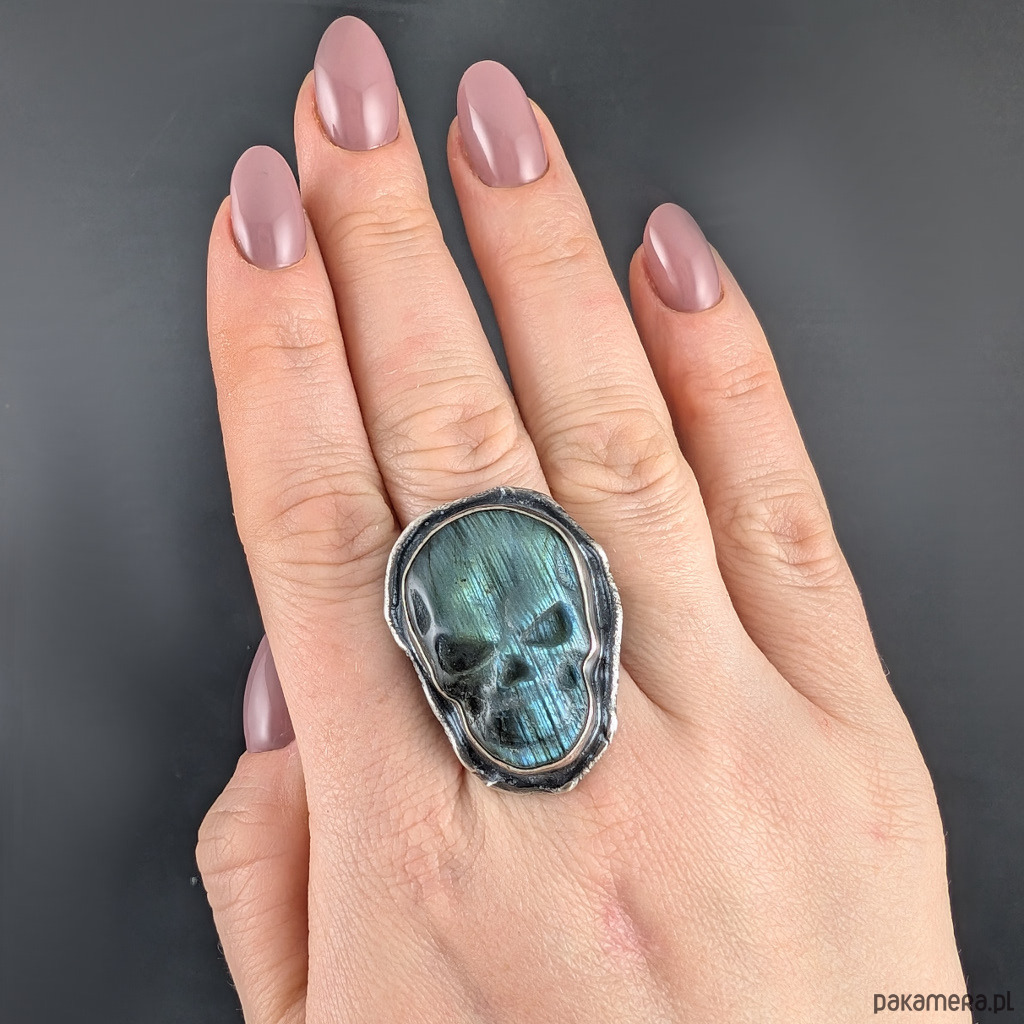 Oryginalny pierścień wykonany z oksydowanego srebra próby 925 z wkomponowanym labradorytemo ciekawym kształcie wyrzeźbionej czaszki. Wymiary 36 x 26 mm, rozmiar jubilerski 25, mogę powiększyć do max 26. Waga 21 gramów. Zapakowany w ozdobne pudełeczko.