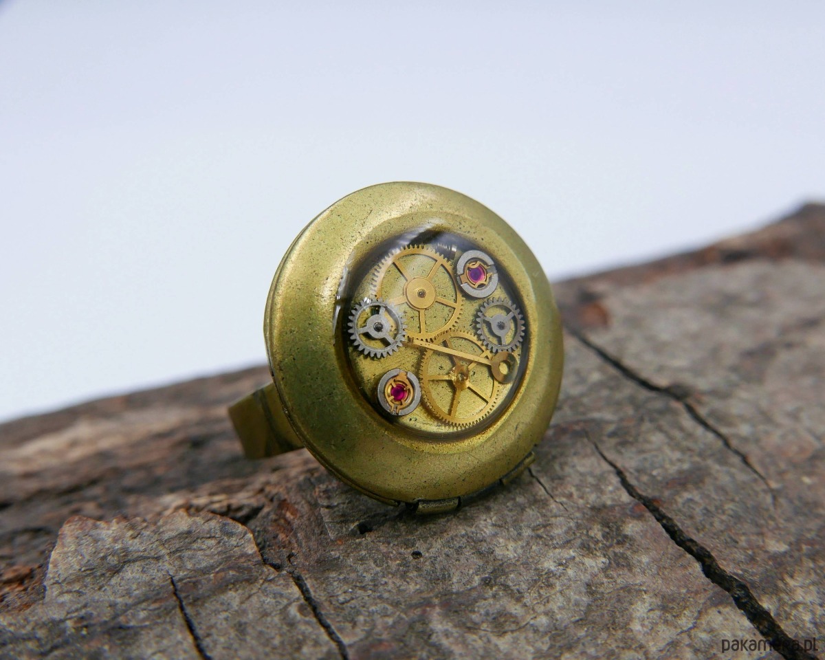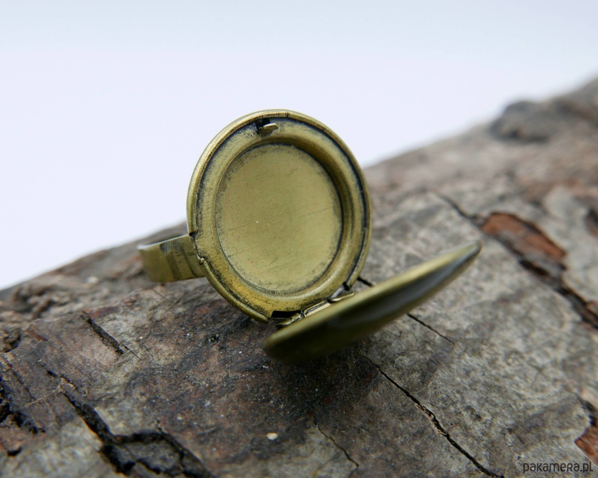 Delikatny mosiężny pierścionek-sekretnik. Średnica elementu ozdobnego 2 cm. Obrączka regulowana.