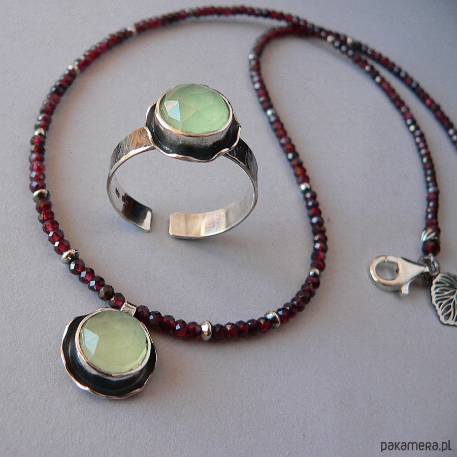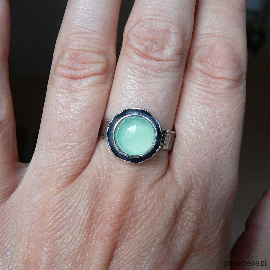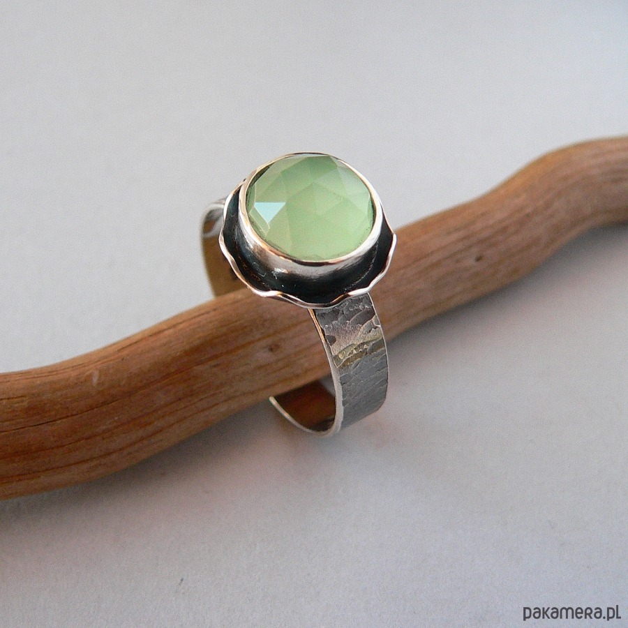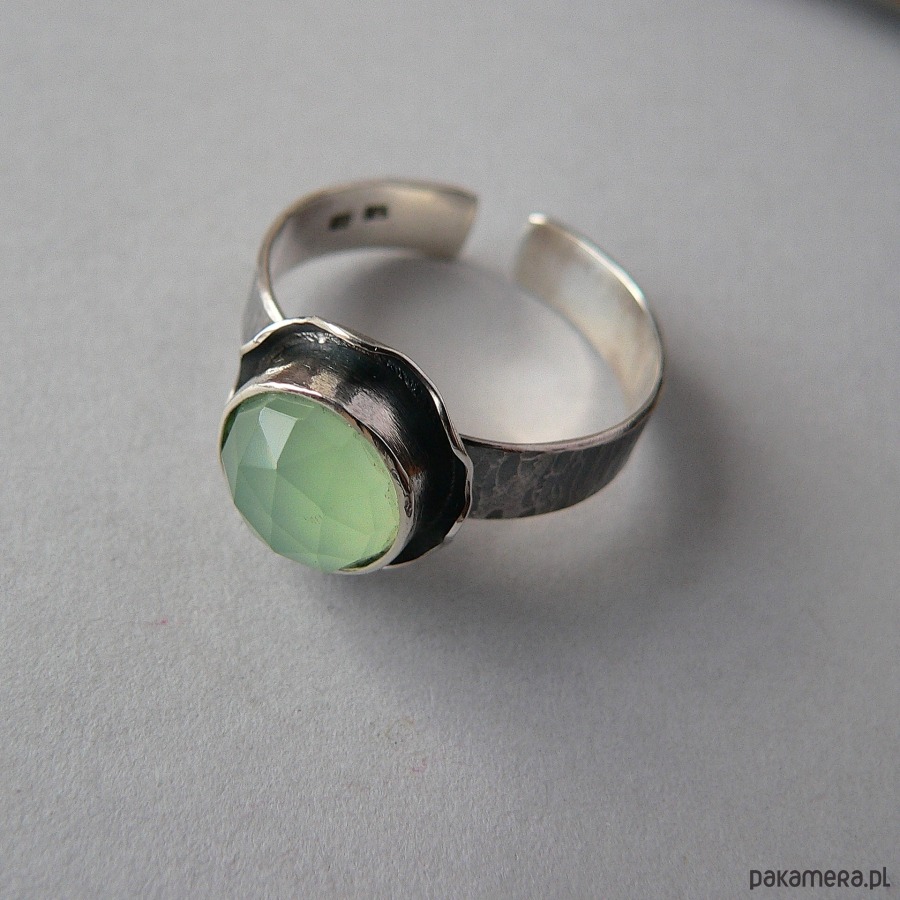 NA ZAMÓWIENIE, TERMIN REALIZACJI 5-6 DNI ROBOCZYCH. Pierścionek wykonany z jasnego seledynowego, fasetowanego agatu i srebra. Srebro pokryte wyraźną fakturą, oksydowane I polerowane. Średnica kamienia 10 mm Rozmiar regulowany, przy zakupie proszę podać noszony rozmiar, ustawię obrączkę. Możliwość zakupu naszyjnika do kompletu.