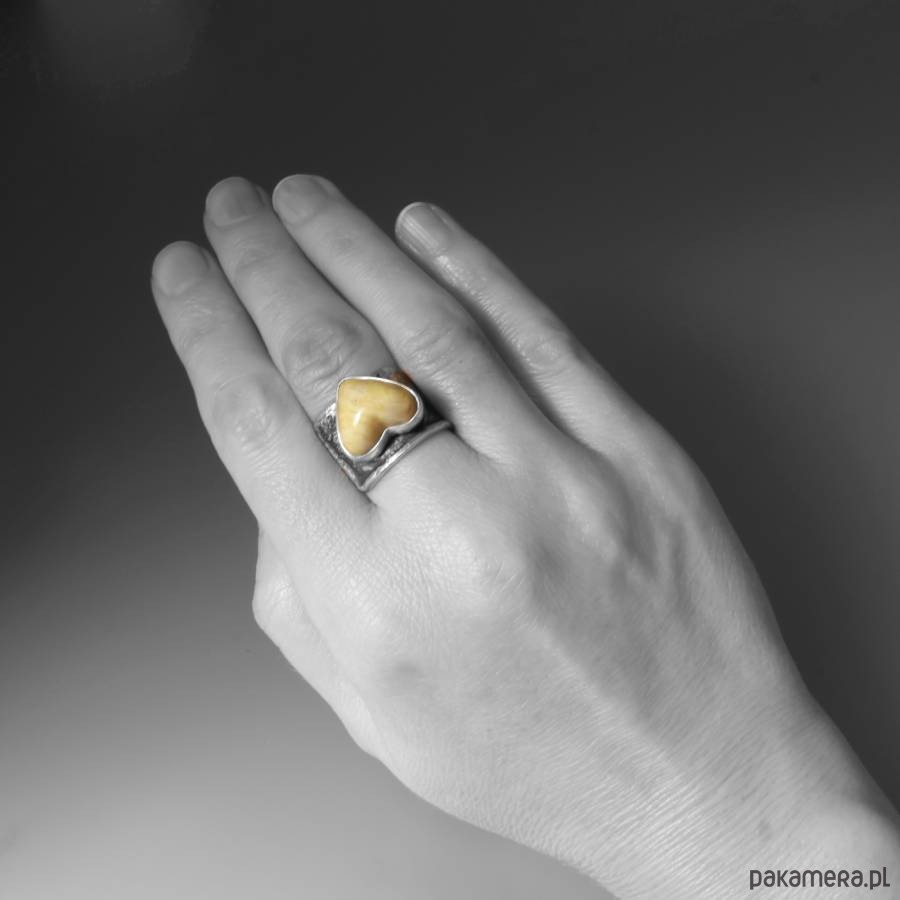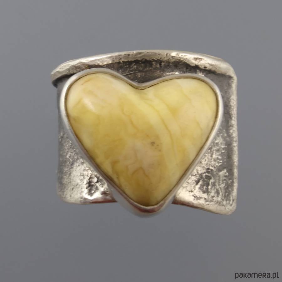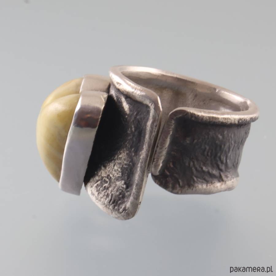 Ręcznie wykonany srebrny pierścionek z bursztynem. Srebro próby 925 - próba wybita na spodzie. Obrączka w najszerszym miejscu: 1,6 cm. Wymiary bursztynu: 1,6 cm x 1,4 cm. Rozmiar obrączki regulowany w zakresie od 14 (średnica wewnętrzna 17,00 mm) do 16 (średnica wewnętrzna 17,6 mm). Waga pierścionka: 7,5 g.
