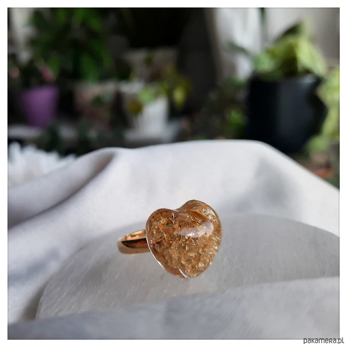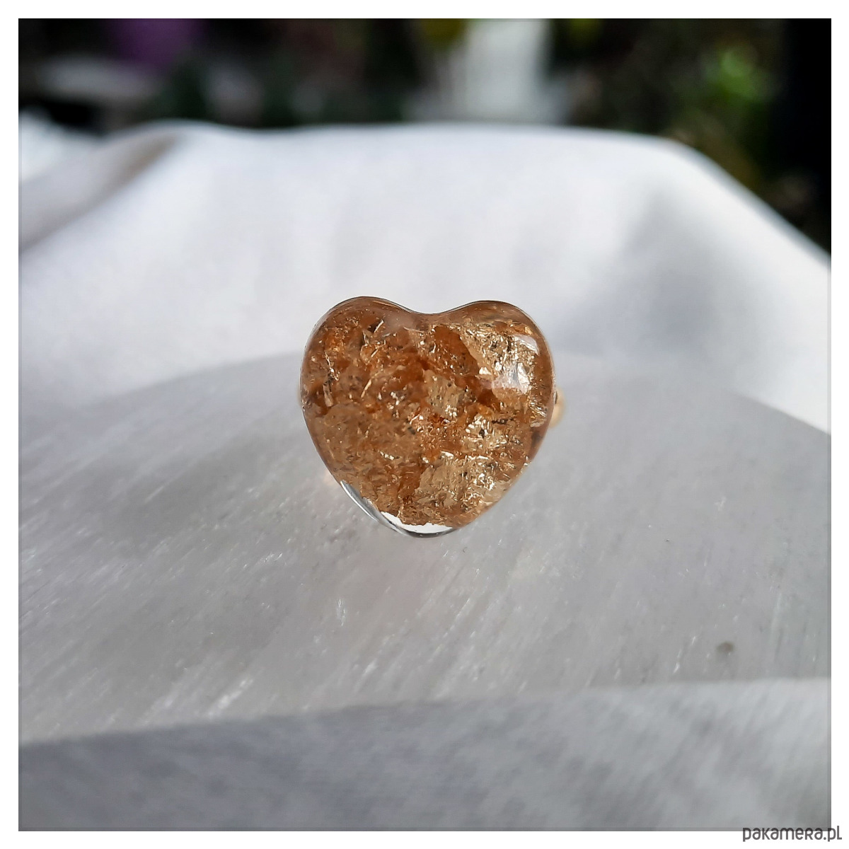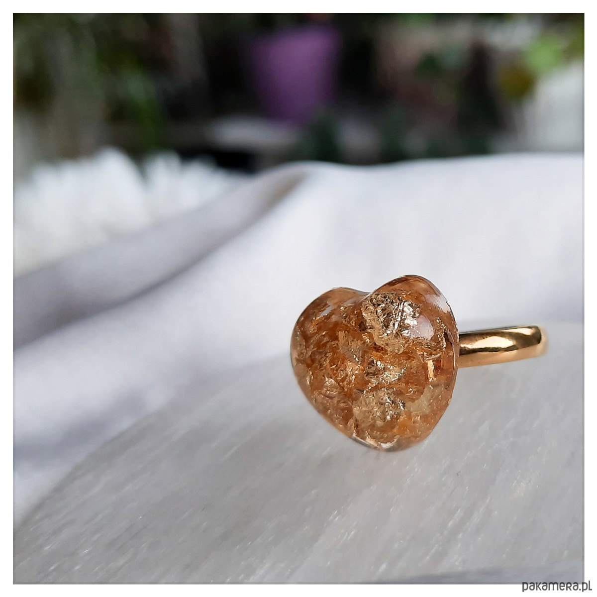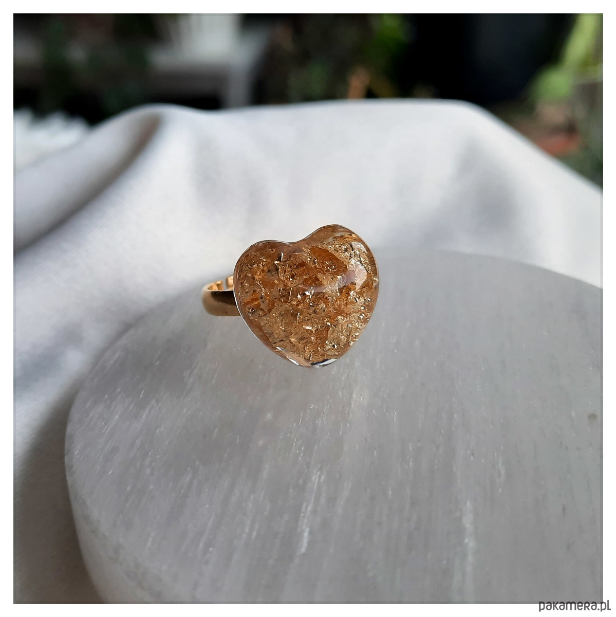 Pierścionek serce z zatopionymi w żywicy epoksydowej drobinkami w kolorze złota.
