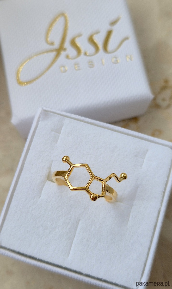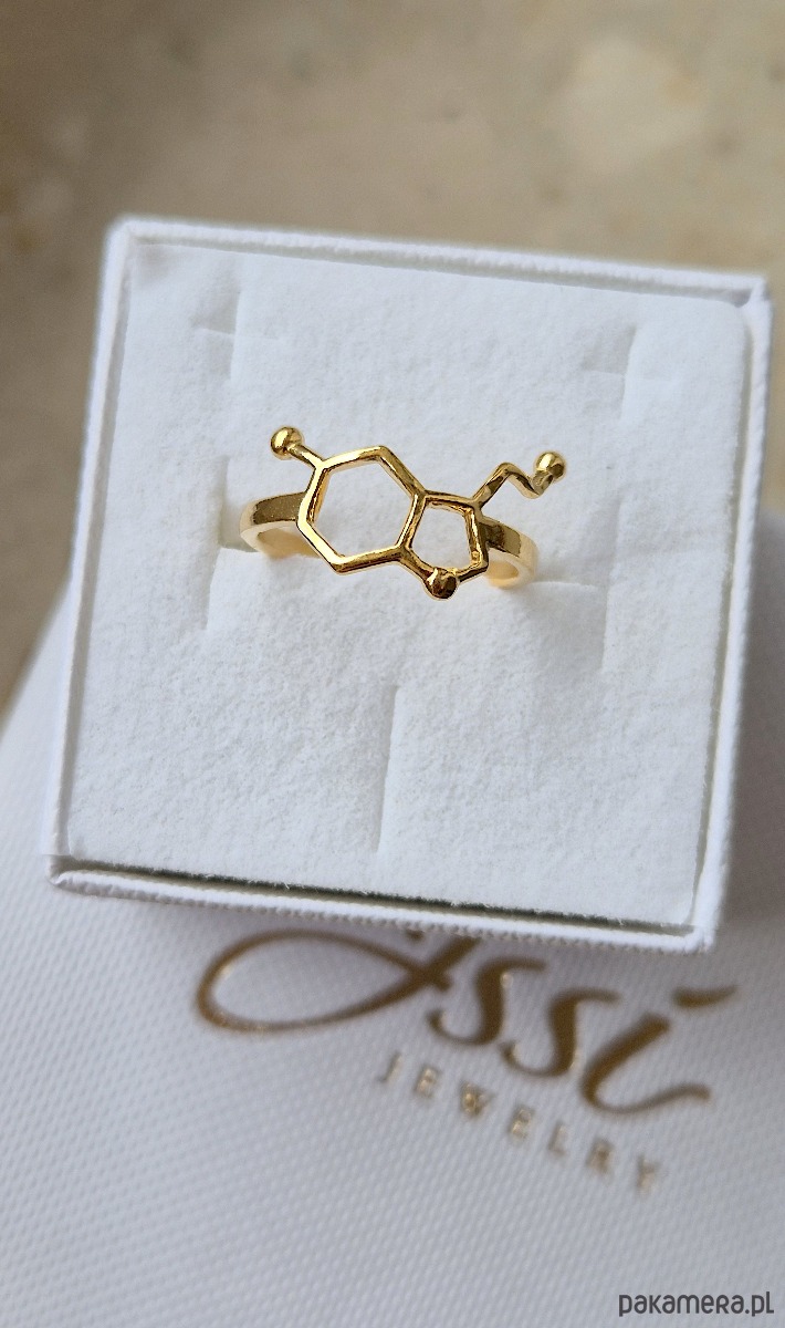 Delikatny pierścionek ze wzorem strukturalnym serotoniny, wykonany ze srebra próby 925 pokrytego 24 karatowym złotem.