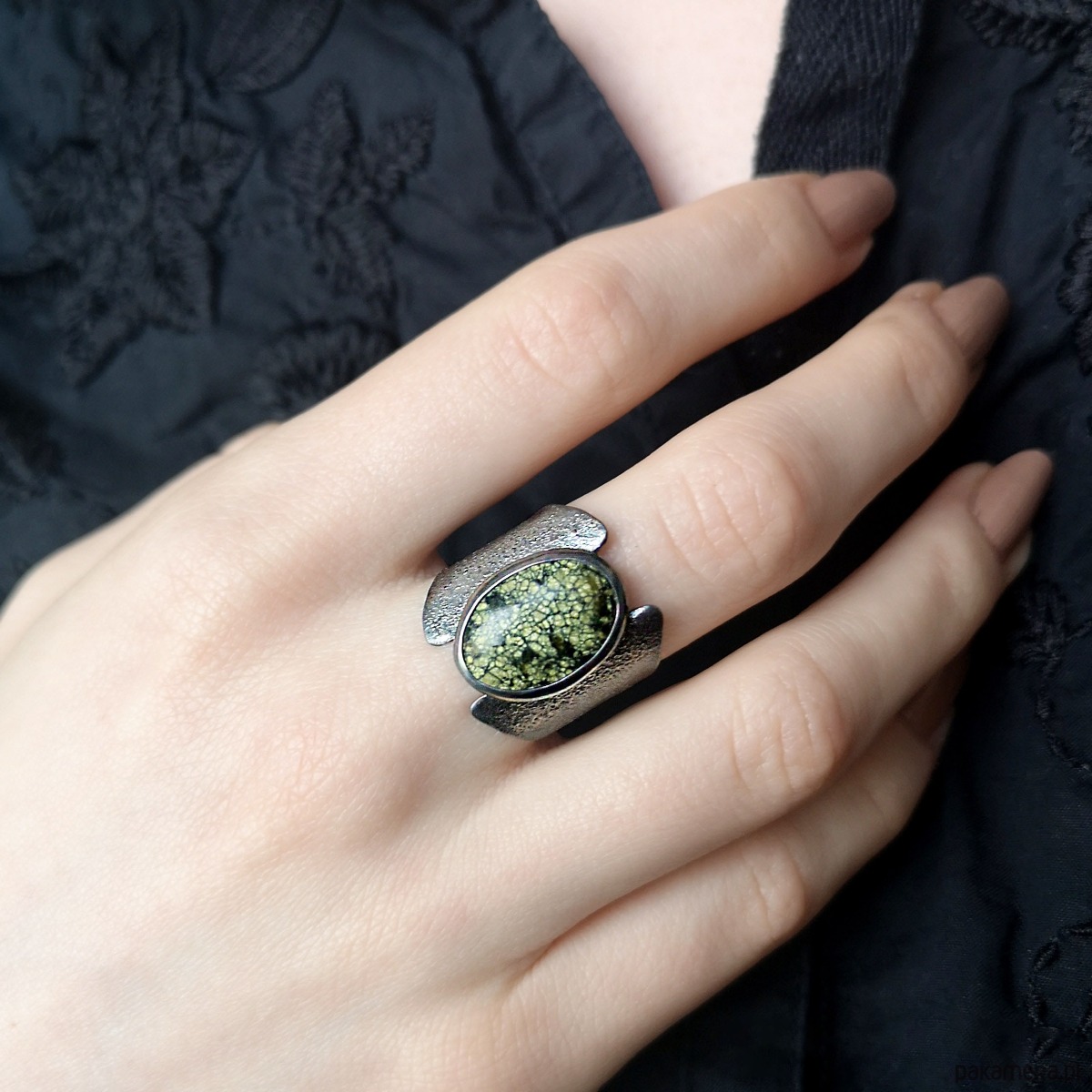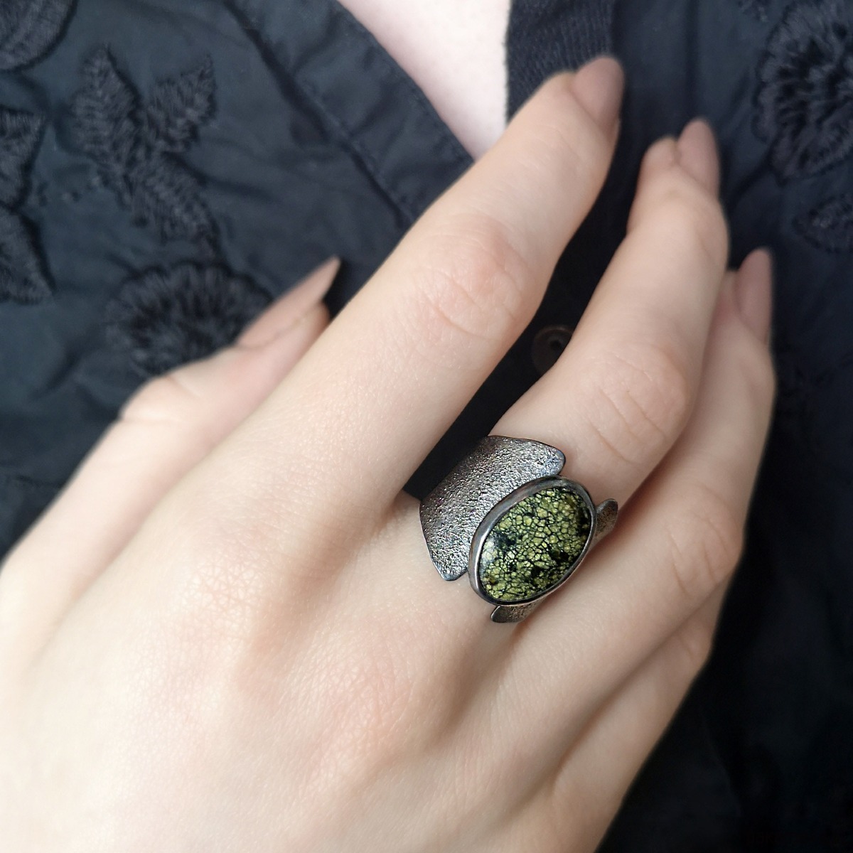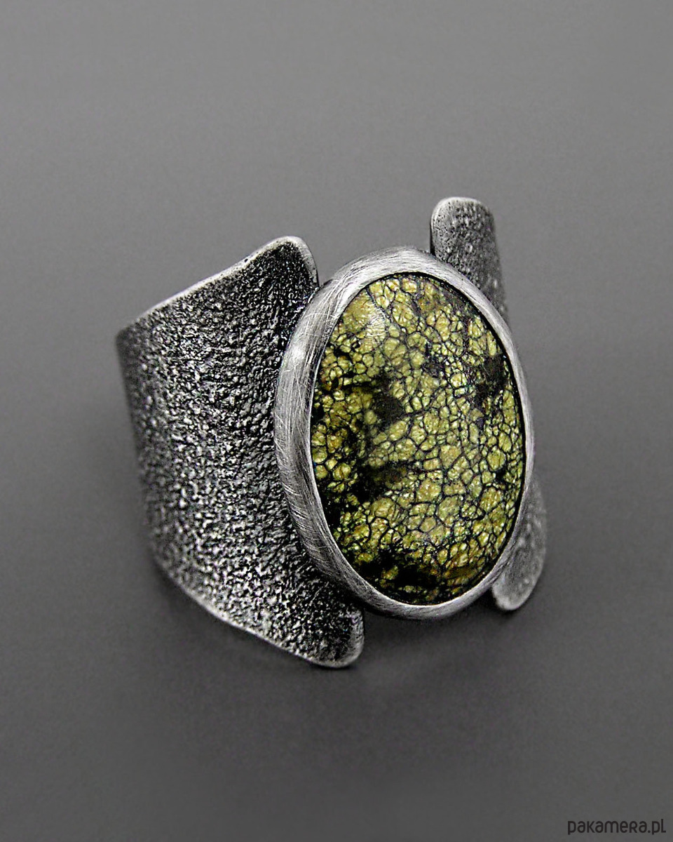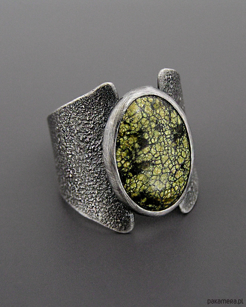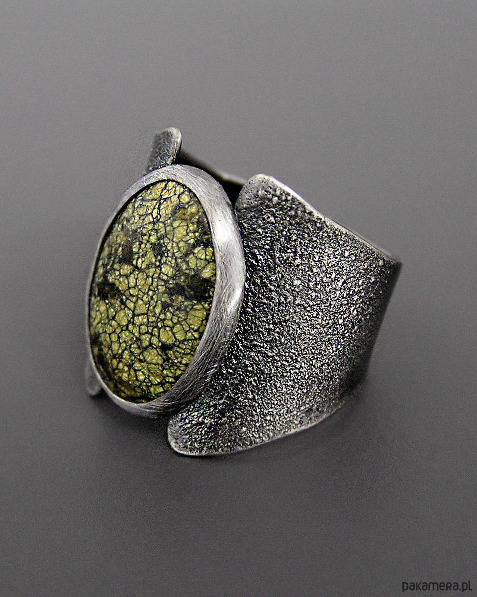 Unikatowy surowy pierścionek z Serpentynitem - wykonany z flamowanego srebra 925. Patynowany i szczotkowany.