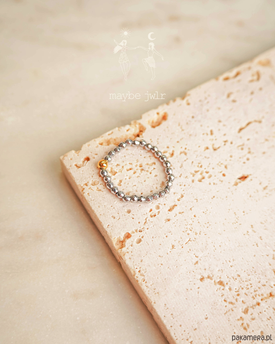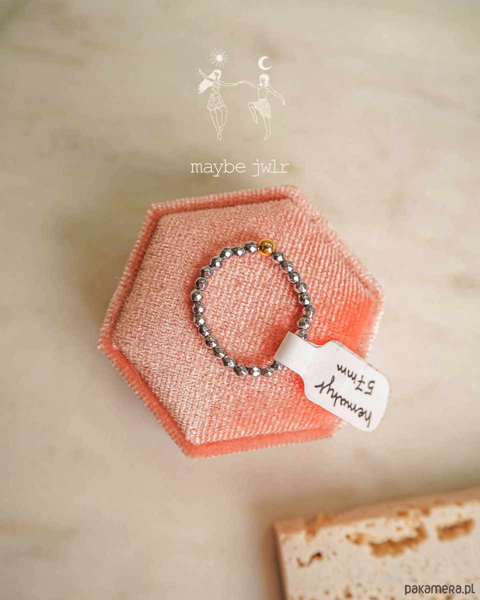 Pierścionek jest w całości zrobiony z kamieni naturalnych, a zakończony jest pozłoconą kuleczką ze