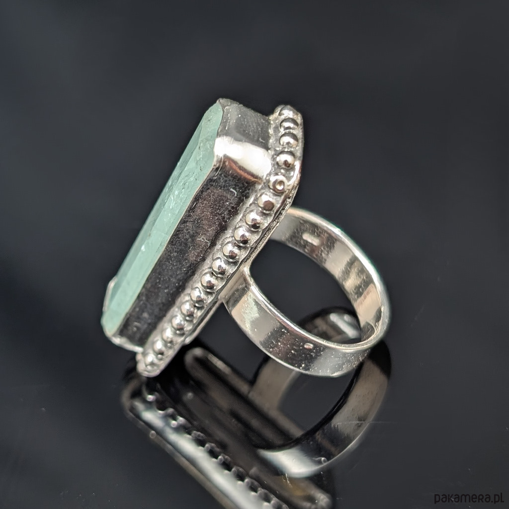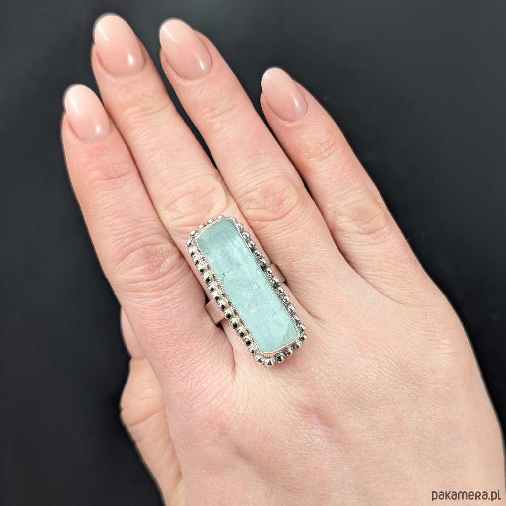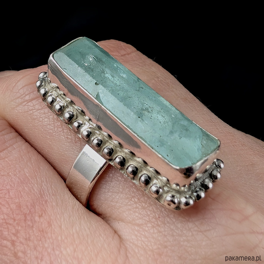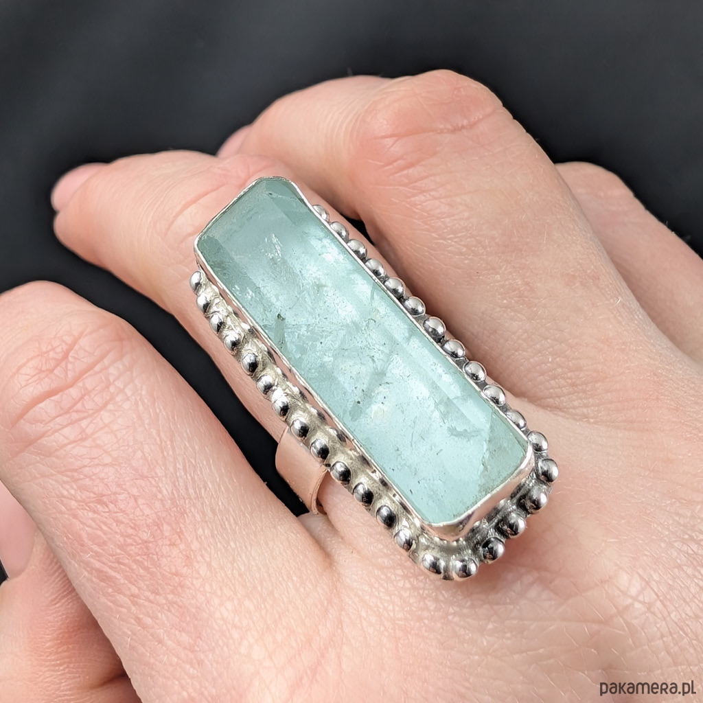 Okazały pierścień z oprawionym w srebro pr.925 przepięknym, świetlistym akwamarynem. Kolor niesamowity! Gładka tafla. Oprawa 37 x 16 mm, rozmiar jubilerski 17 mogę powiększyć do max rozmiaru 20. Proszę napisać na jaki rozmiar dopasować. Obrączka o szerokości 5 mm. Waga 17 gramów. Pierścień zostanie zapakowany w ozdobne pudełeczko.