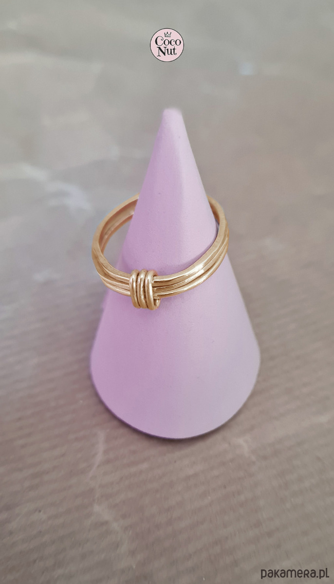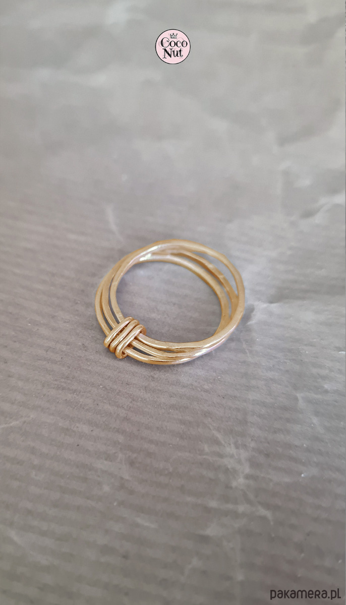 Komplet 3 młotkowanych (nierównych) obrączek ze srebra (złocone) o szerokości ok. 1 mm, obrączki połączone są opaską o szerokości 3 mm. Po zakupie prosimy podać rozmiar palca.