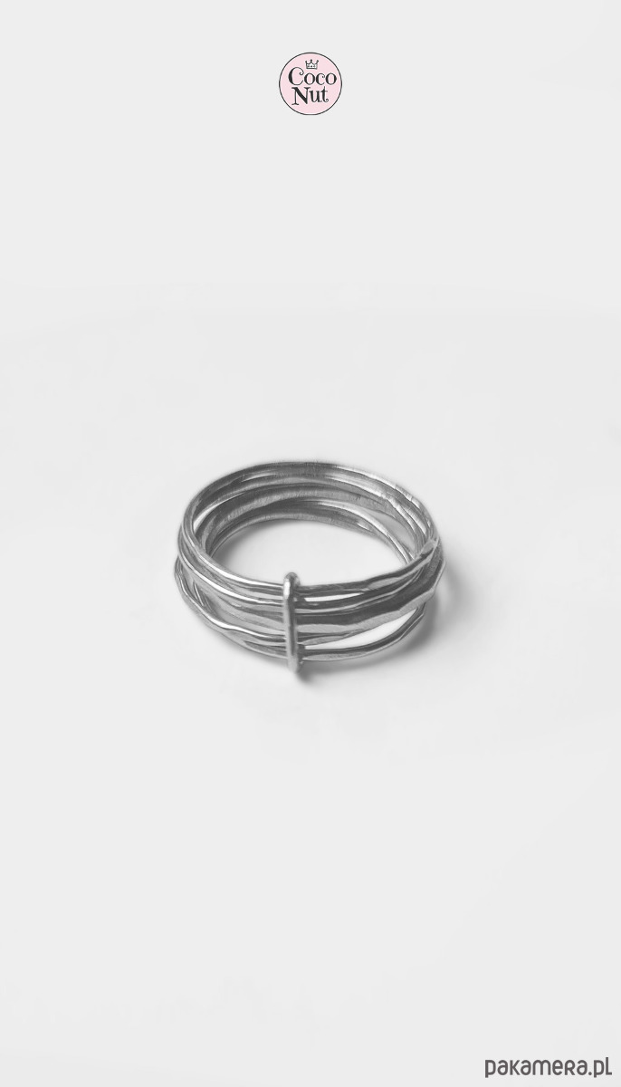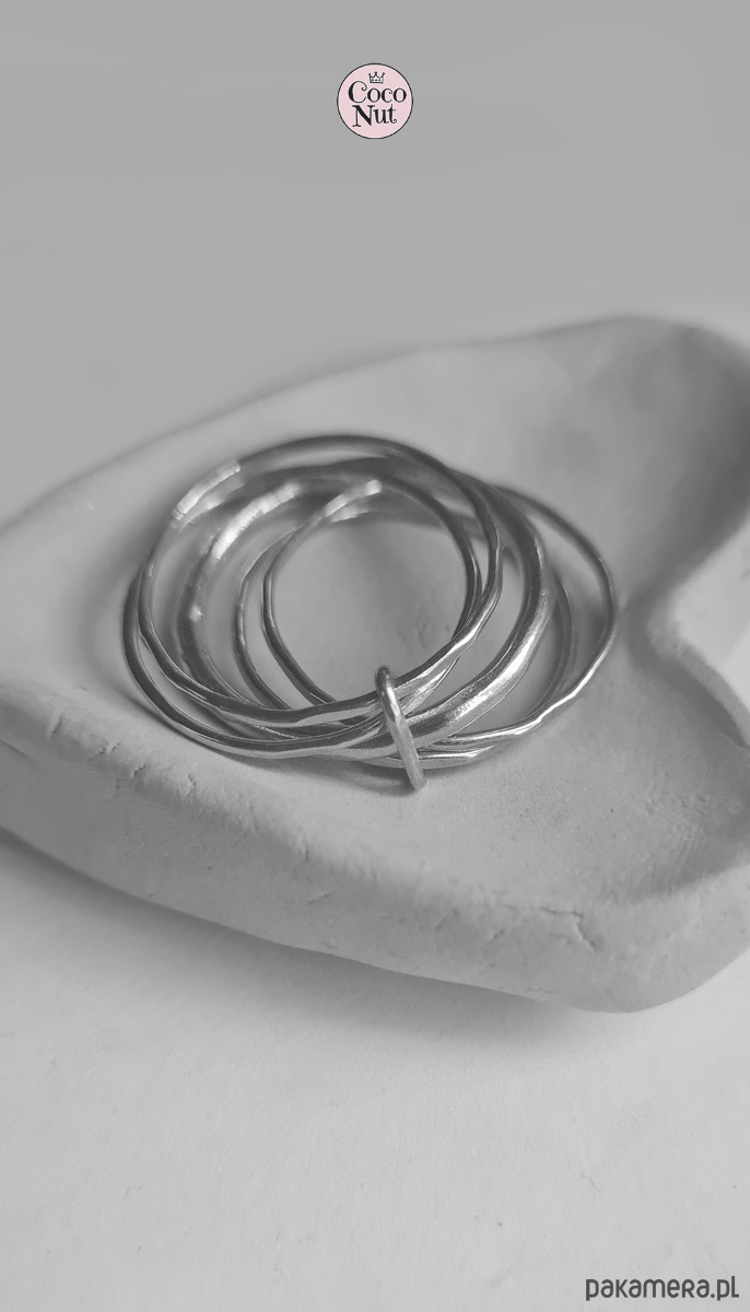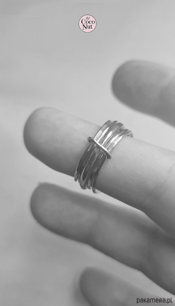 Komplet 5 młotkowanych (nierównych) obrączek ze srebra o szerokości ok. 1 mm, środkowa obrączka 2mm. Obrączki połączone są opaską o szerokości 1 mm. Po zakupie prosimy podać rozmiar palca.
