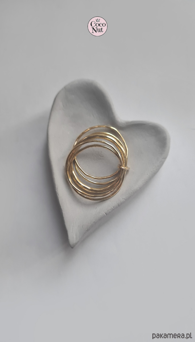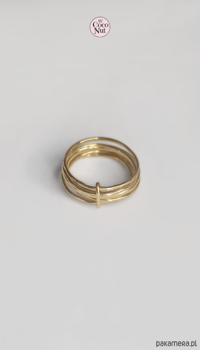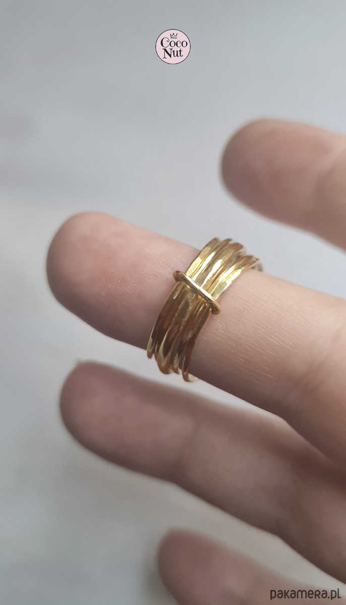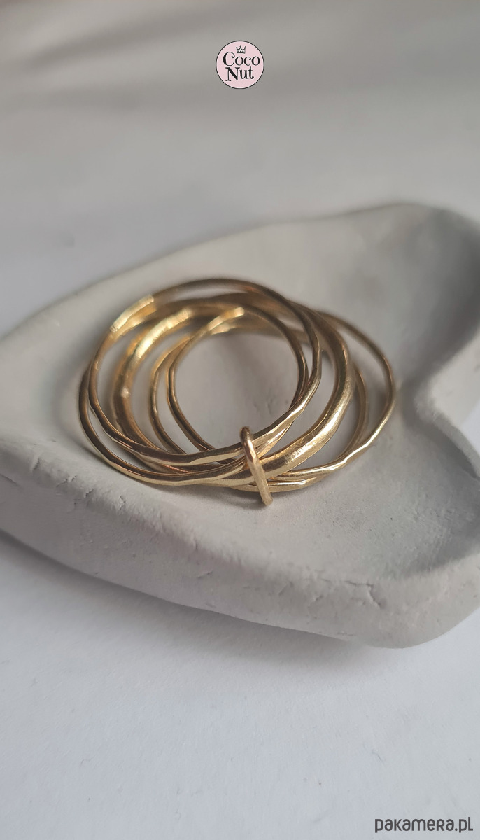 Komplet 5 młotkowanych (nierównych) obrączek ze srebra (srebro złocone = pokryte cienką warstwą złota) o szerokości ok. 1 mm, środkowa obrączka 2mm. Obrączki połączone są opaską o szerokości 1 mm.