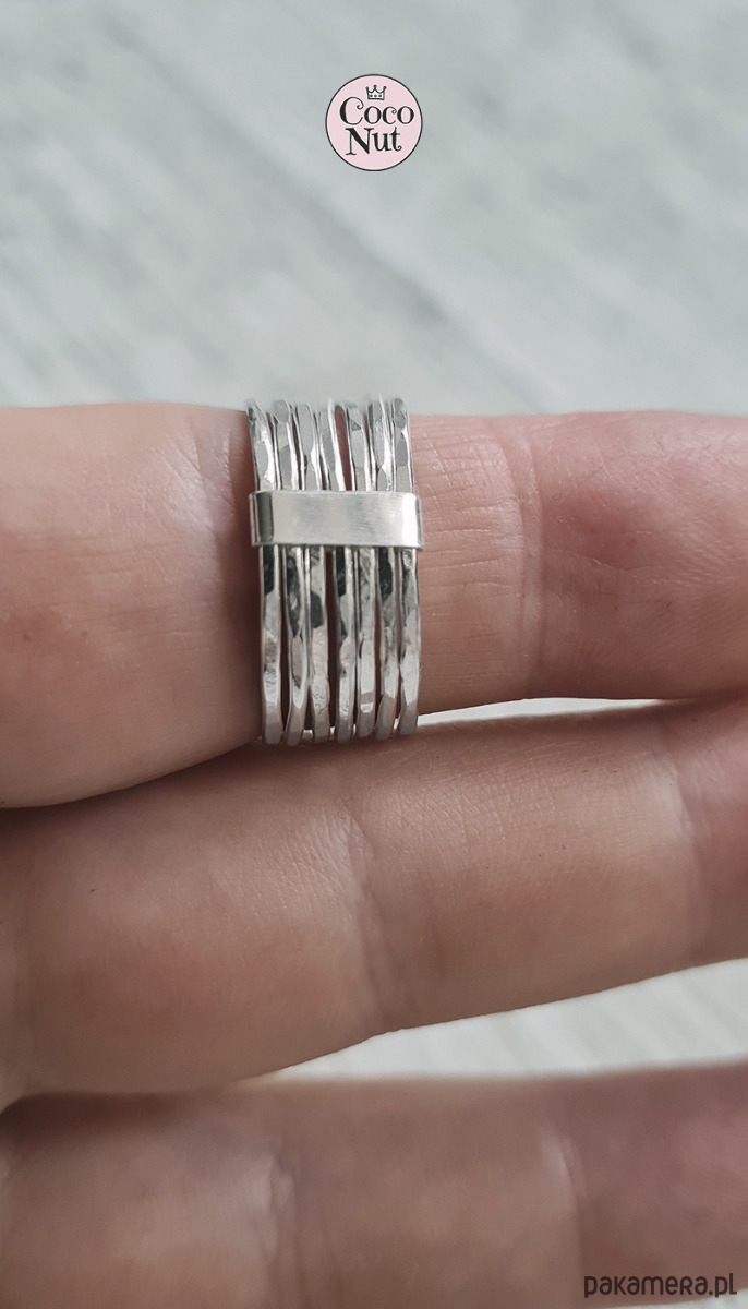 Komplet 7 cienkich młotkowanych (nierównych) obrączek ze srebra o szerokości ok. 1 mm,