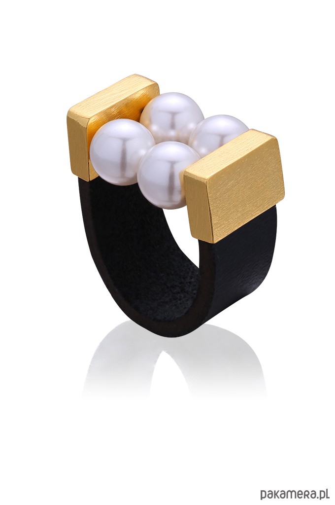 Pierścionek wykonany z czarnej skóry naturalnej oraz białych pereł Swarovskiego w rozm. 8 mm. Okucia mosiężne, ręcznie szlifowane, pozłocone 24ct złotem. Szerokość paska skórzanego 10 mm.