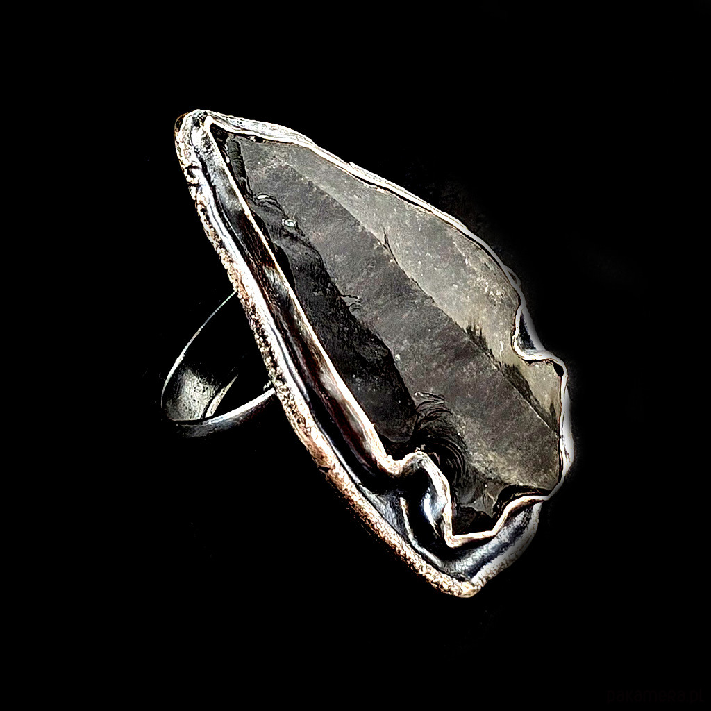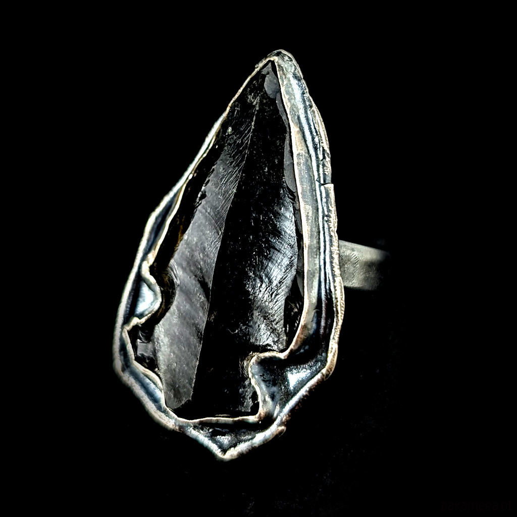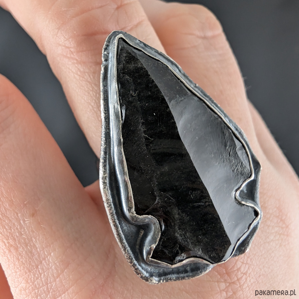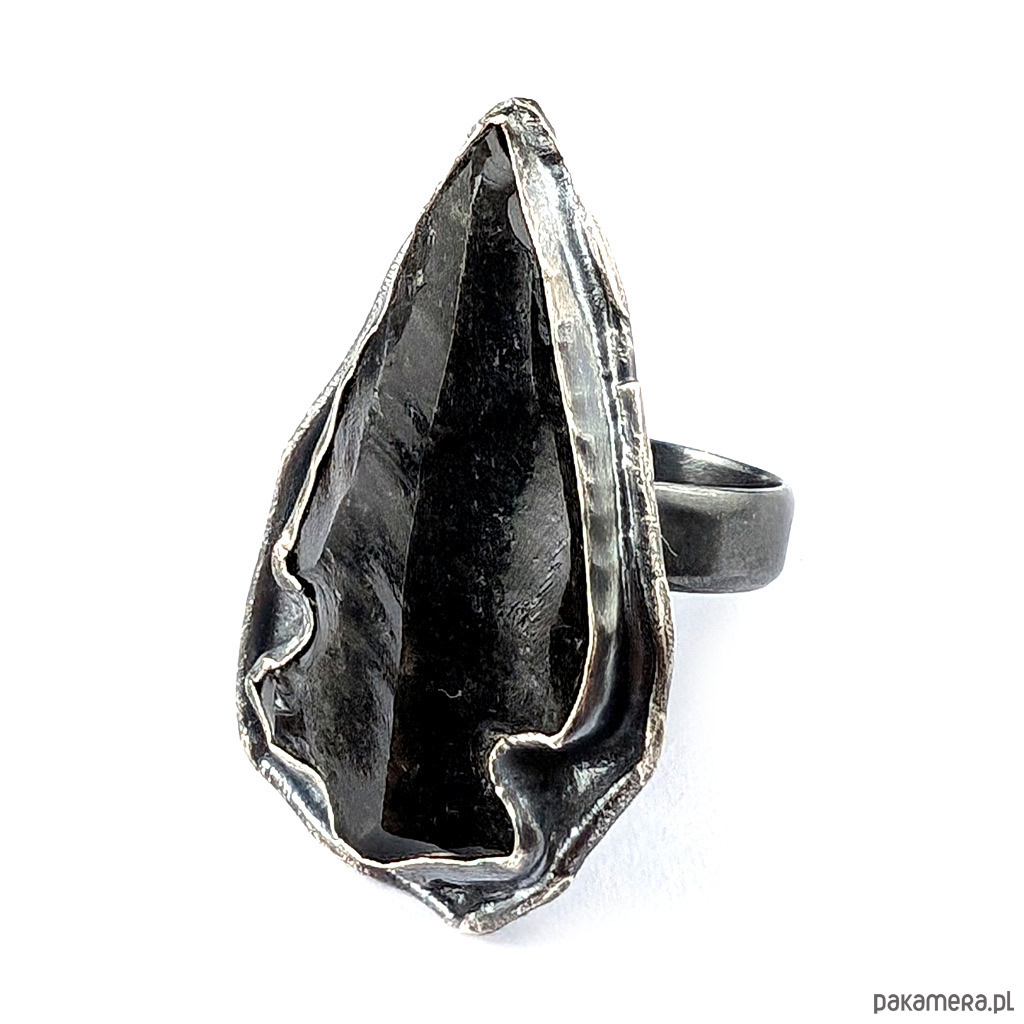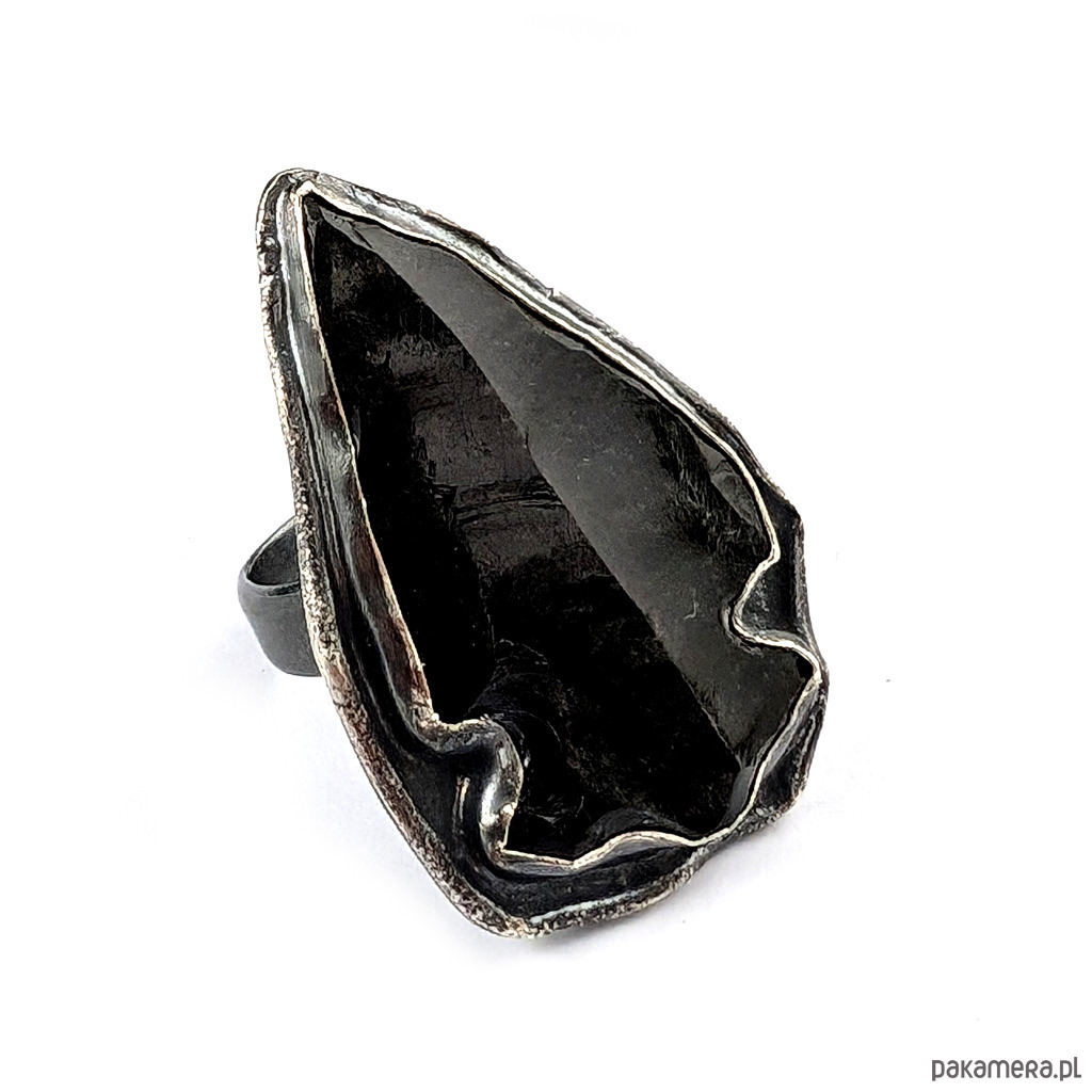 Gratka dla fanów "Gry o tron":) Pierścień wykonany ze rebra próby 925 oraz obsydianu (skały złożonej niemal w całości ze szkliwa lawowego). W powieści G.R.R.Martina "Pieść Lodu i Ognia" obsydian, zwany smoczym szkłem lub zamrożonym ogniem,był niezwykle cenną bronią w walce z Innymi. Wymiary oprawy pierścienia 40 x 27 mm. Oprawa oksydowana. Waga 14 g. Rozmiar regulowany w szerokim zakresie. Obrączka ma 5 mm szer. Pierścień zapakowany w ozdobne pudełeczko
