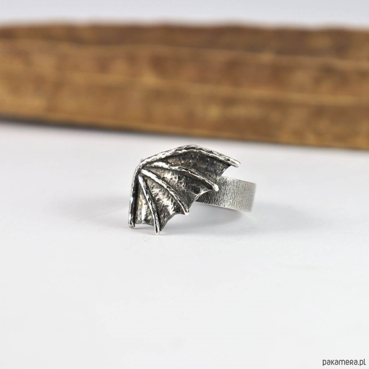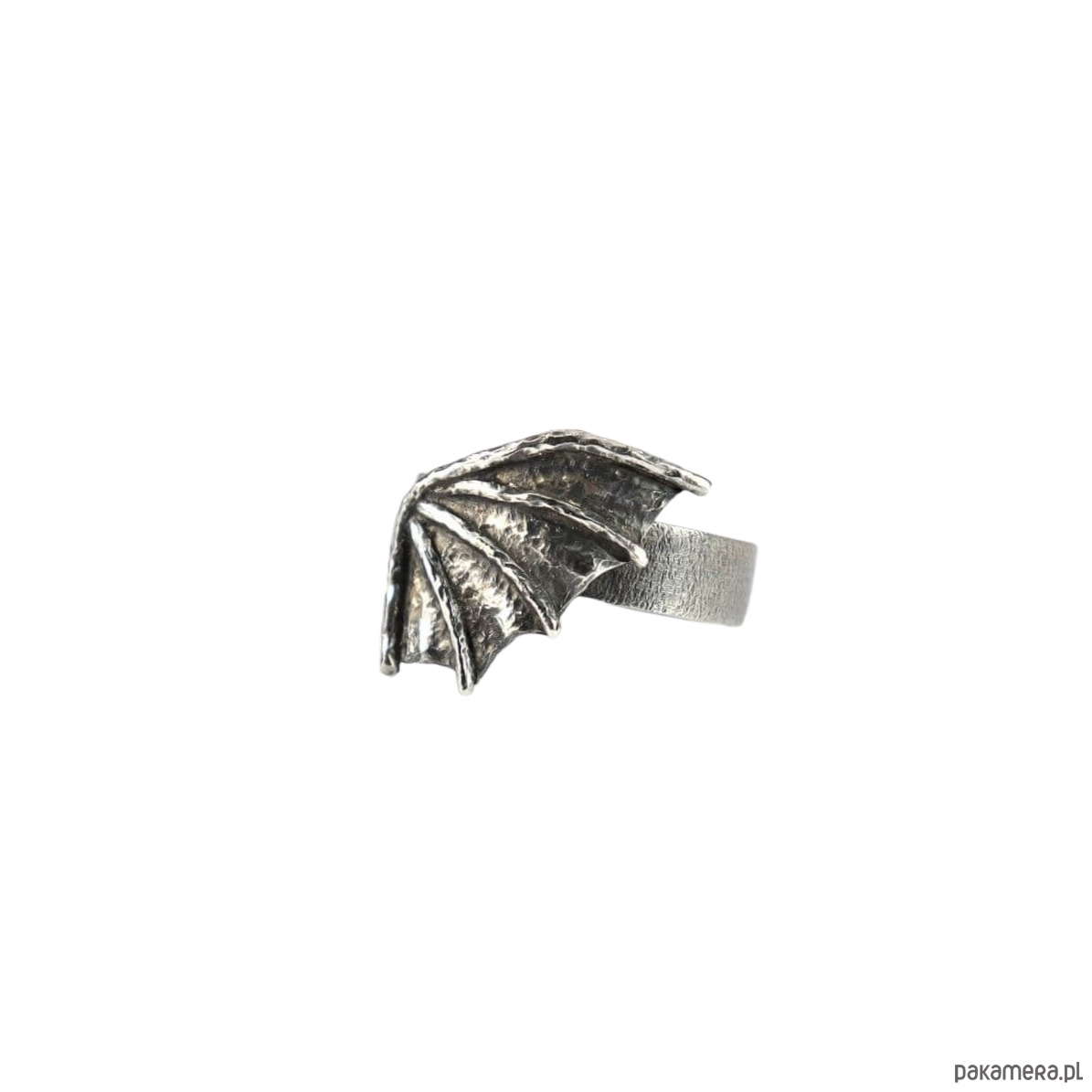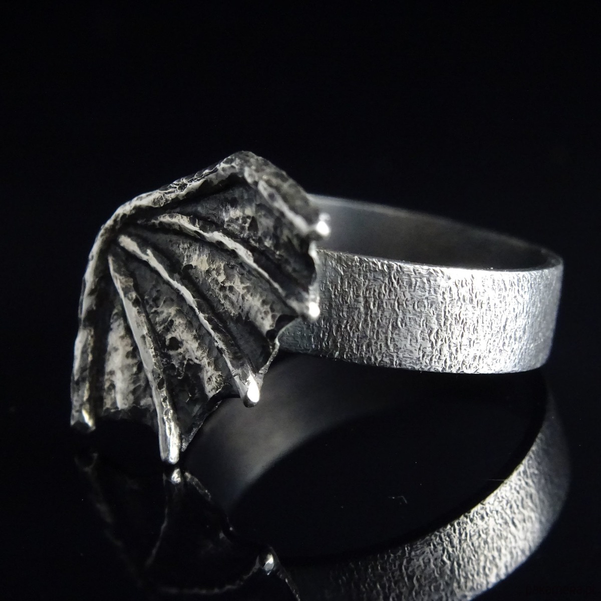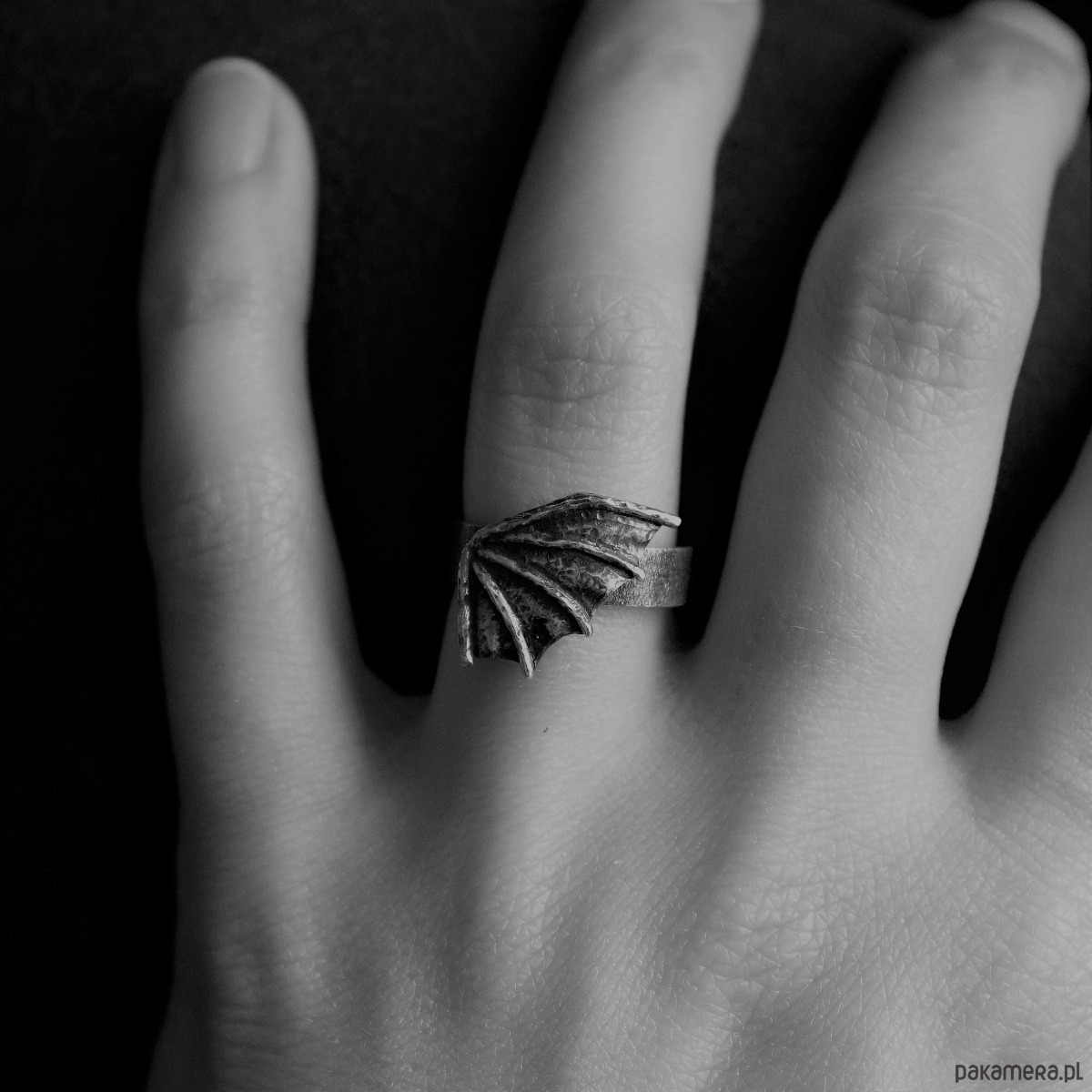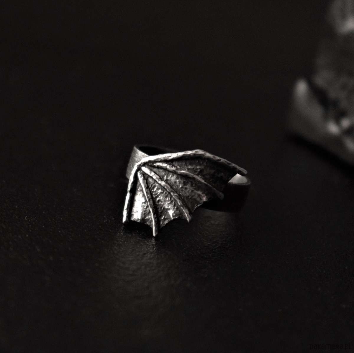 Mały, surowy pierścionek w kształcie smoczego skrzydła. Autorski projekt i wykonanie ze srebra pr. 925, które zostało przyciemnione i przetarte dla stworzenia bardziej mrocznego charakteru. W wiadomości do zamówienia proszę o podanie rozmiaru lub obwodu palca.