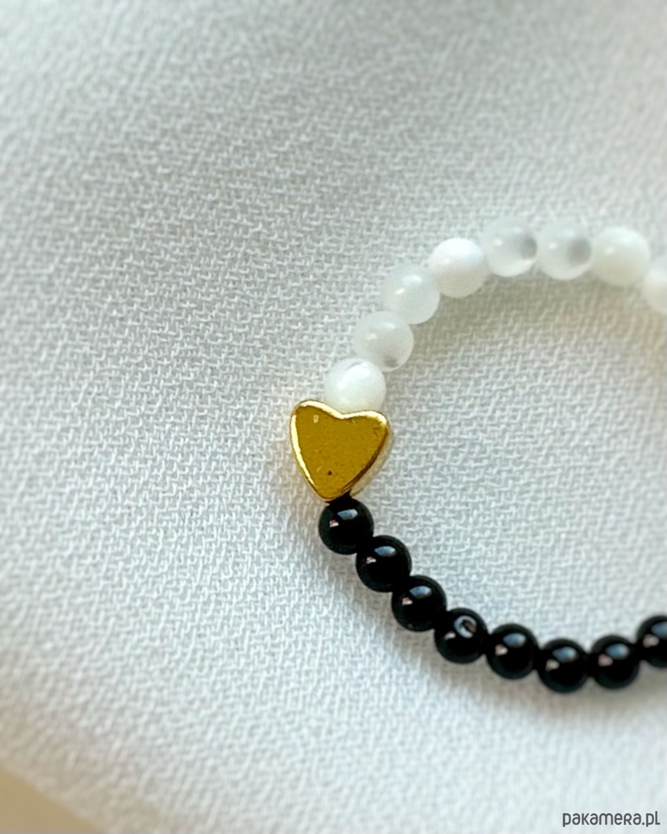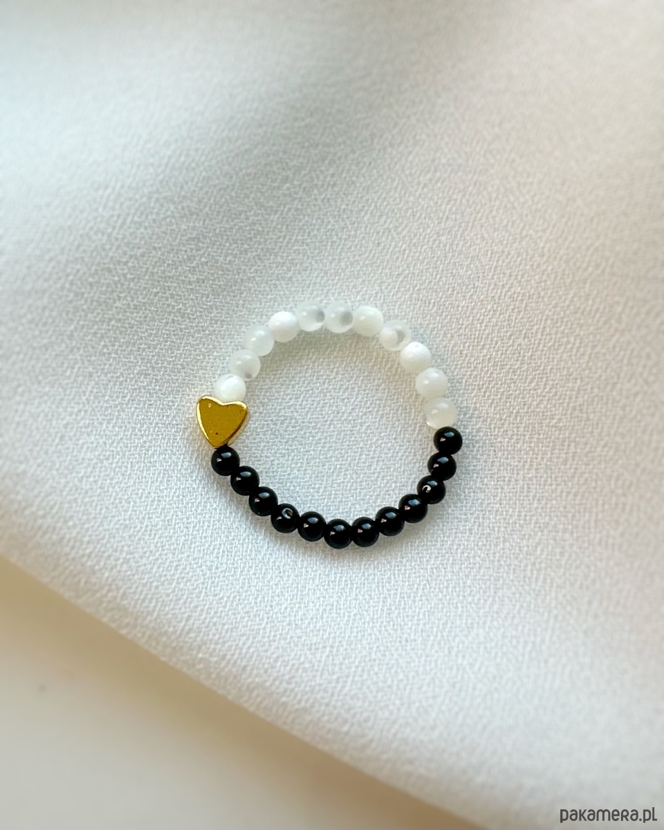 Czarno-biały pierścionek z delikatnym serduszkiem ze złotego hematytu. Czarny spinel i biała masa perłowa - yin yang. Elegancki i klasyczny✨