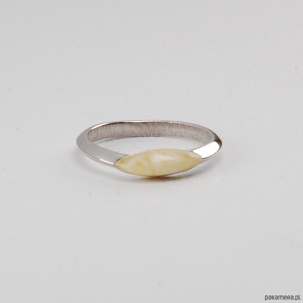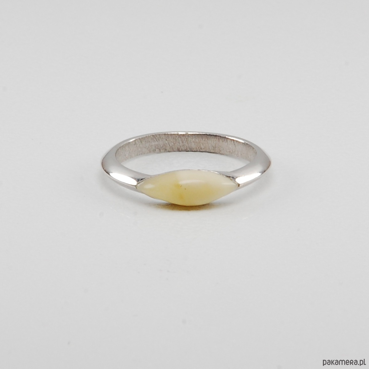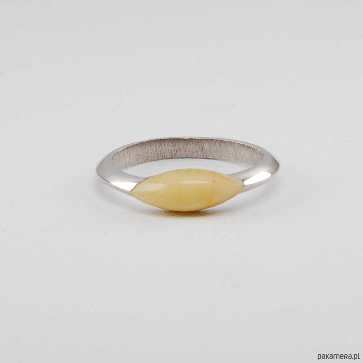 Minimalistyczna obrączka Split wykonana ze srebra i mlecznego bursztynu bałtyckiego. Sebro zostało pokryte rodem, dzięki czemu nie ciemnieje.