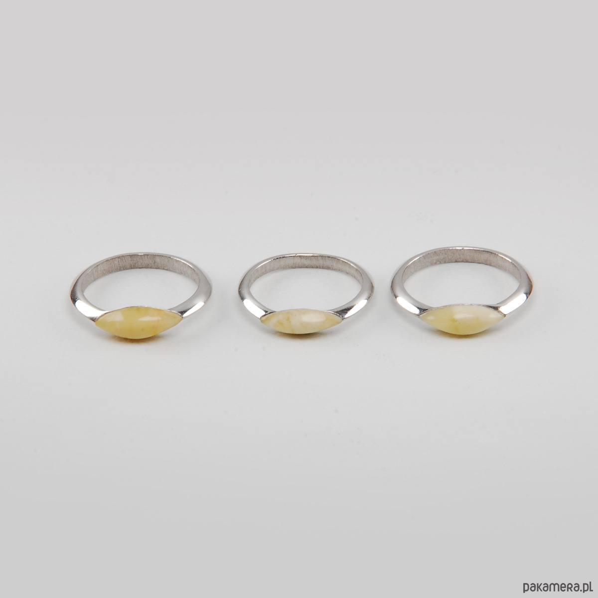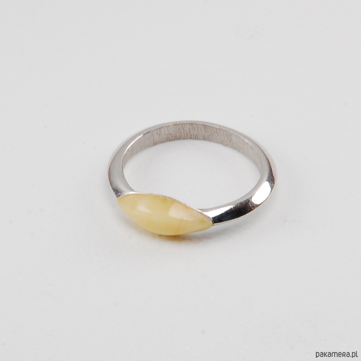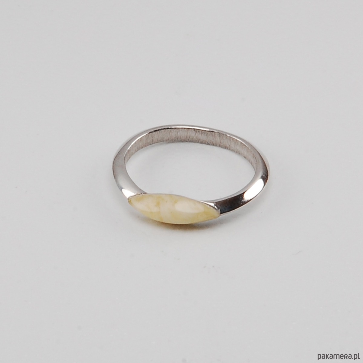 Minimalistyczna obrączka Split wykonana ze srebra i mlecznego bursztynu bałtyckiego. Sebro zostało pokryte rodem, dzięki czemu nie ciemnieje.