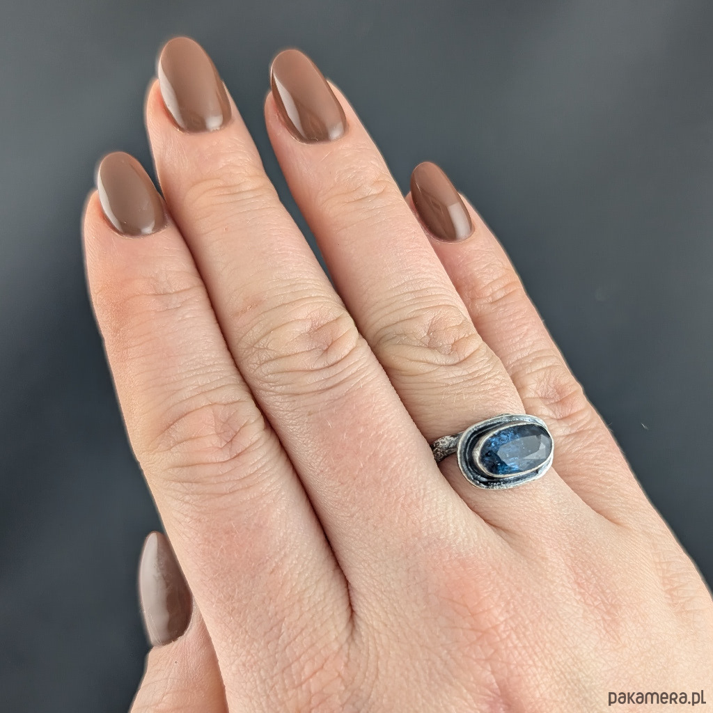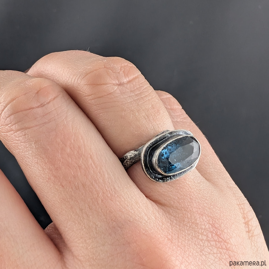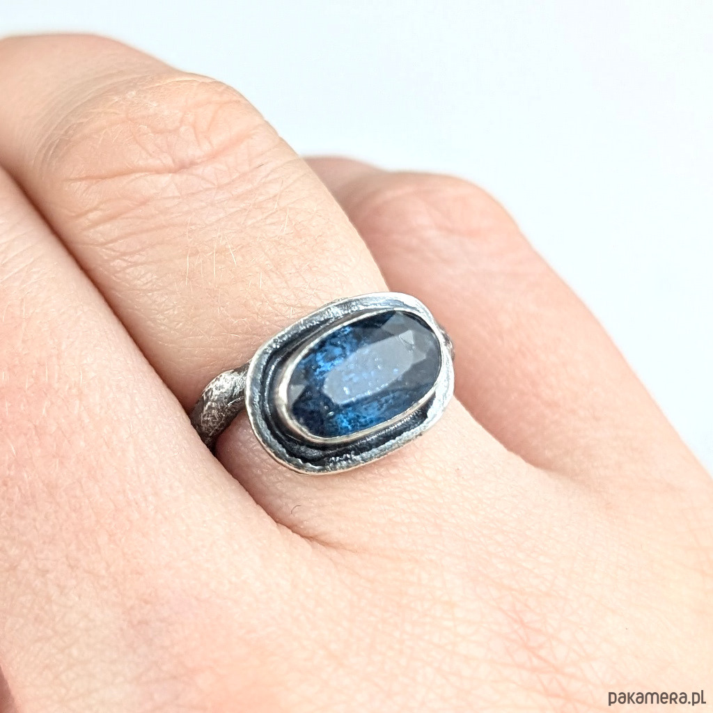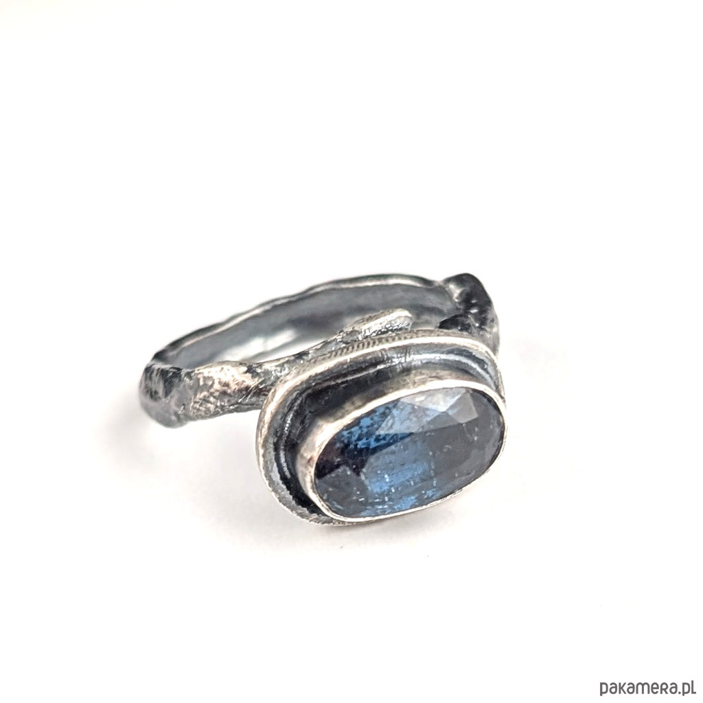 Pierścionek wykonany ze srebra próby 925, oksydowane, przetarte, fakturowane. Rozmiar pierścionka dzięki otwartej podstawie regulowany, z mogę dopasować na dowolny rozmiar w zakresie 9-23. Proszę napisać, na jaki ustawić. Ozdobą pierścionka jest piękny, świetlisty kyanit. Wymiary oprawy kamienia 14 x 11 mm, szerokość maksymalna obrączki 6 mm, min. 4 mm. Waga 6,16 g. Pierścień zostanie zapakowany w ozdobne pudełeczko.