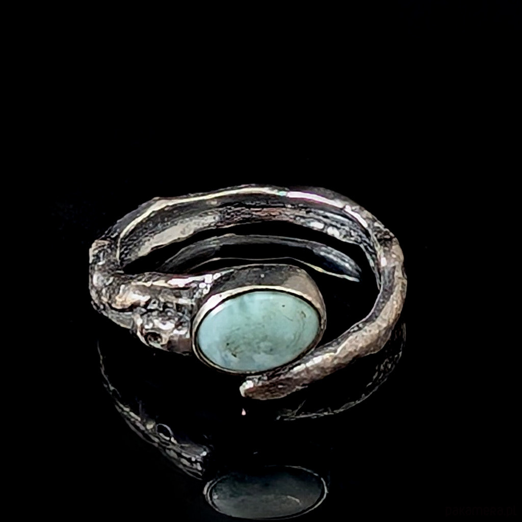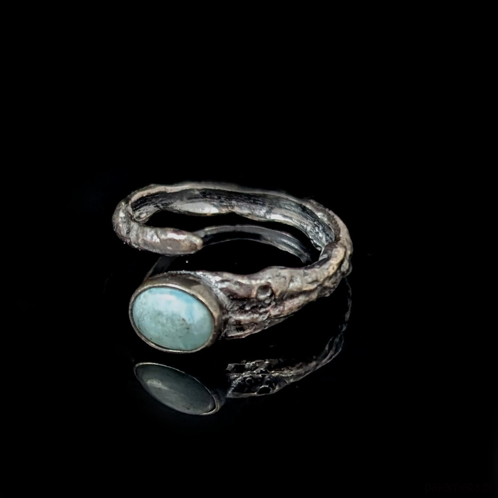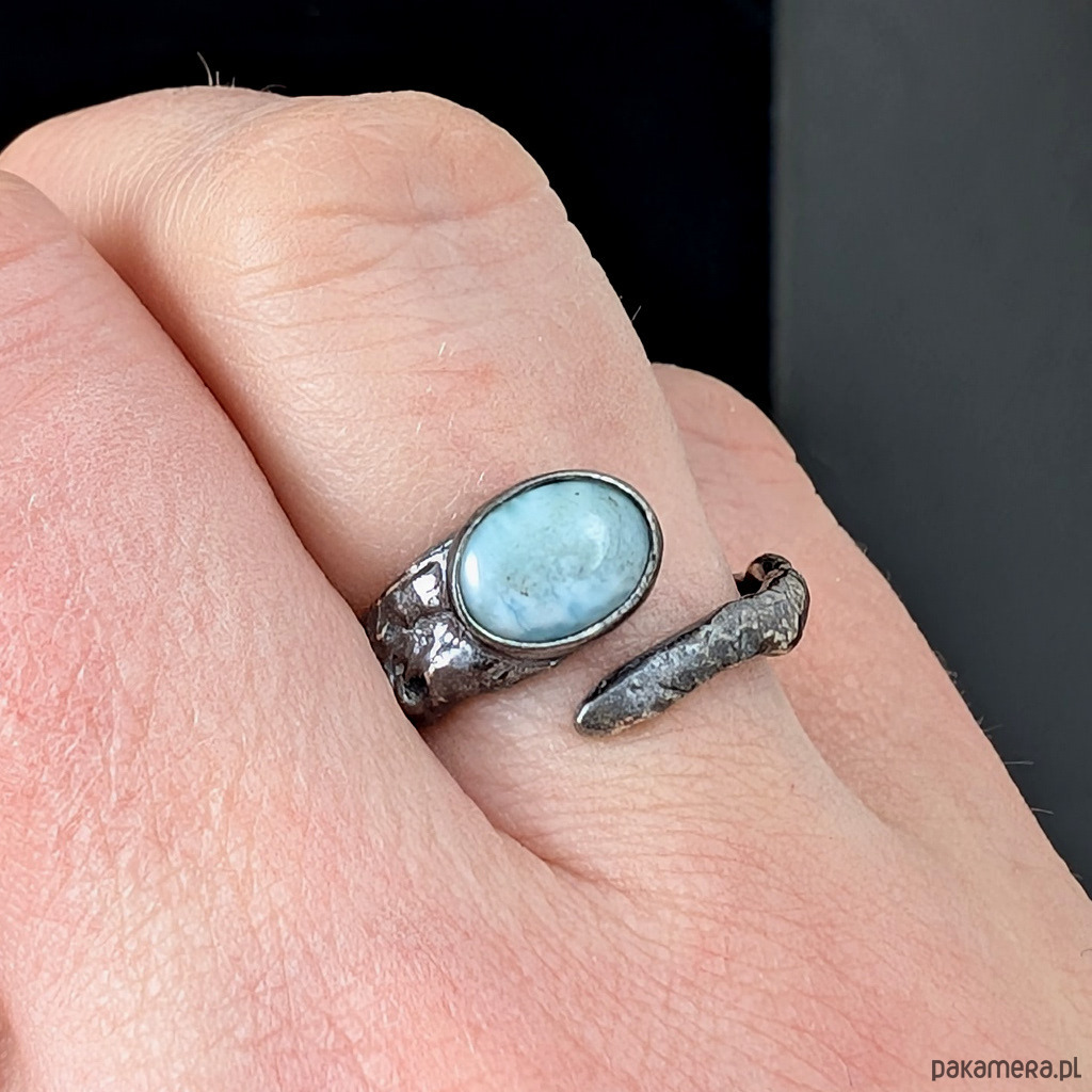 Pierścień wykonany z oksydowanego srebra próby 925. Rozmiar pierścionka regulowany, dopasuję w zakresie 9-22. Ozdobą pierścionka jest larimar o miętowej barwie, Wymiary oprawy kamienia 7 x 9 mm, szerokość maksymalna obrączki 6 mm, min. 4 mm. Waga 4 g. Pierścień zostanie zapakowany w ozdobne pudełeczko.