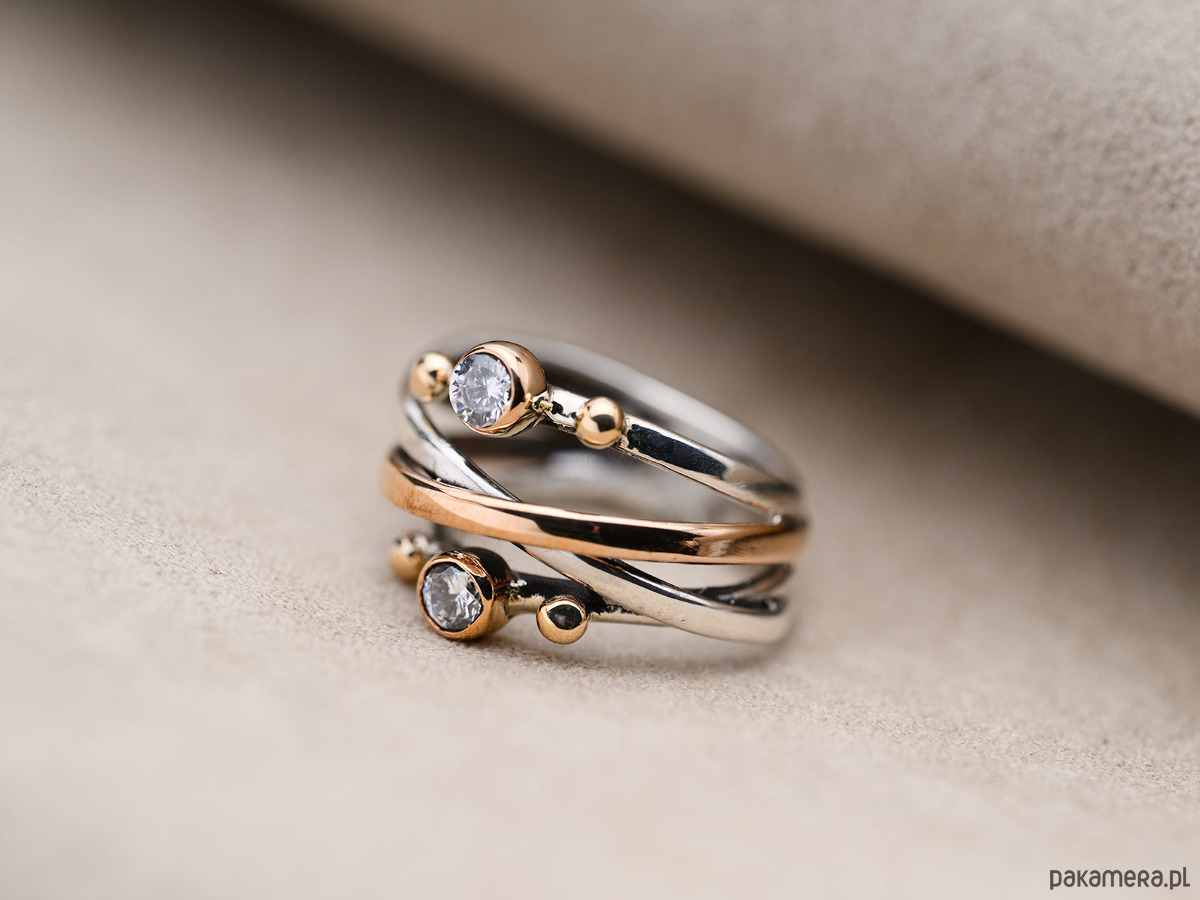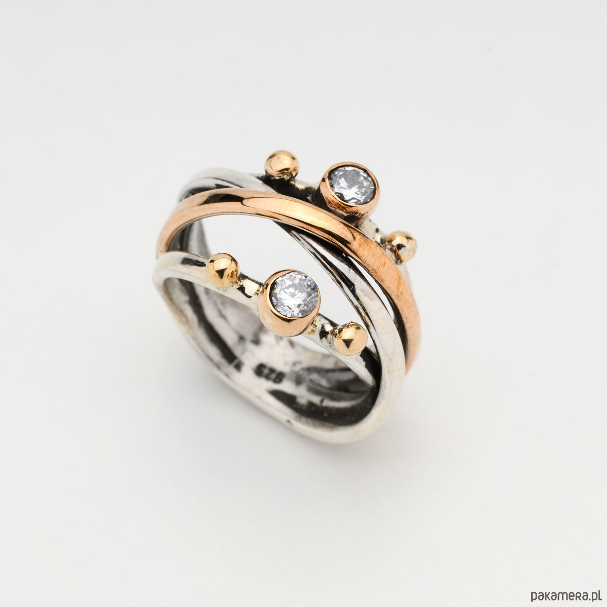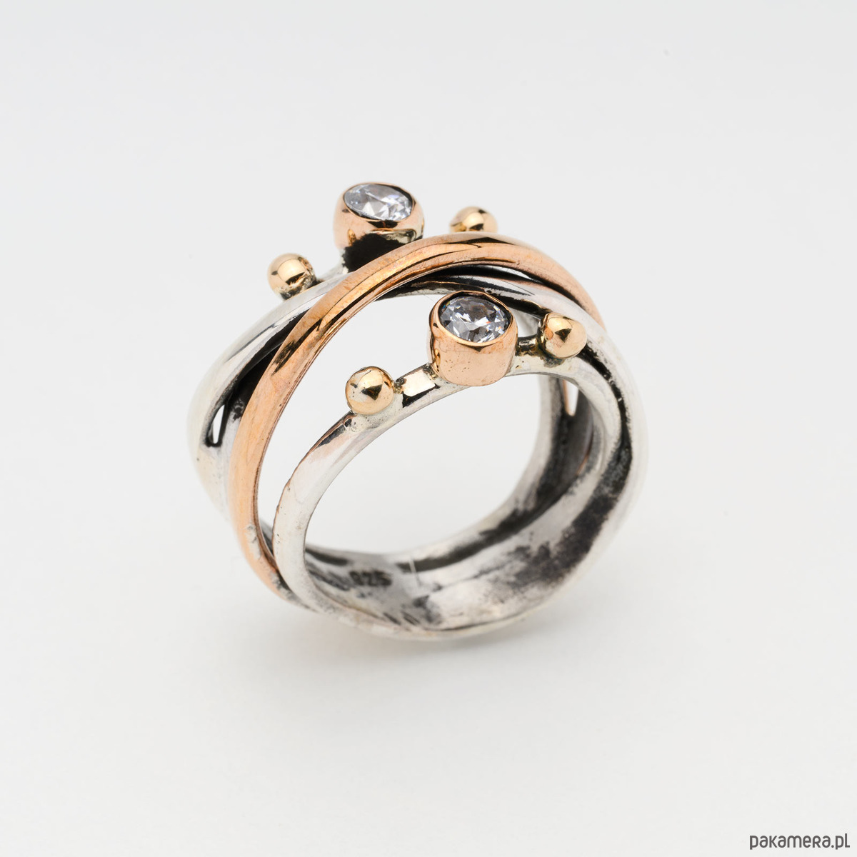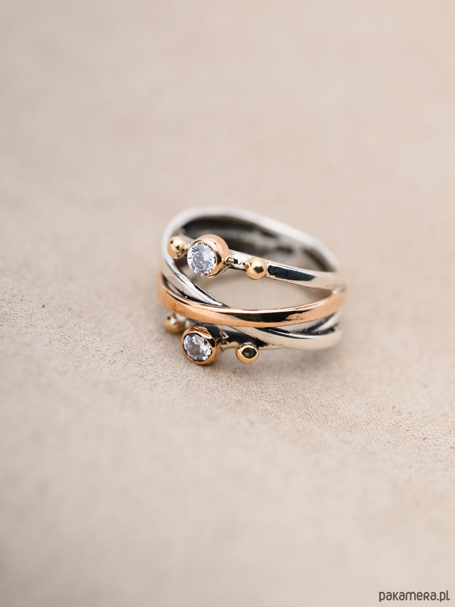 Pierścionek zdobią cztery delikatne obrączki, wykonane z polerowanego srebra, które subtelnie się krzyżują, tworząc dynamiczną i interesującą formę. Jedna z obrączek ma kolor srebrny, pozłacany różowym złotem, co dodaje całości ciepłego i modnego akcentu.