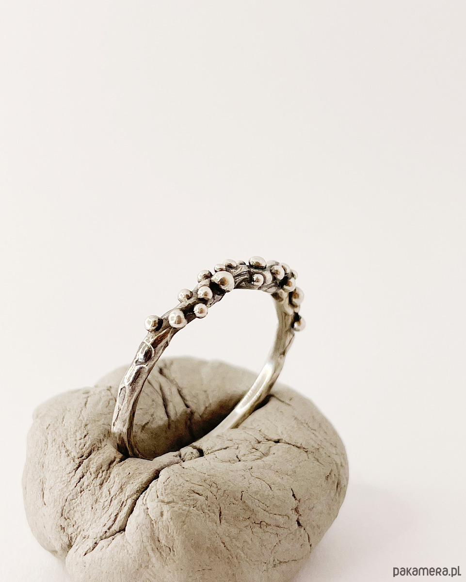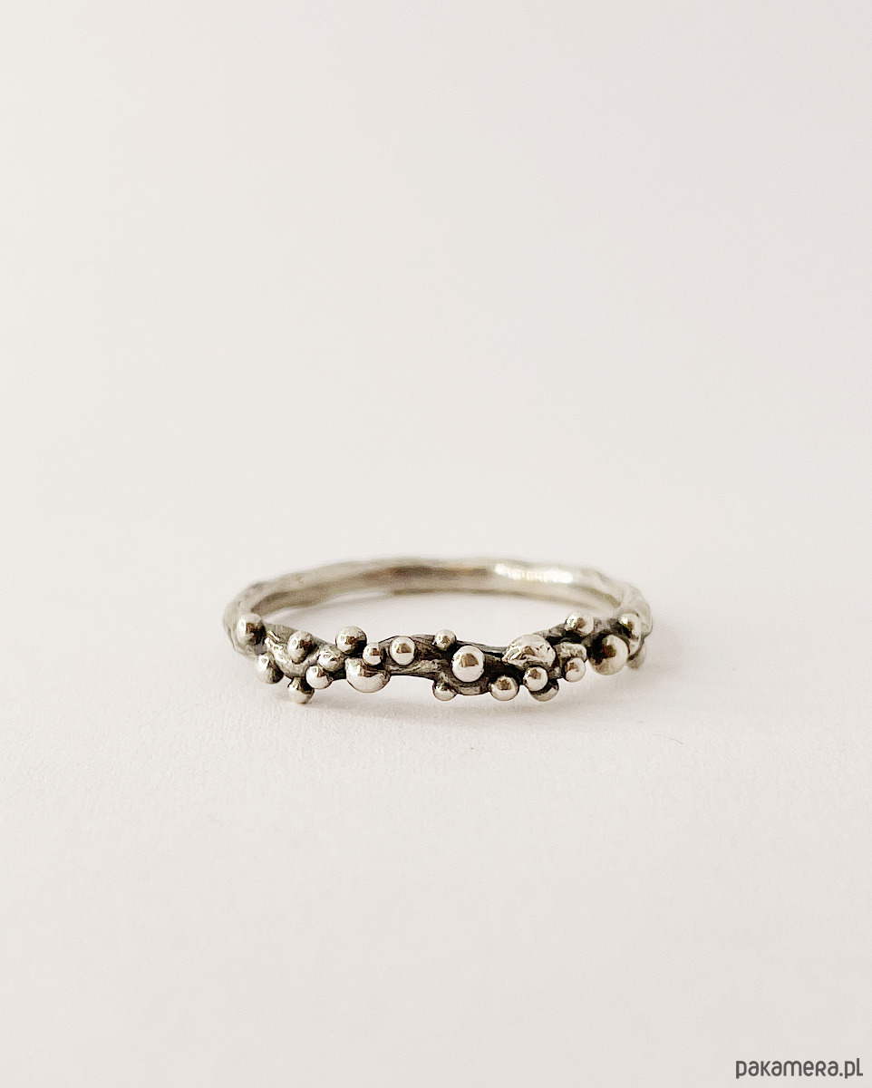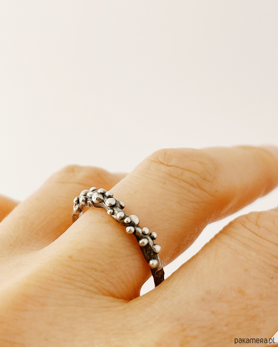 Delikatny pierścionek o organicznej, swobodnej formie, ozdobiony srebrnymi kropelkami.