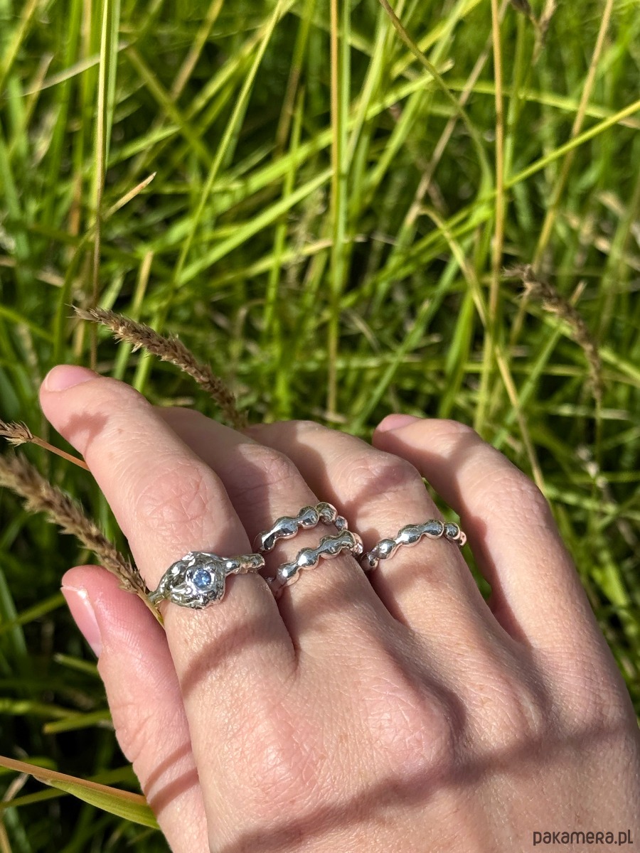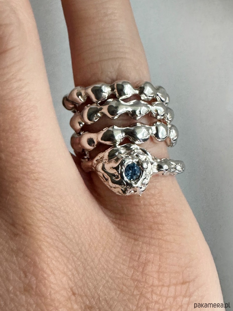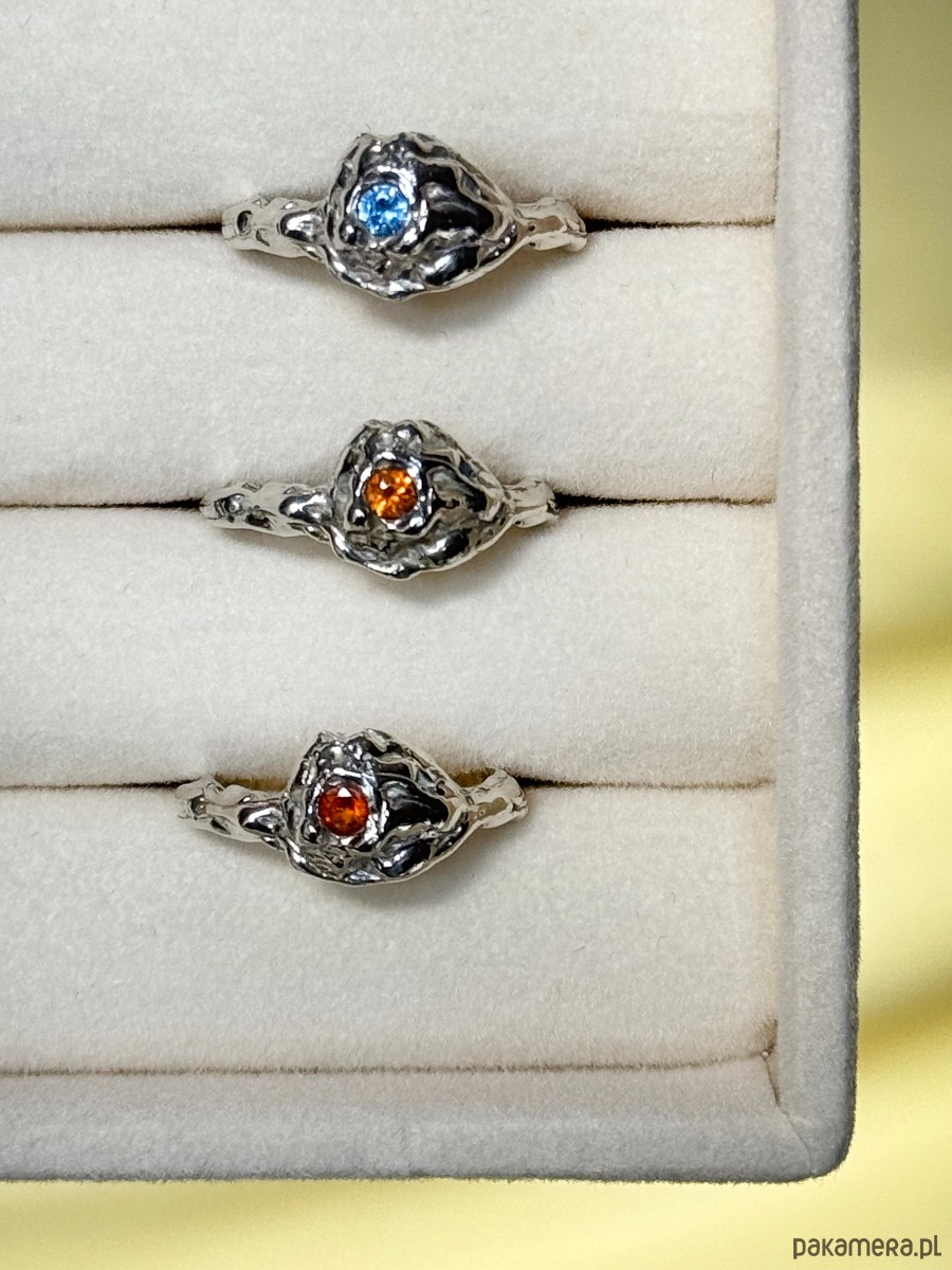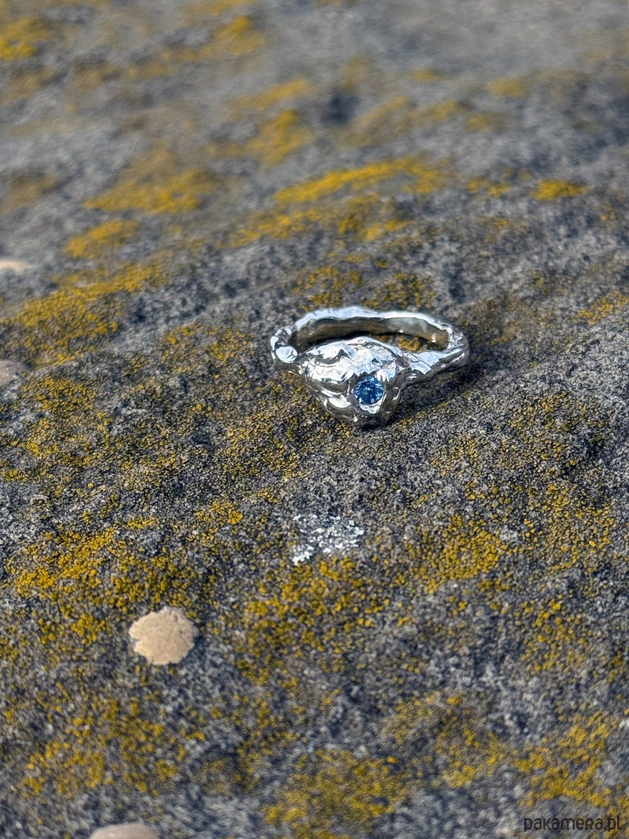 Pierścionek Figa wykonany ze srebra 925 i ozdobiony topazem niebieskim.