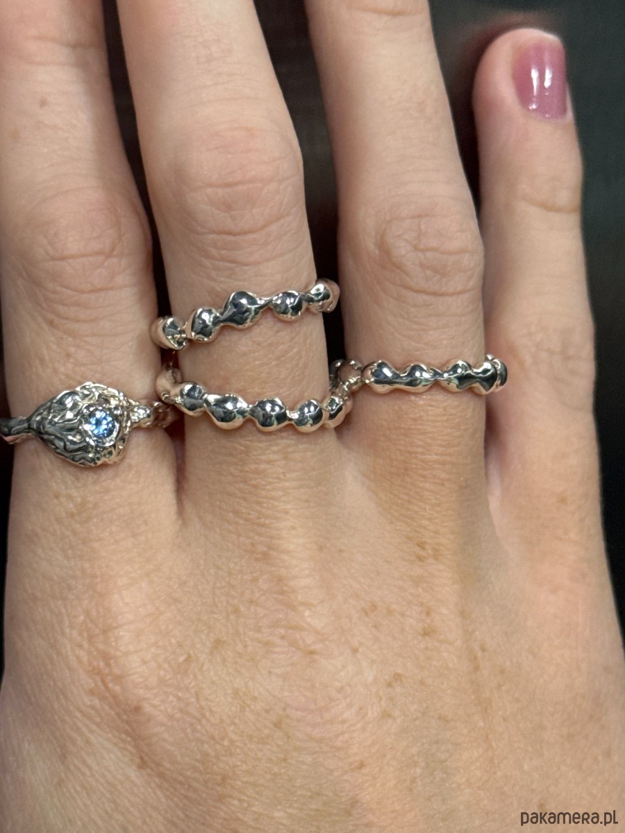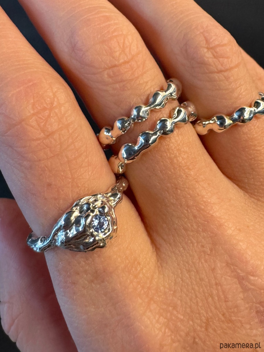Ręcznie wyrzeźbiony w wosku jubilerskim, odlany w srebrze, wyczyszczony i wypolerowany.