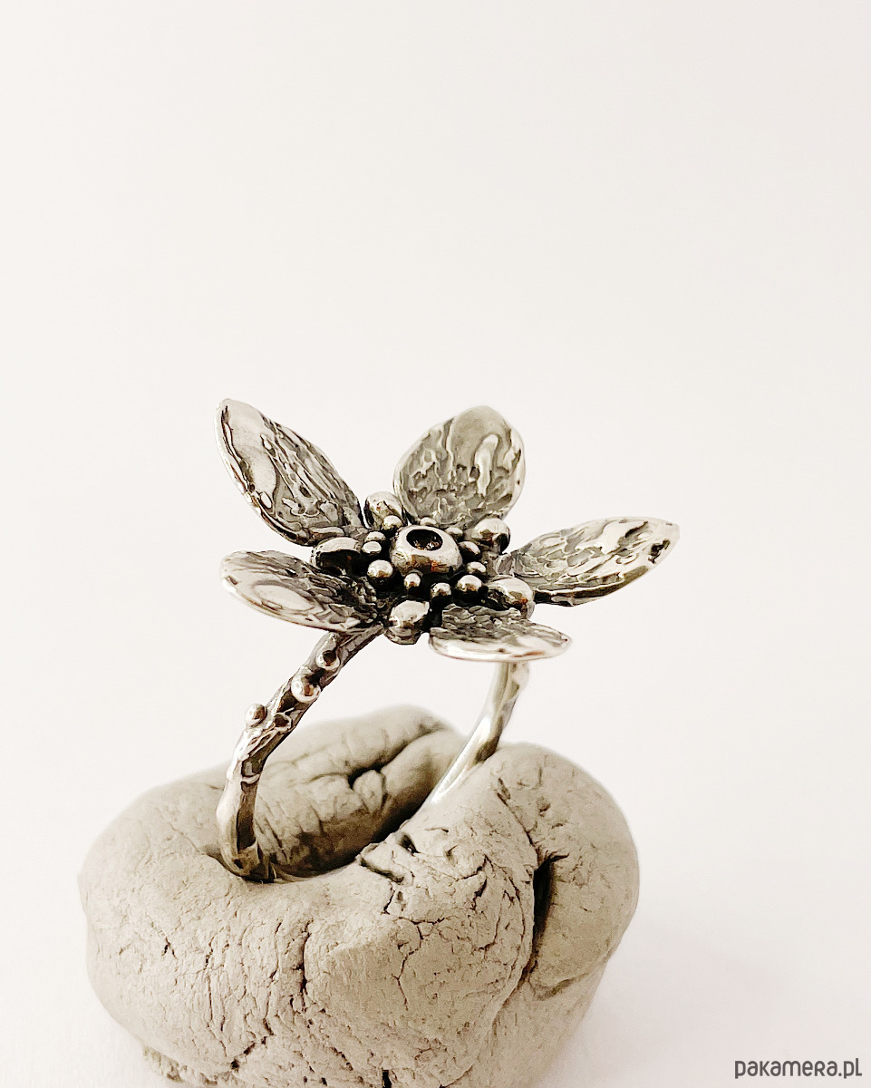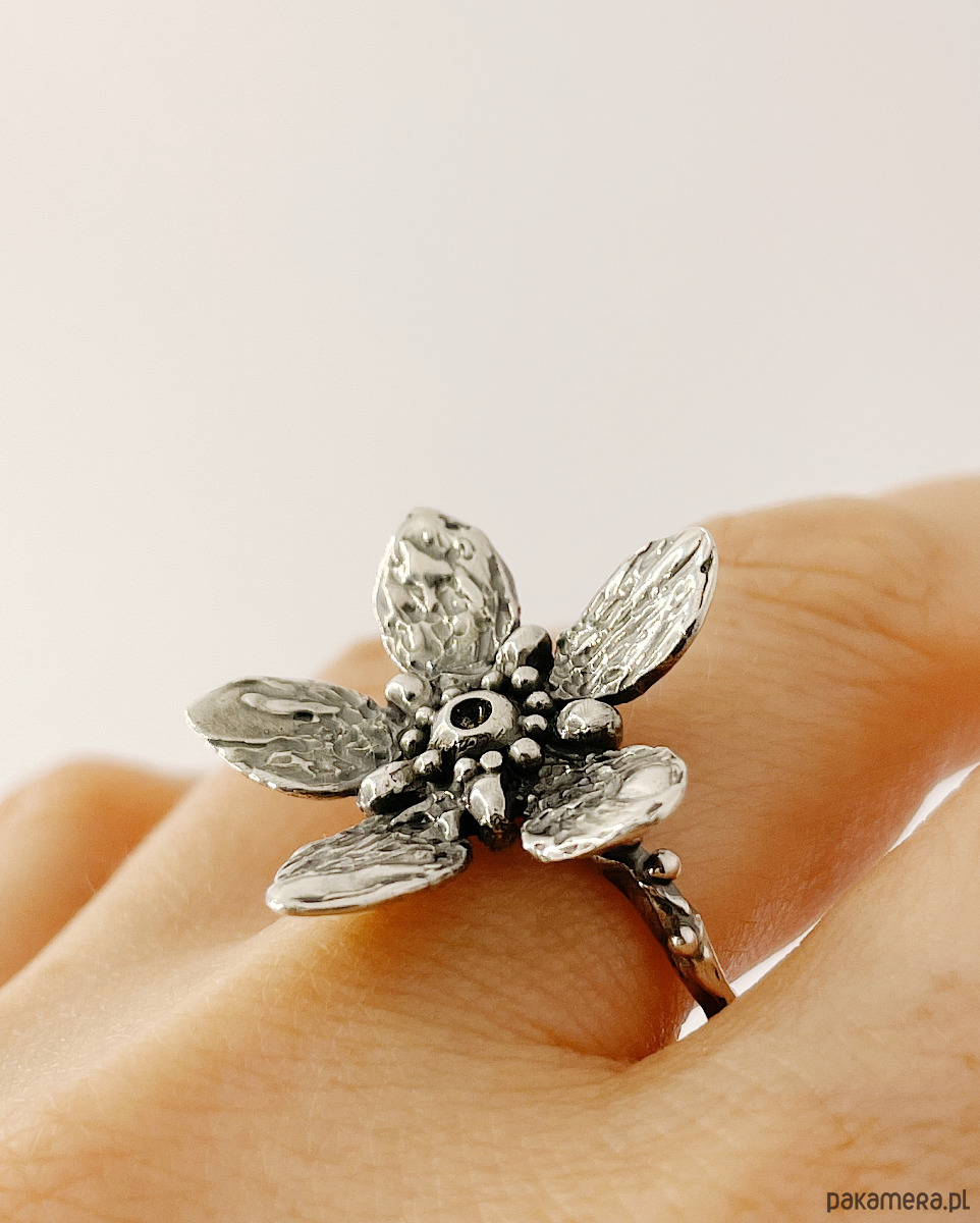 Wyrazisty pierścionek inspirowany kwiatami jaśminu o organicznej formie i mocno zarysowanej fakturze na płatkach. Obrączka ozdobiona srebrnymi kuleczkami.